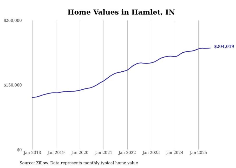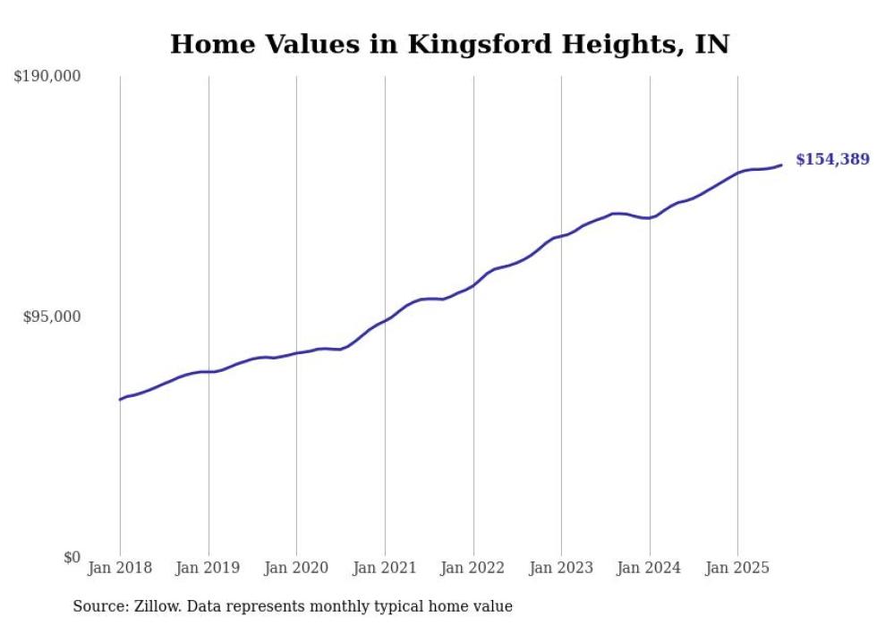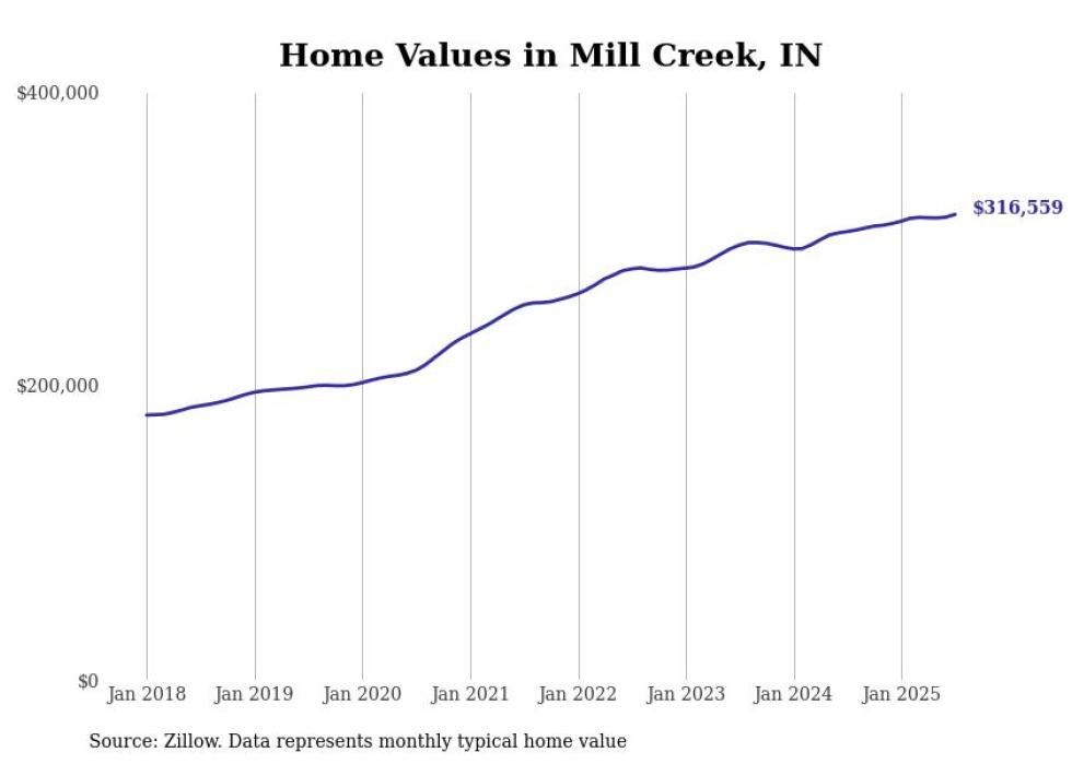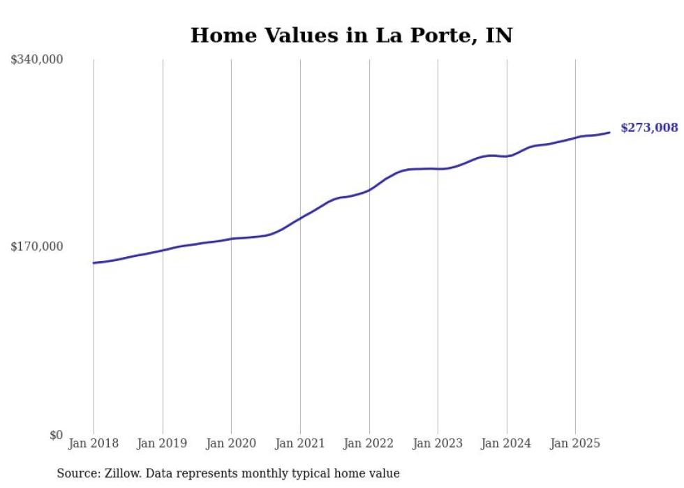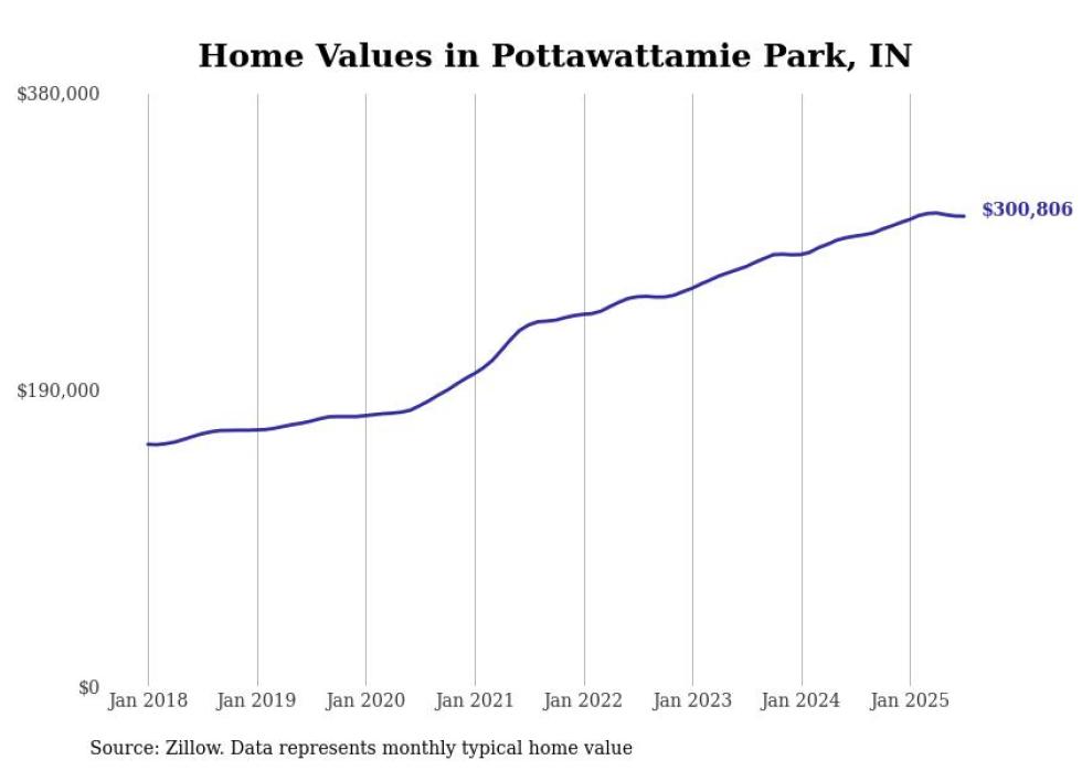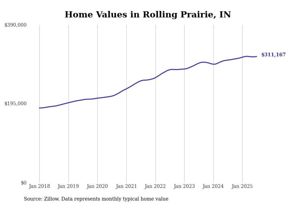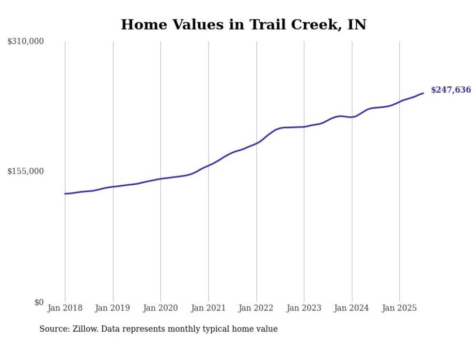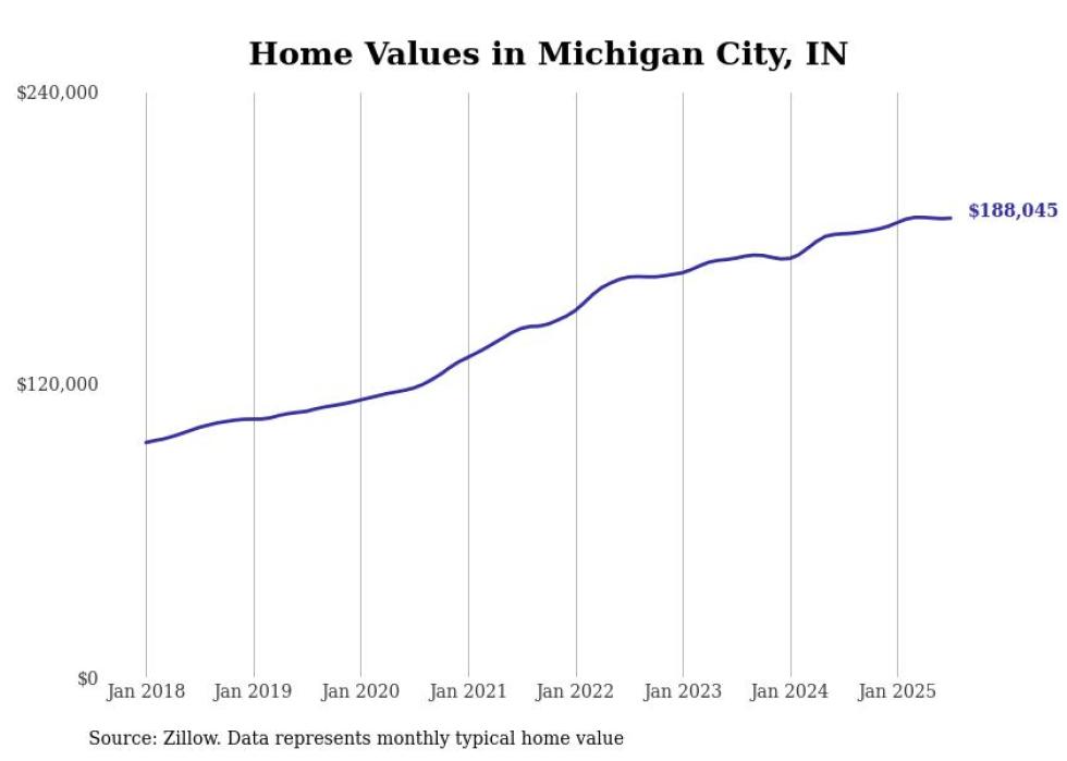 Stacker compiled a list of cities with the most expensive homes in the Michigan City metro area using data from Zillow. Charts show the monthly typical home value since January 2018. All 15 cities and towns with data available were included in the list.