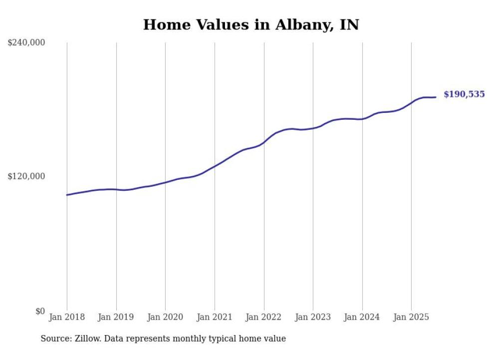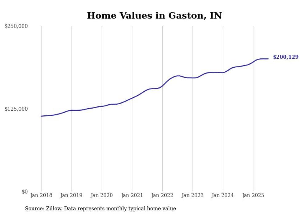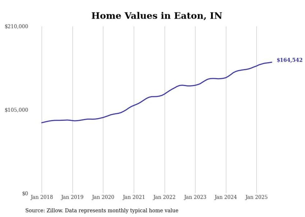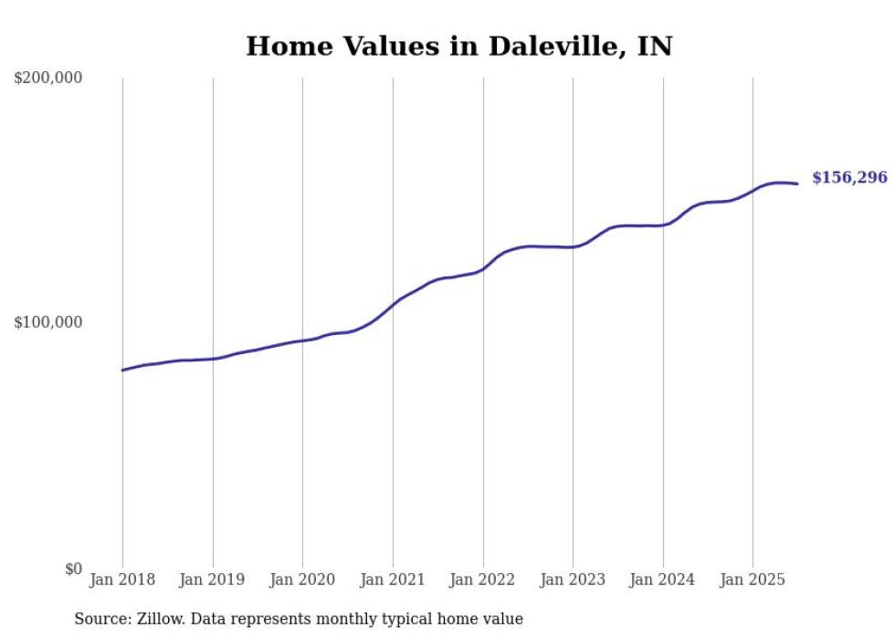 Stacker compiled a list of cities with the most expensive homes in the Muncie metro area using data from Zillow. Charts show the monthly typical home value since January 2018. All 9 cities and towns with data available were included in the list.