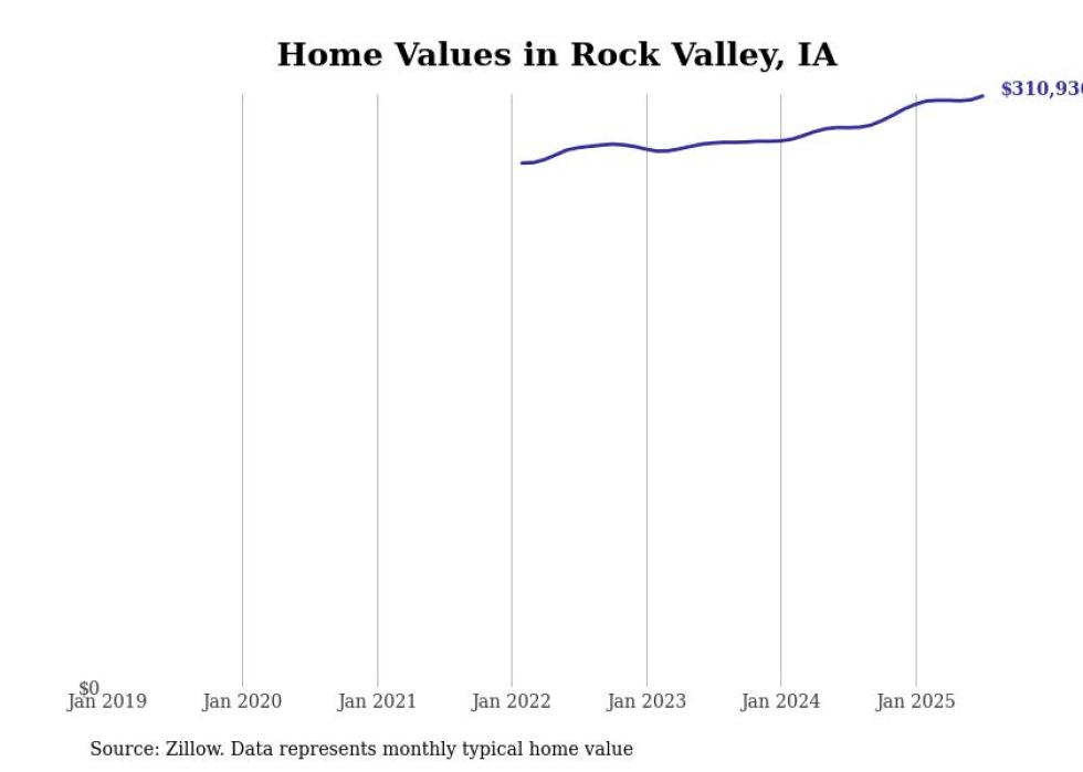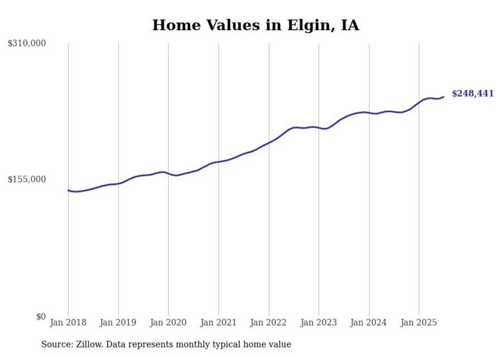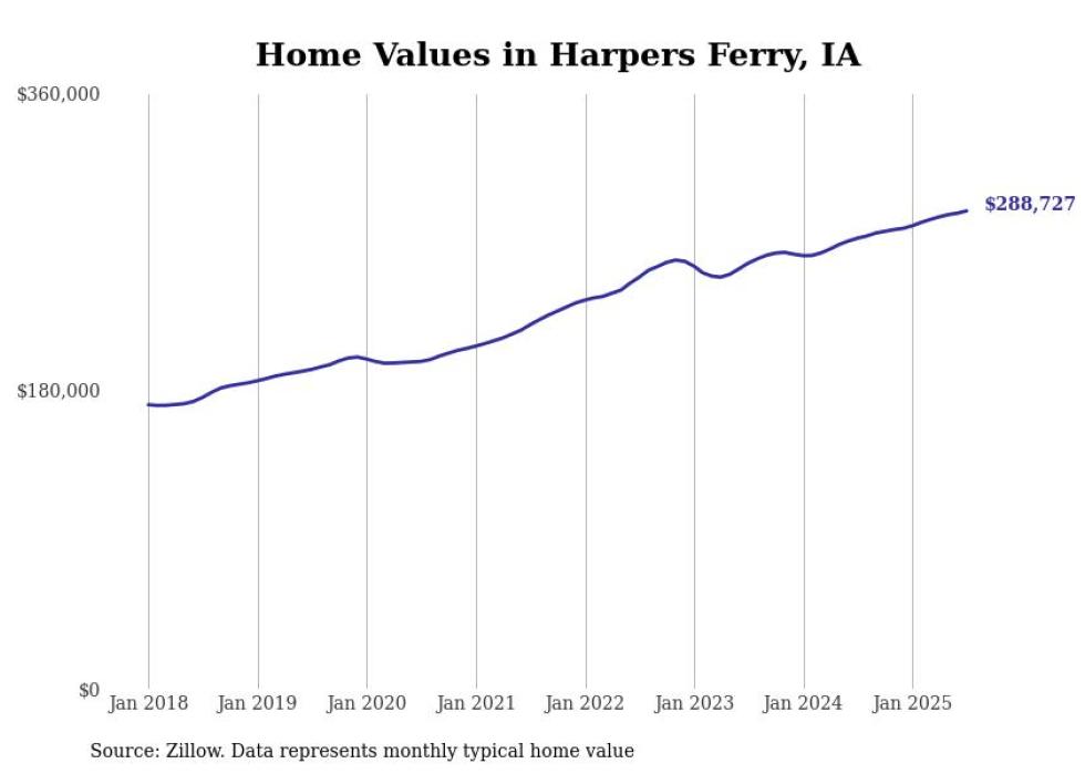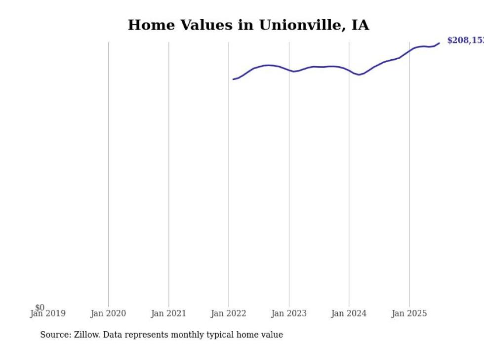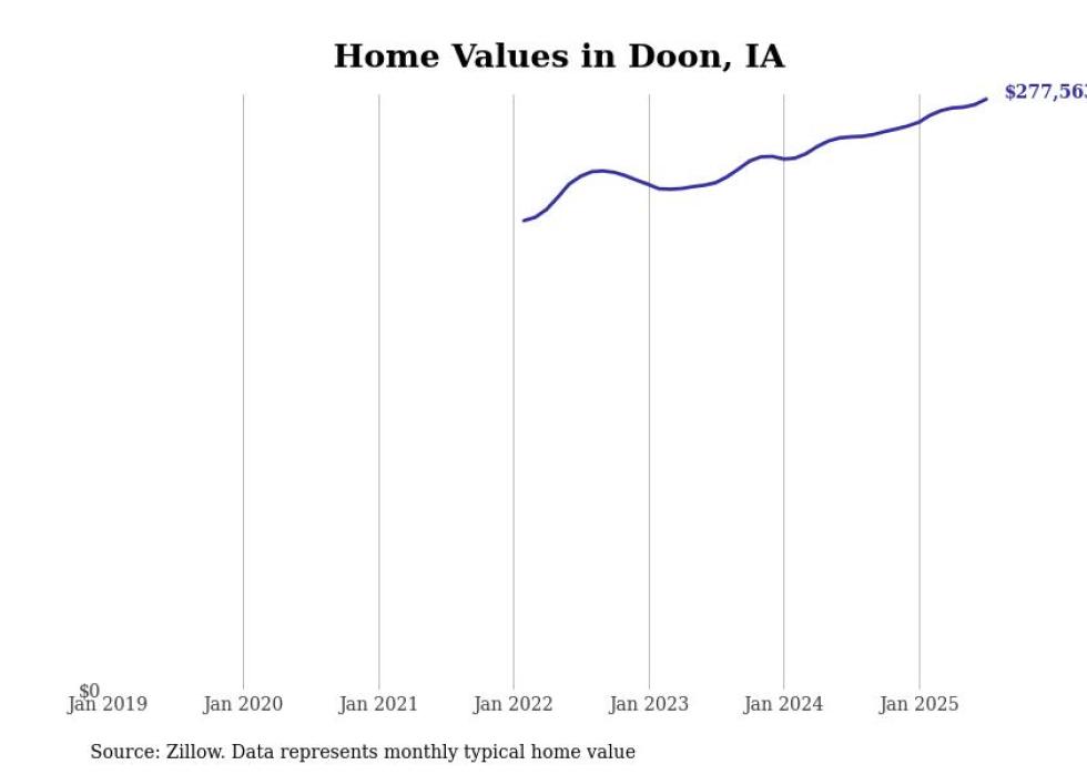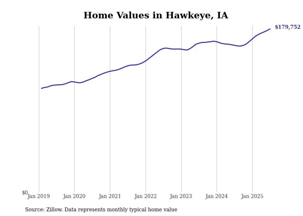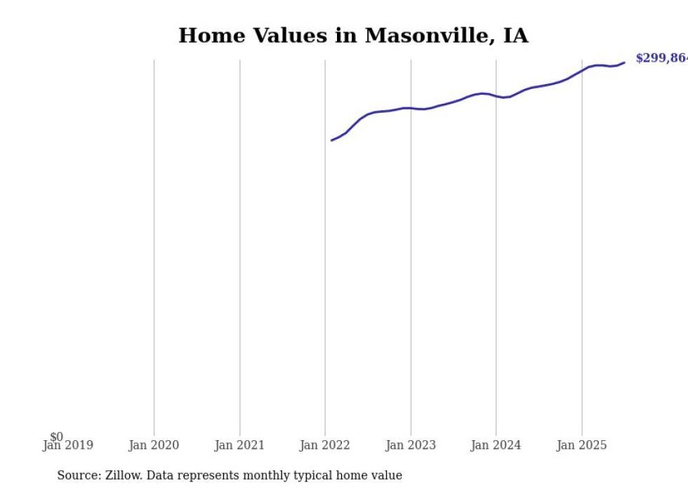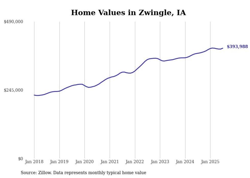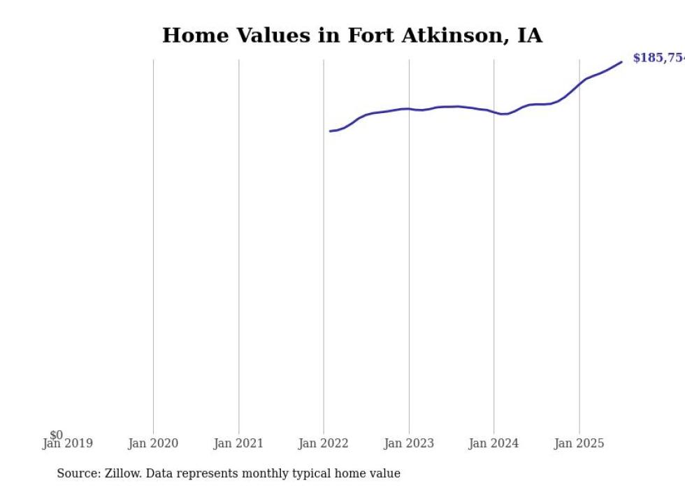 Stacker compiled a list of cities with the fastest-growing home prices in Iowa using data from Zillow. Cities are ranked by the dollar change in the Zillow Home Values Index for all homes from the 12 months ending July 2025. The charts in this story were created automatically using Matplotlib. Data was available for 50 cities and towns in Iowa.