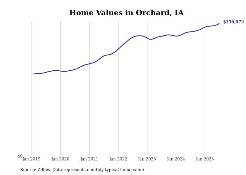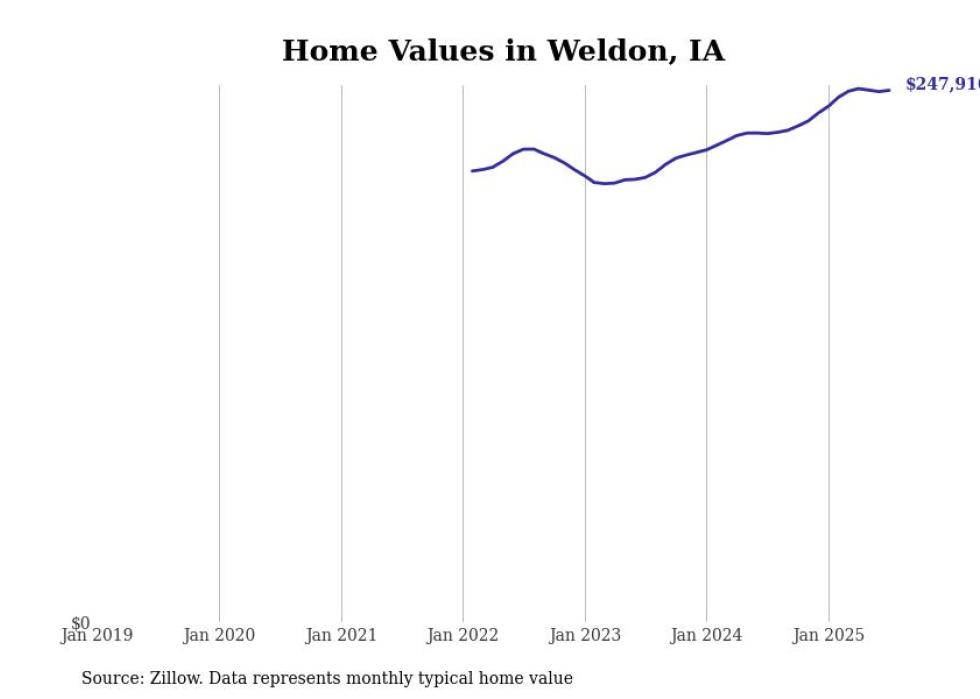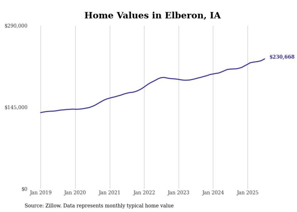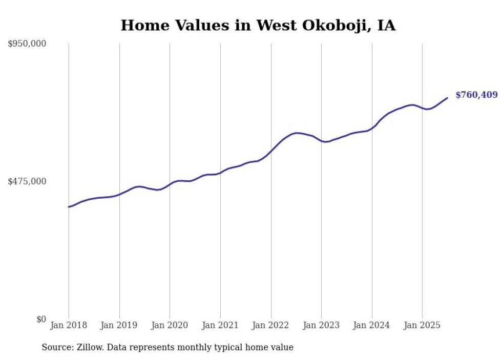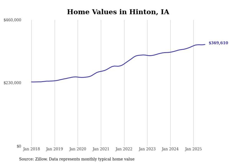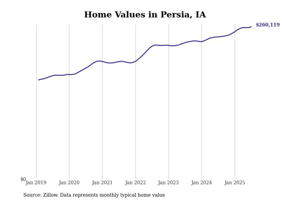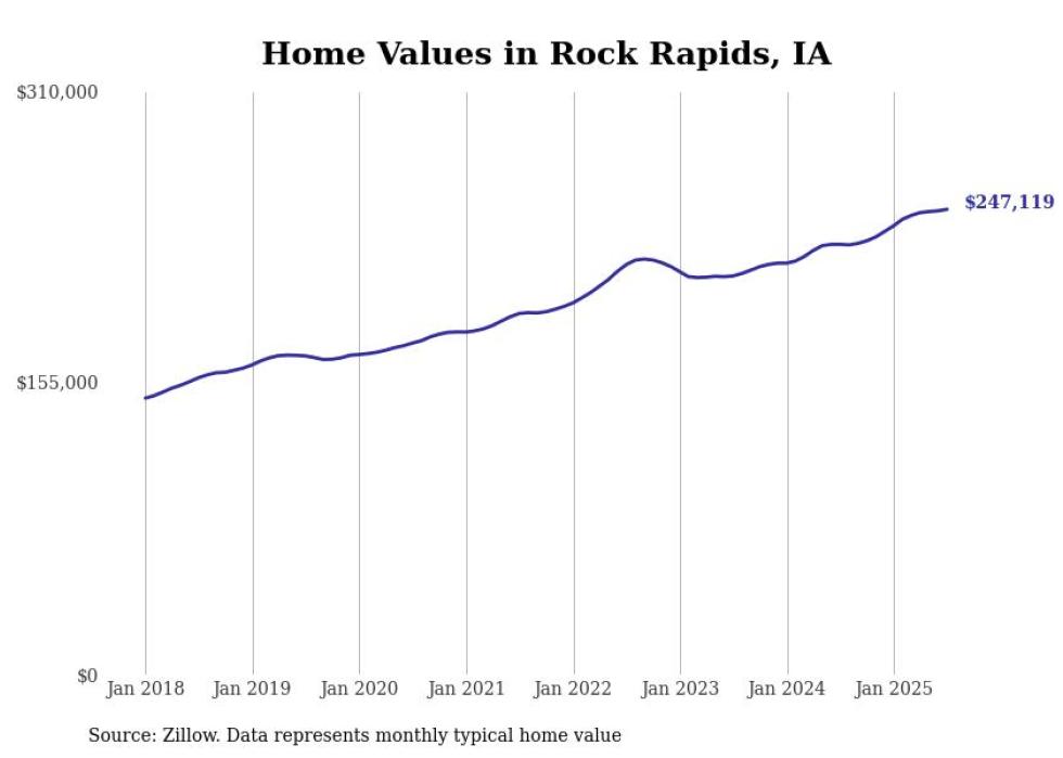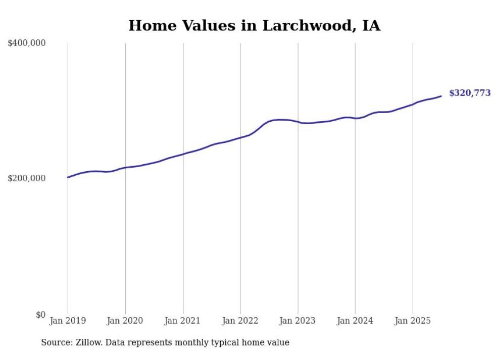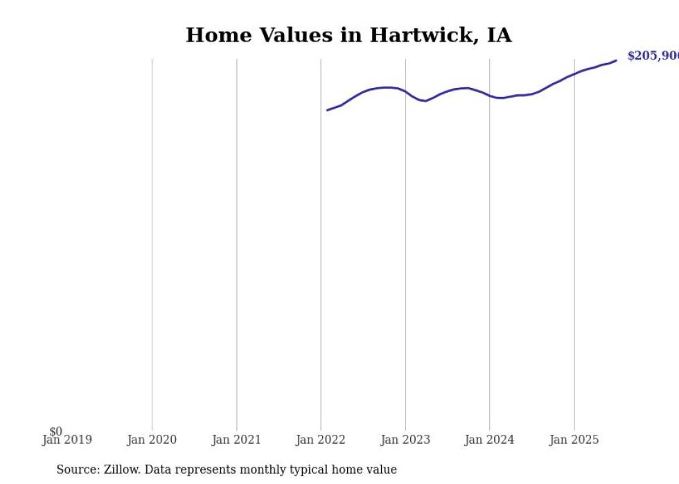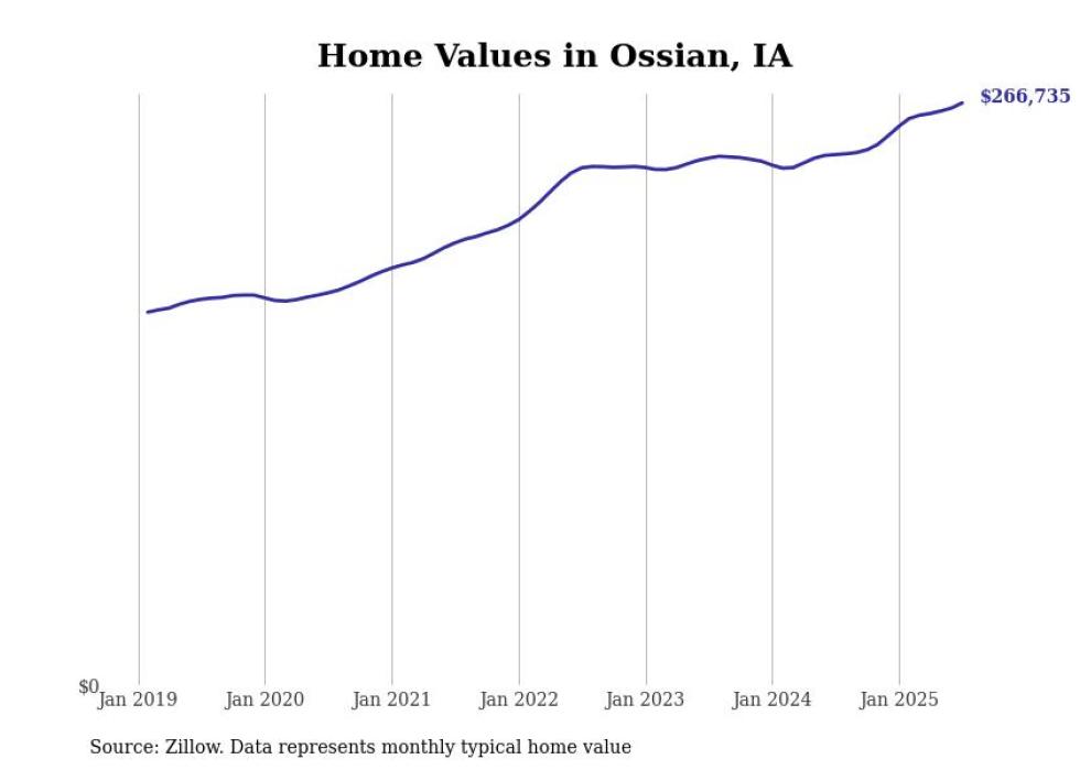 Stacker compiled a list of cities with the fastest-growing home prices in Iowa using data from Zillow. Cities are ranked by the dollar change in the Zillow Home Values Index for all homes from the 12 months ending July 2025. The charts in this story were created automatically using Matplotlib. Data was available for 50 cities and towns in Iowa.