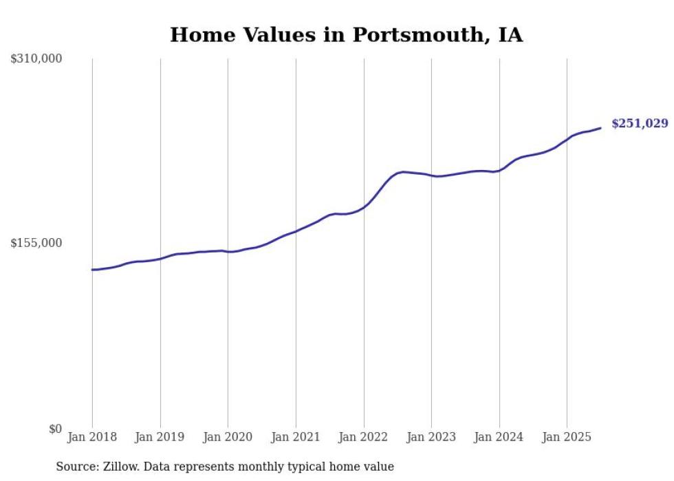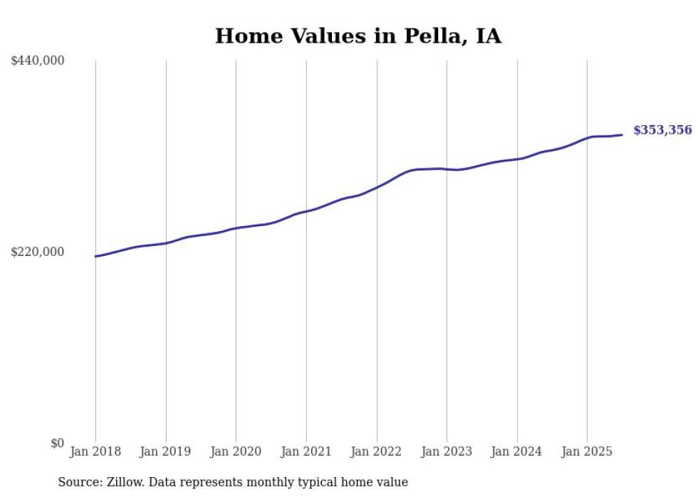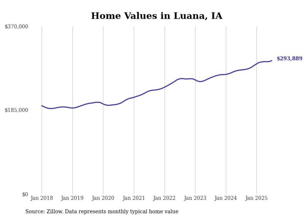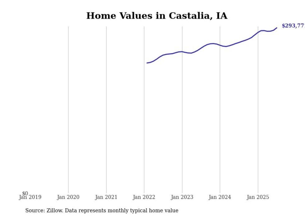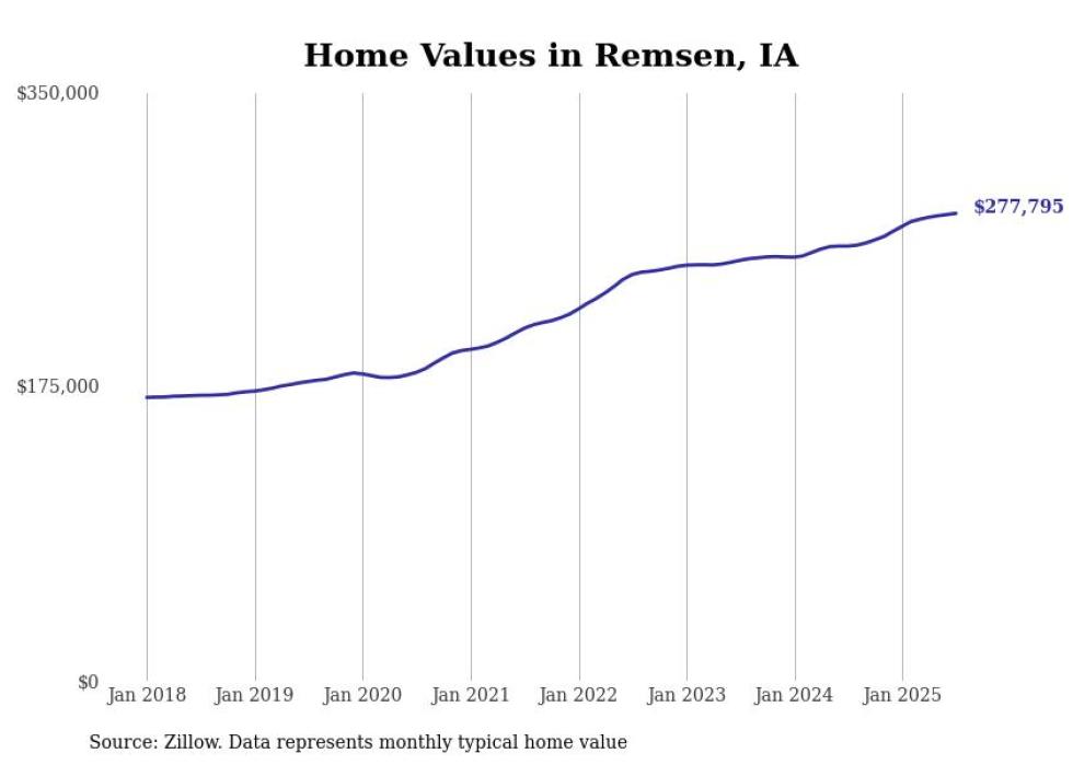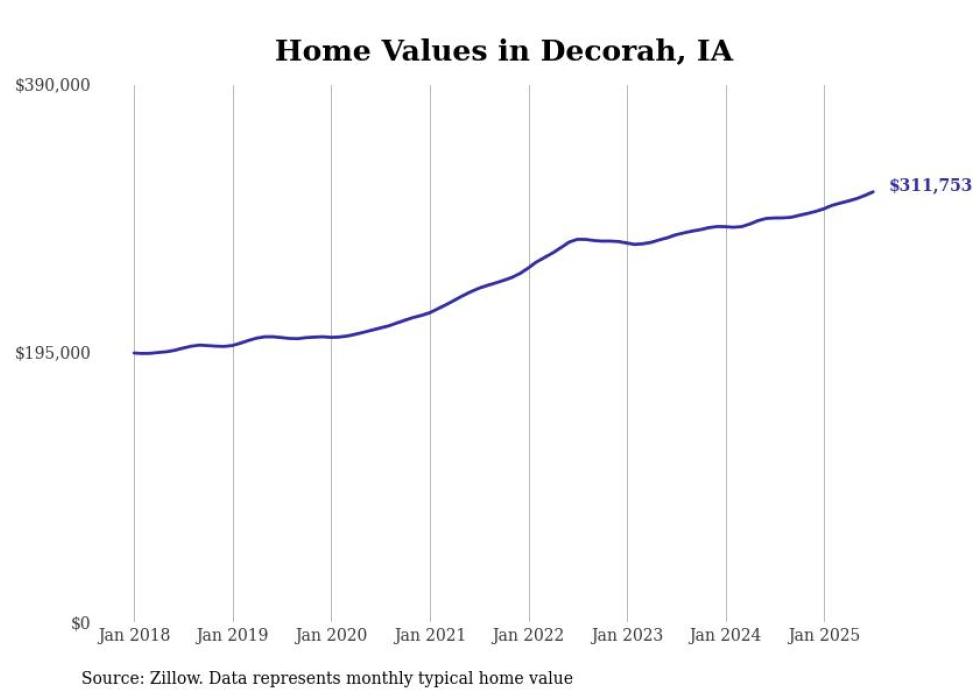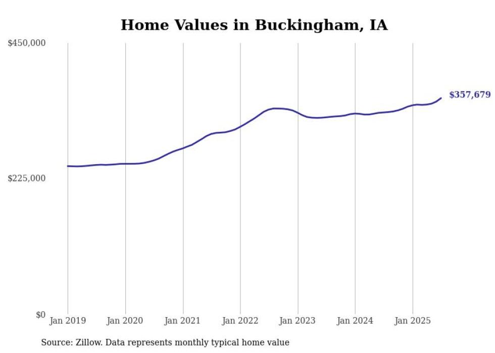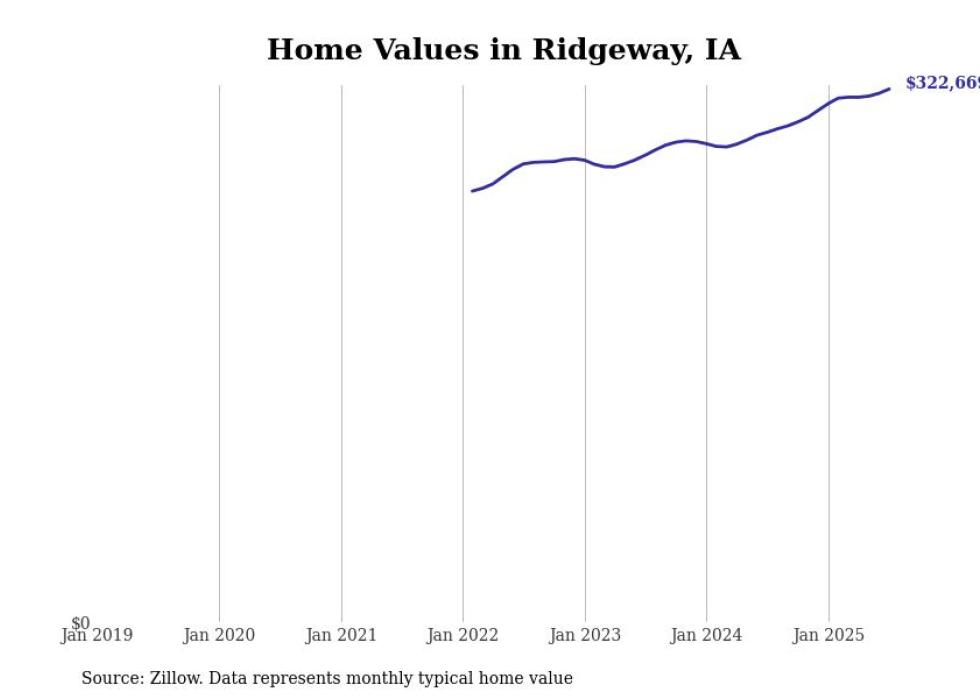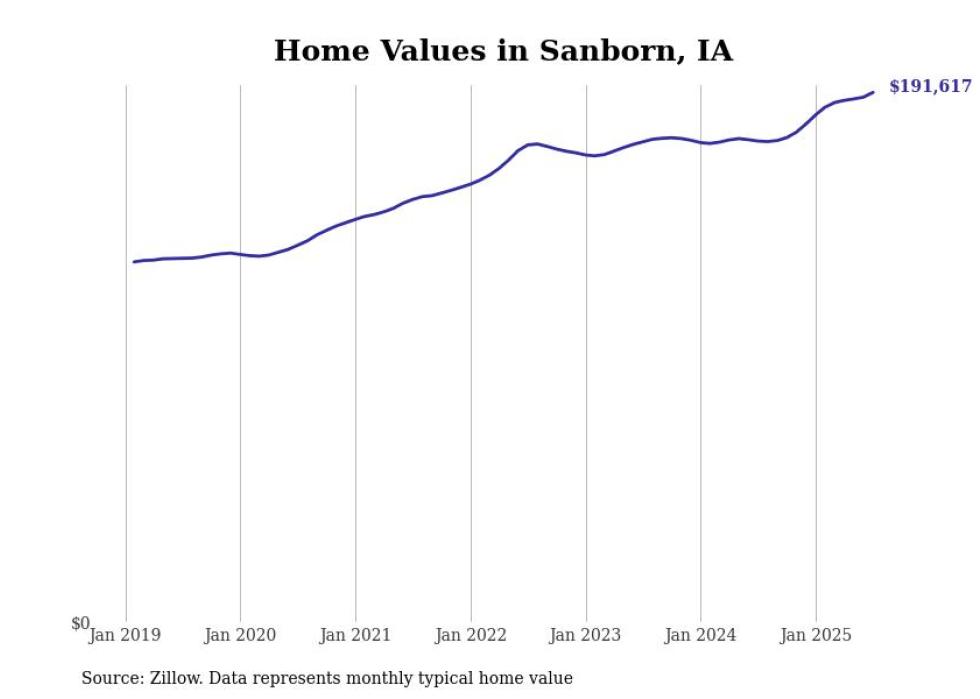 Stacker compiled a list of cities with the fastest-growing home prices in Iowa using data from Zillow. Cities are ranked by the dollar change in the Zillow Home Values Index for all homes from the 12 months ending July 2025. The charts in this story were created automatically using Matplotlib. Data was available for 50 cities and towns in Iowa.