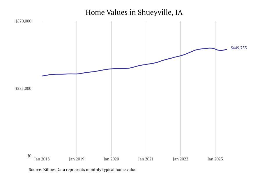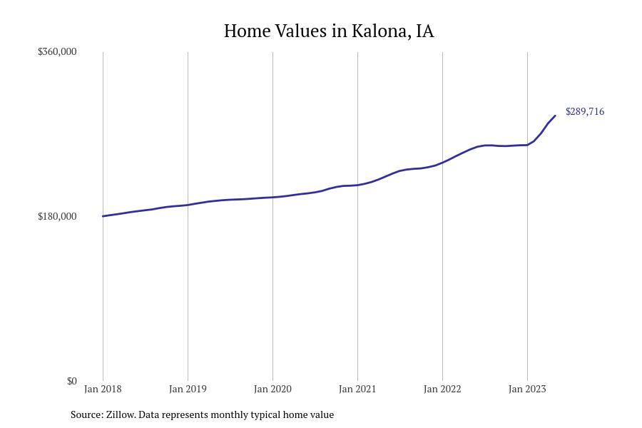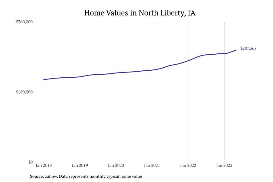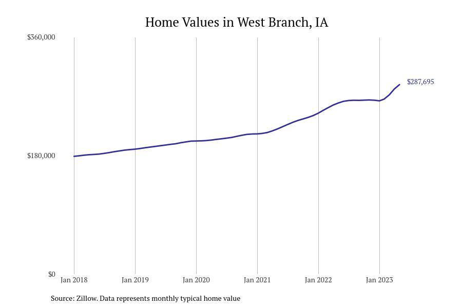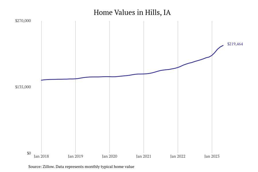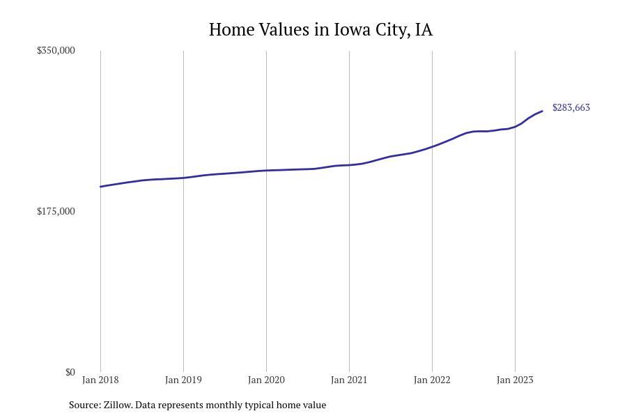 Stacker compiled a list of cities with the fastest-growing home prices in the Iowa City, IA metro area using data from Zillow. Cities are ranked by 1-year price change as of May 2023. The typical home value in the United States increased over the last year by 0.9% to $346,856. All 21 cities and towns with data available were included in the list.