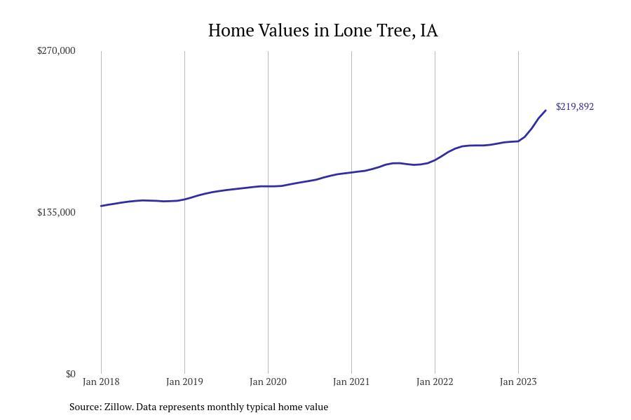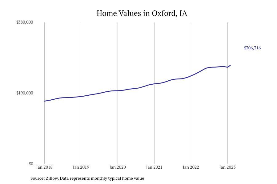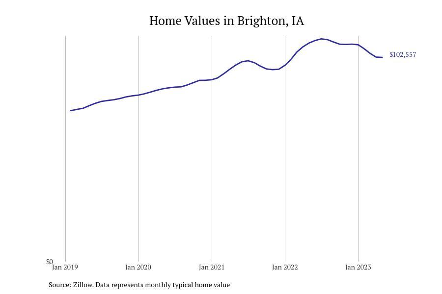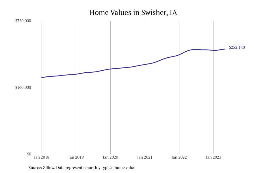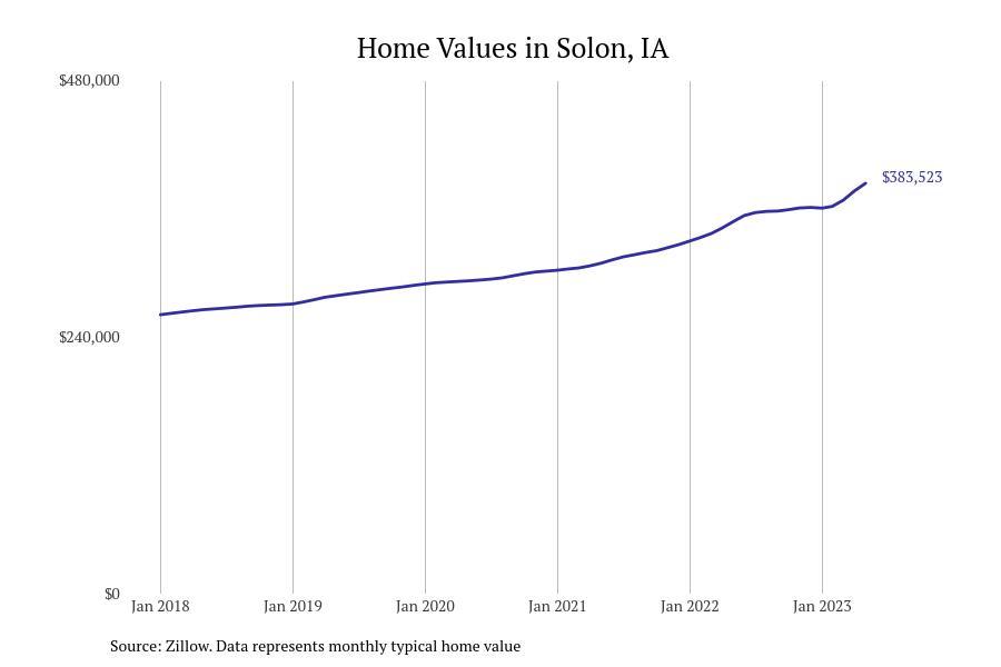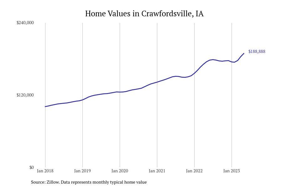 Stacker compiled a list of cities with the fastest-growing home prices in the Iowa City, IA metro area using data from Zillow. Cities are ranked by 1-year price change as of May 2023. The typical home value in the United States increased over the last year by 0.9% to $346,856. All 21 cities and towns with data available were included in the list.