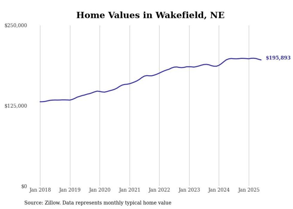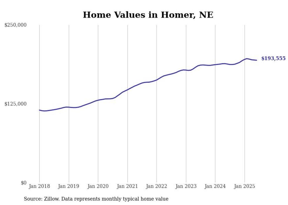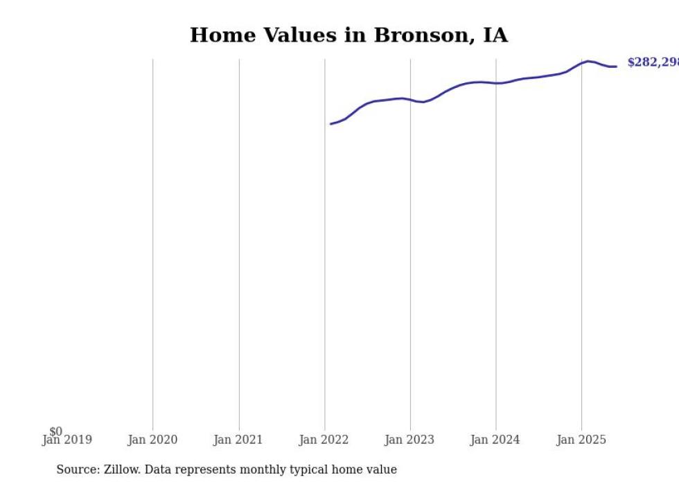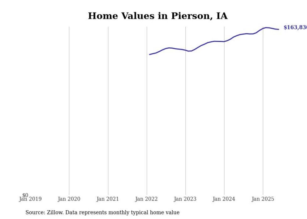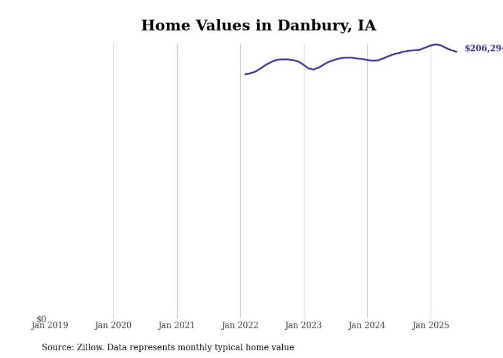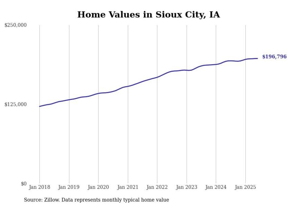 Stacker compiled a list of cities with the most expensive homes in the Sioux City, IA-NE-SD metro area using data from Zillow. Charts show the monthly typical home value since January 2018.