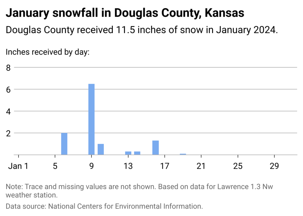 To recap January's weather ahead of what's predicted to be a less cold February, Stacker used data from the National Centers for Environmental Information to break down how much snow Douglas County, Kansas received in January, highlighting the snowiest day of the month and how this year's January temperatures compare to years past.