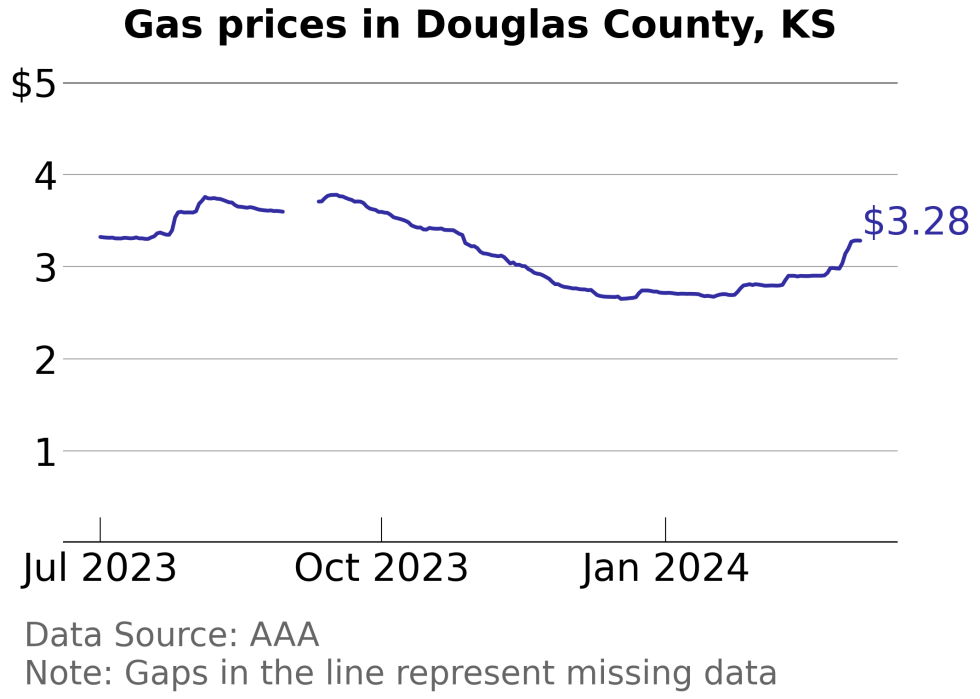 Stacker compiled statistics on gas prices in Douglas County using data from AAA. Gas prices are current as of March 11.