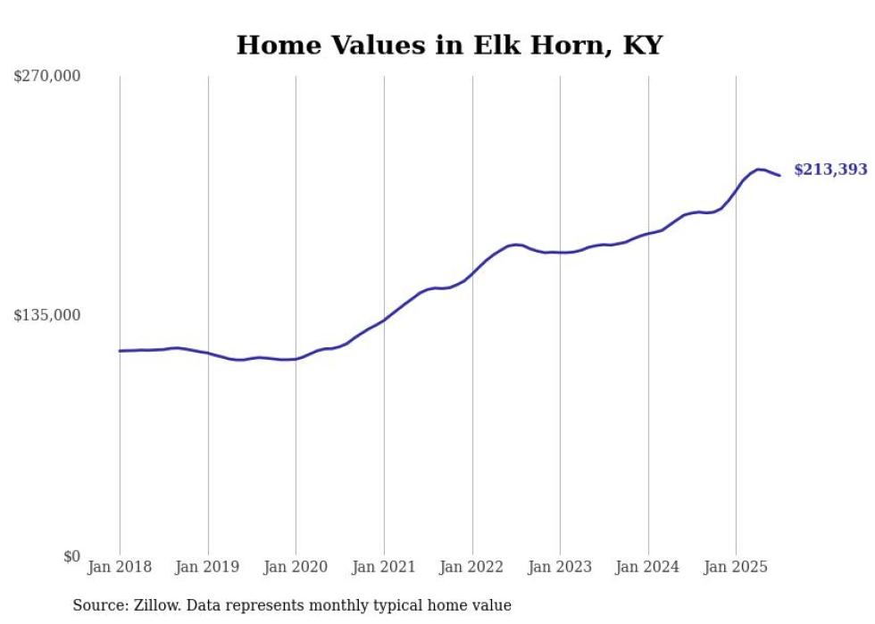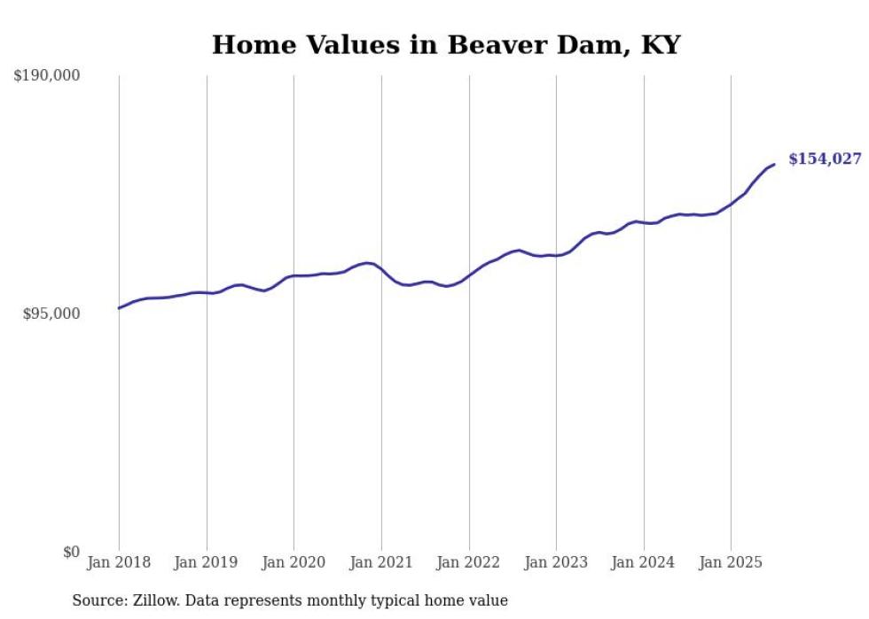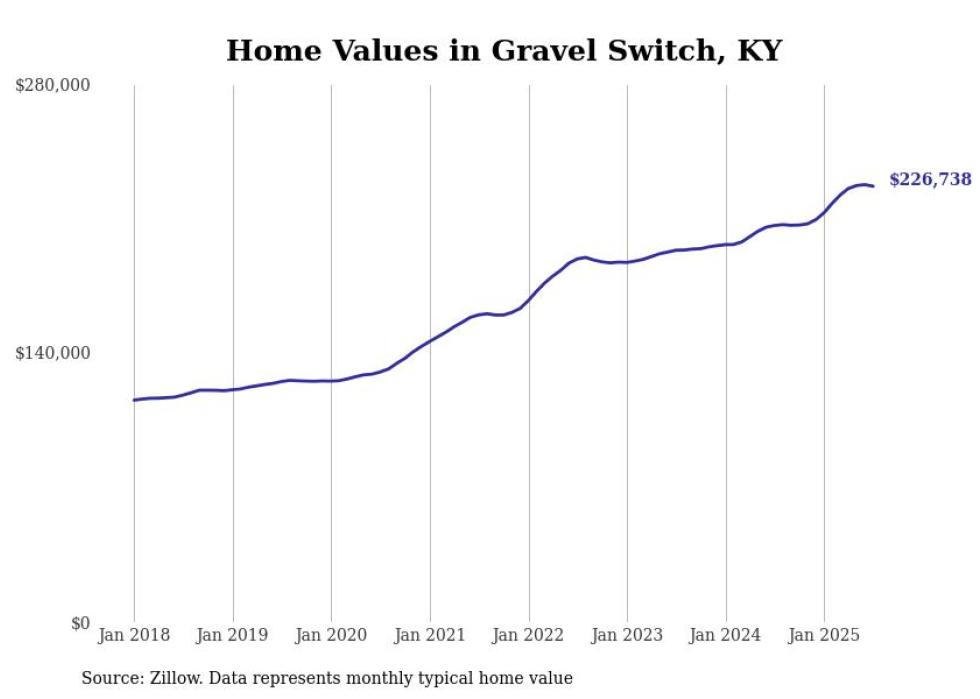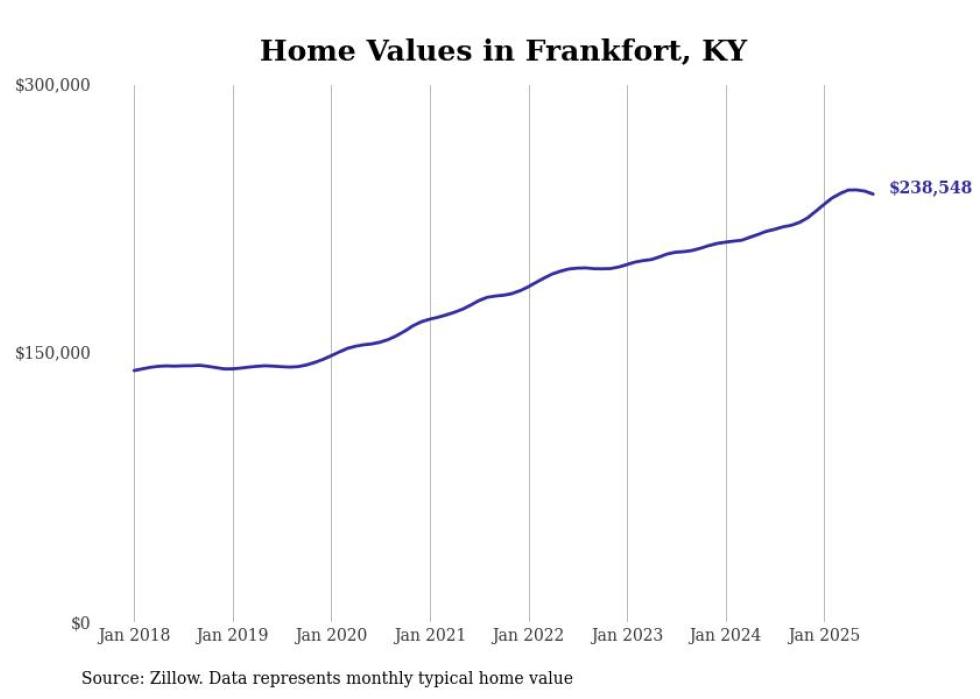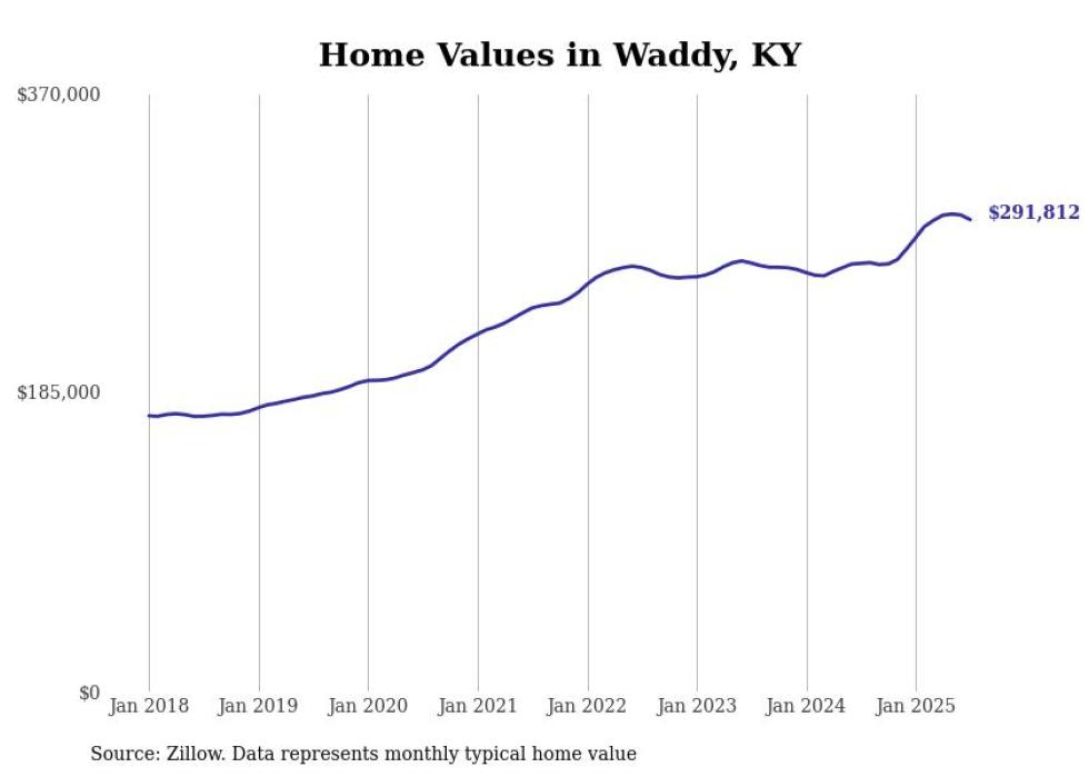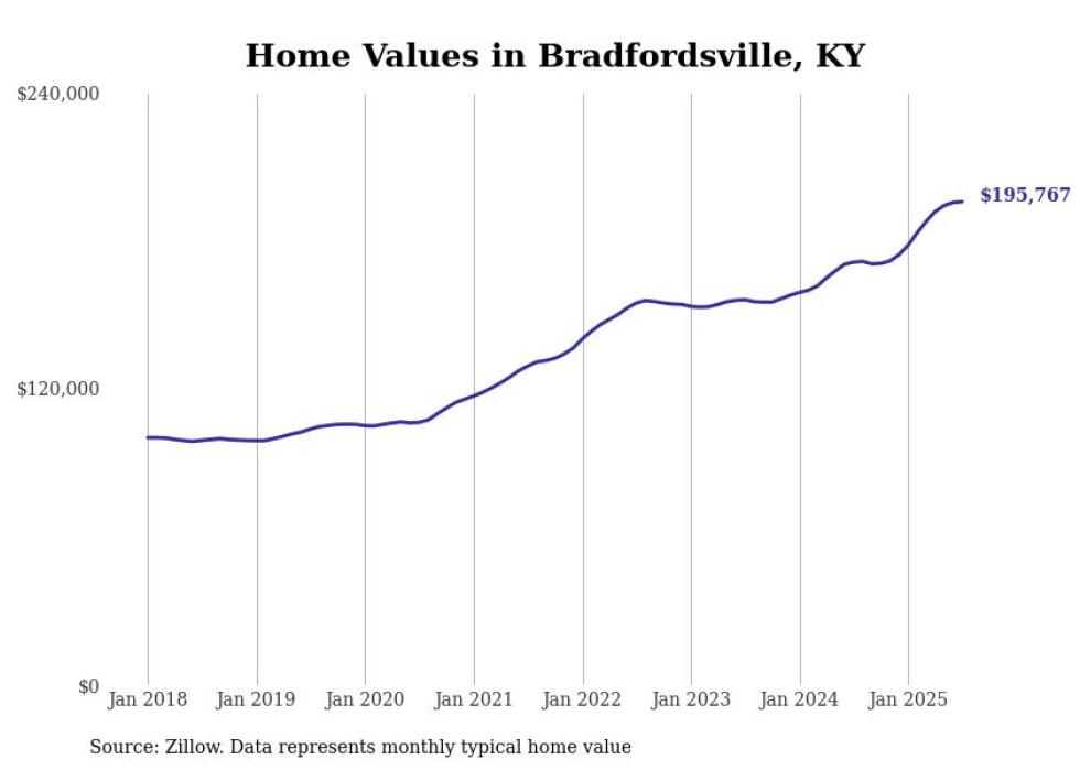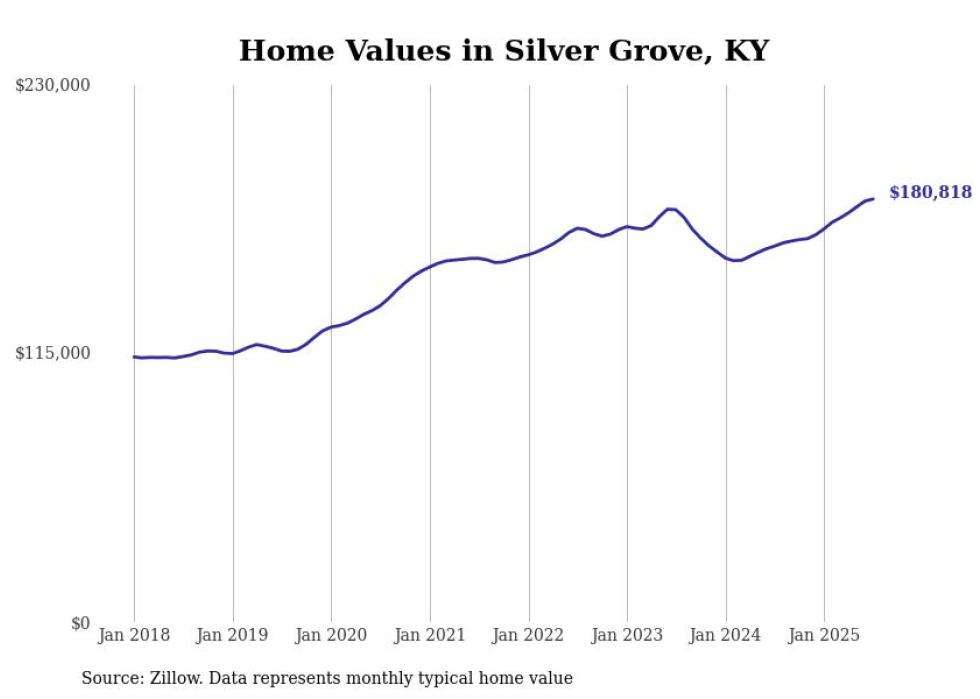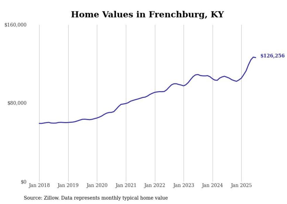 Stacker compiled a list of cities with the fastest-growing home prices in Kentucky using data from Zillow. Cities are ranked by the dollar change in the Zillow Home Values Index for all homes from the 12 months ending July 2025. The charts in this story were created automatically using Matplotlib. Data was available for 50 cities and towns in Kentucky.