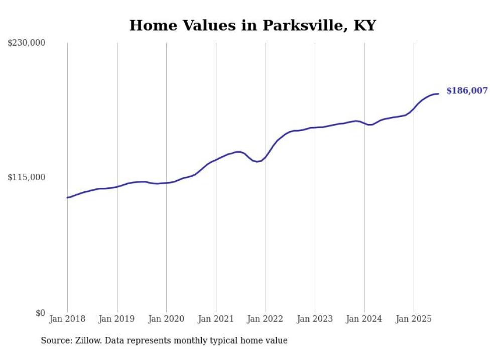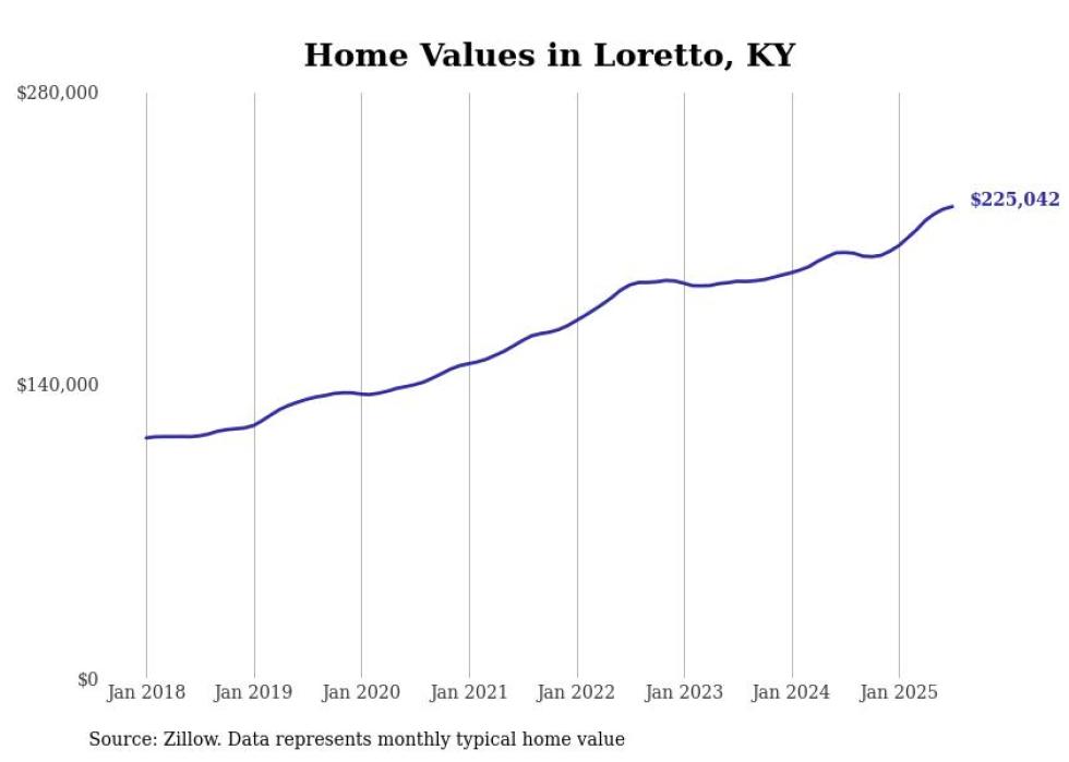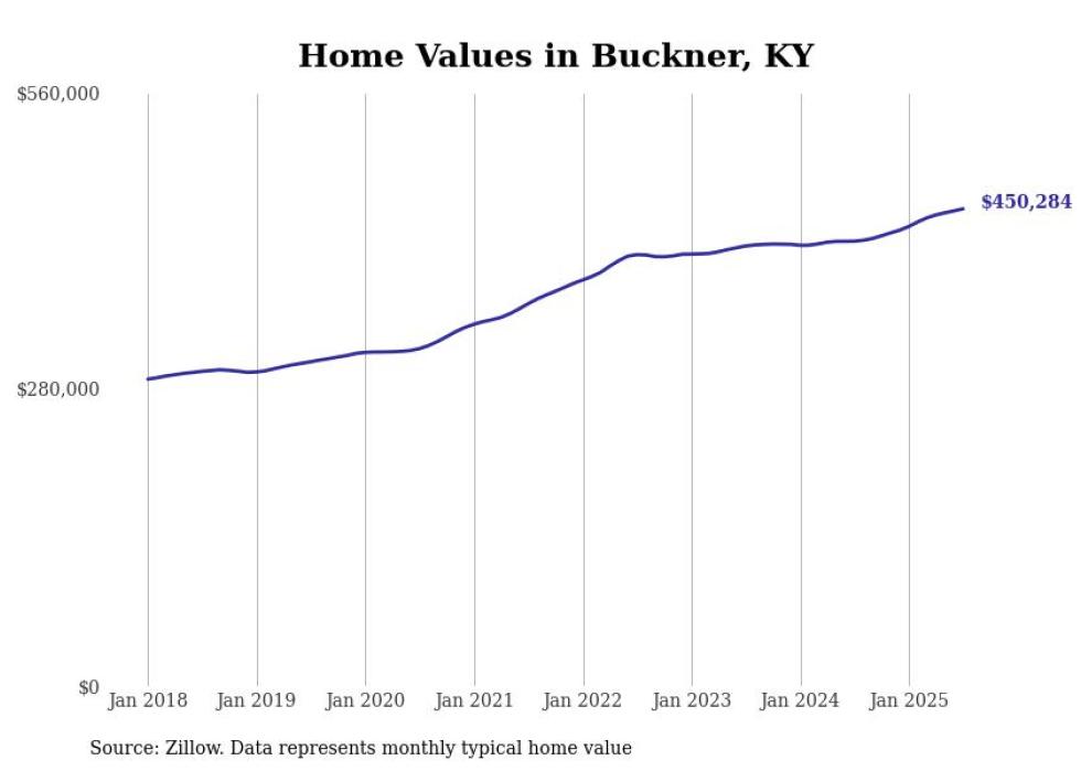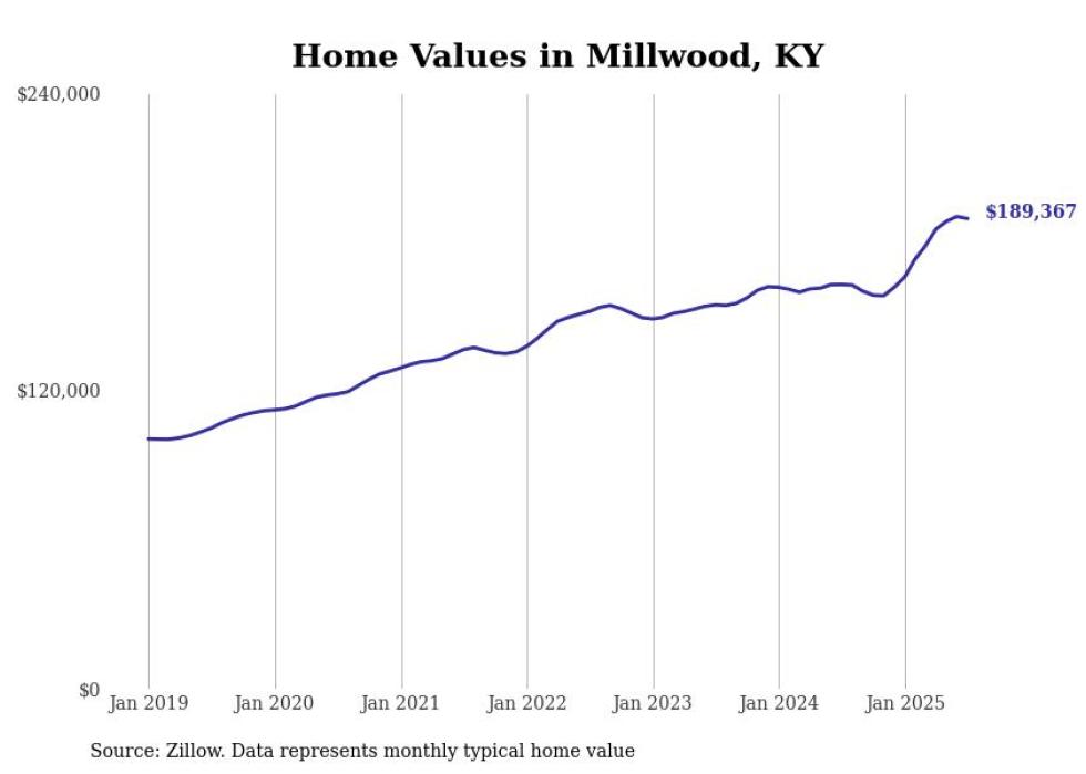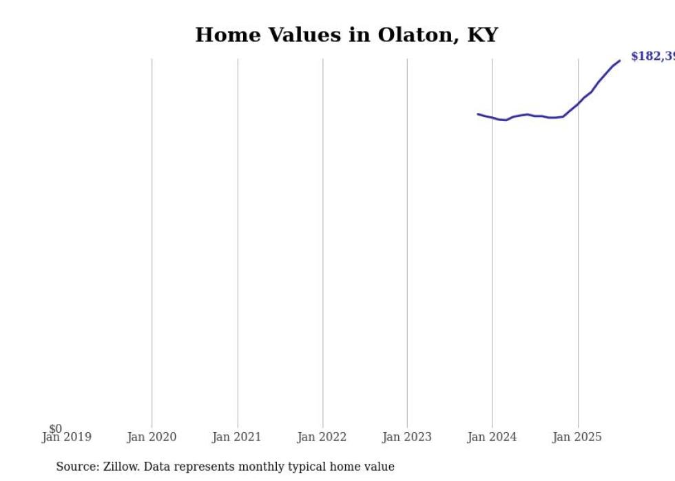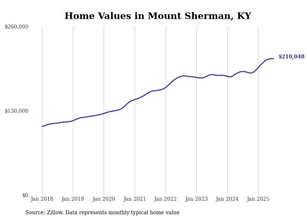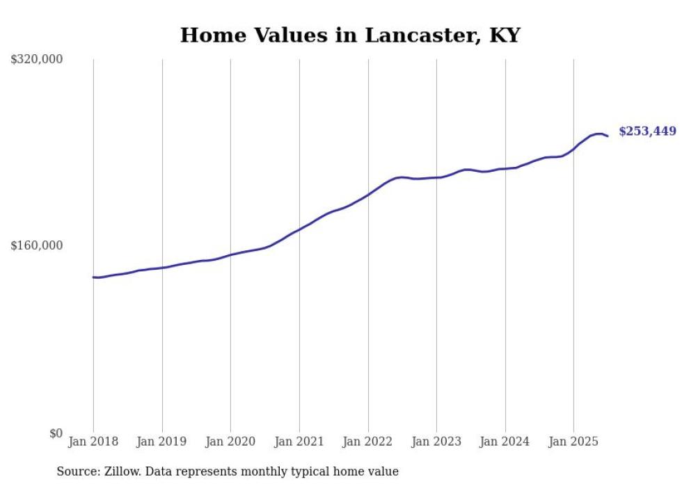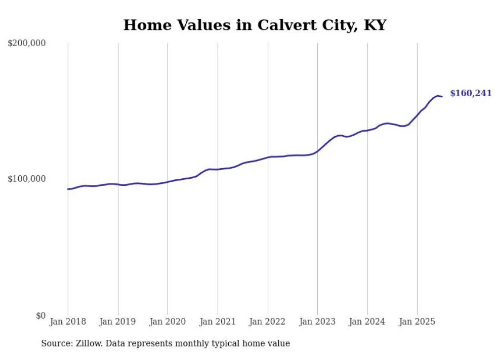 Stacker compiled a list of cities with the fastest-growing home prices in Kentucky using data from Zillow. Cities are ranked by the dollar change in the Zillow Home Values Index for all homes from the 12 months ending July 2025. The charts in this story were created automatically using Matplotlib. Data was available for 50 cities and towns in Kentucky.