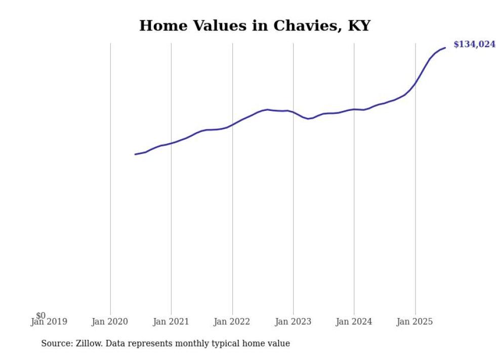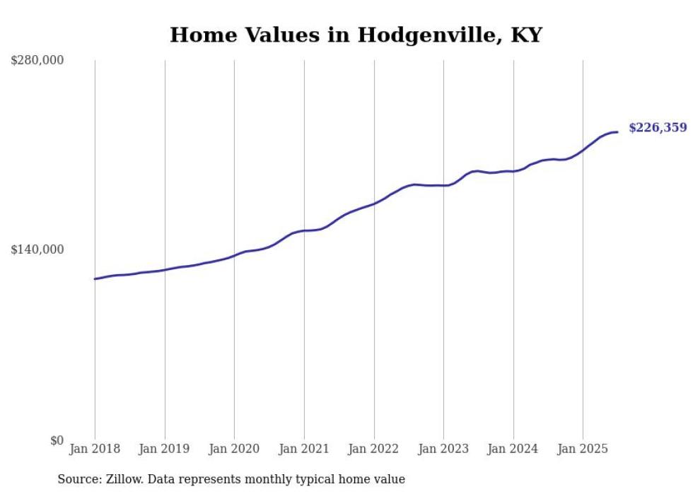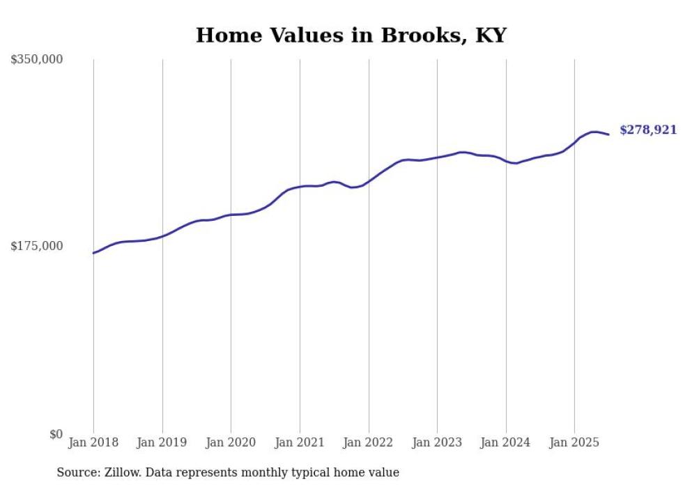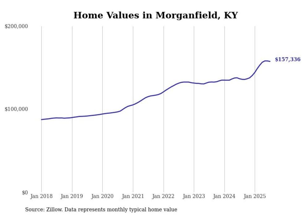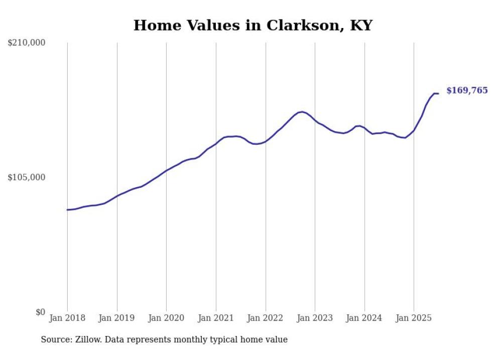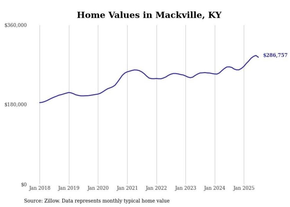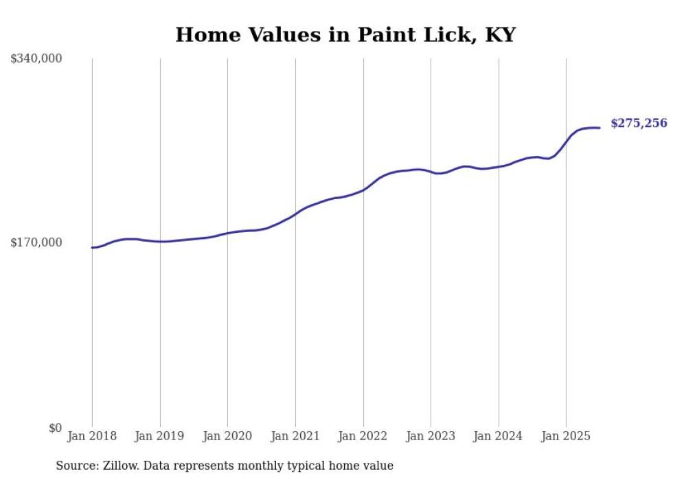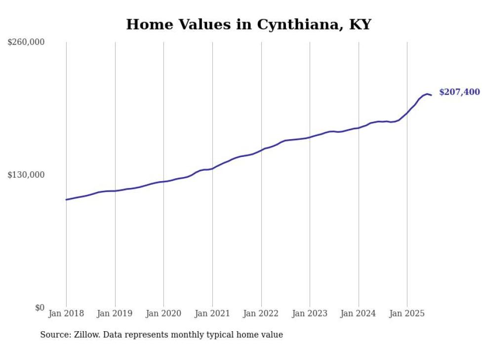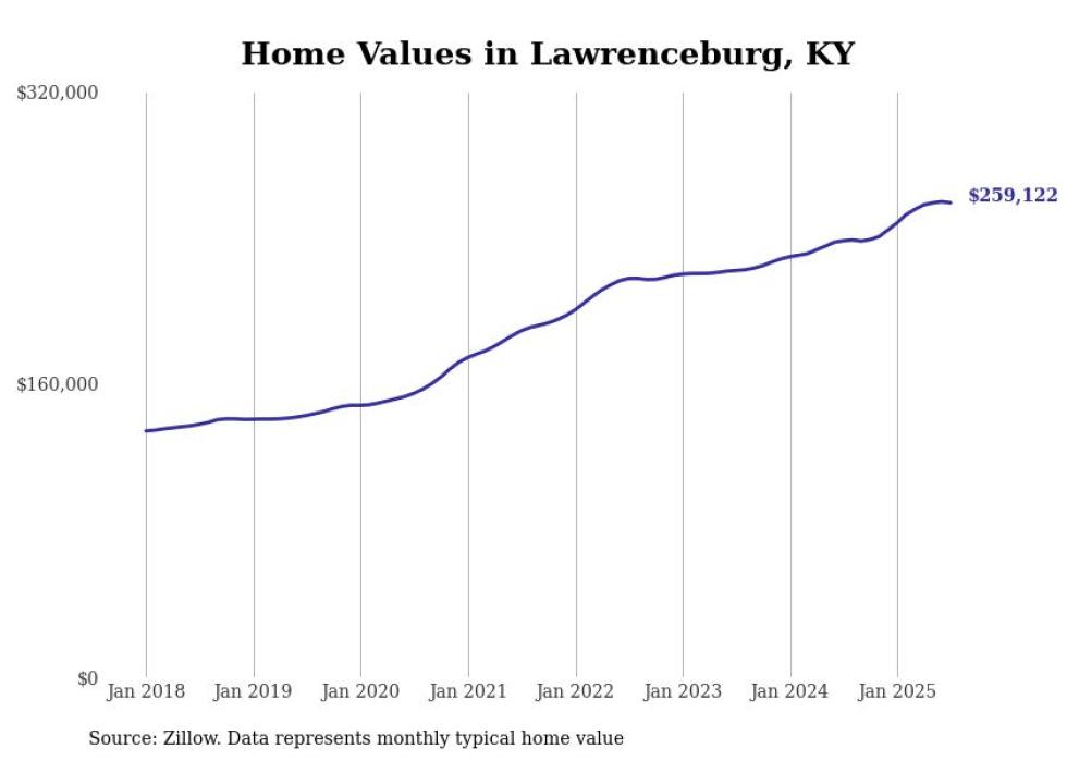 Stacker compiled a list of cities with the fastest-growing home prices in Kentucky using data from Zillow. Cities are ranked by the dollar change in the Zillow Home Values Index for all homes from the 12 months ending July 2025. The charts in this story were created automatically using Matplotlib. Data was available for 50 cities and towns in Kentucky.