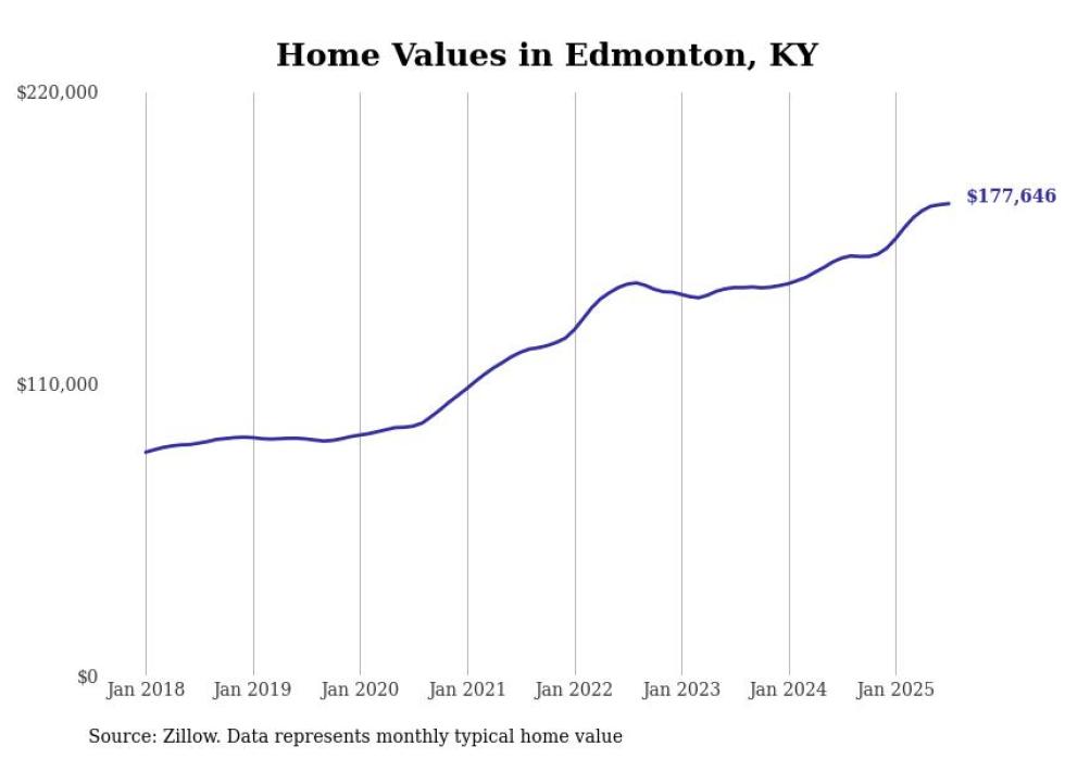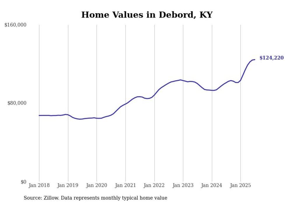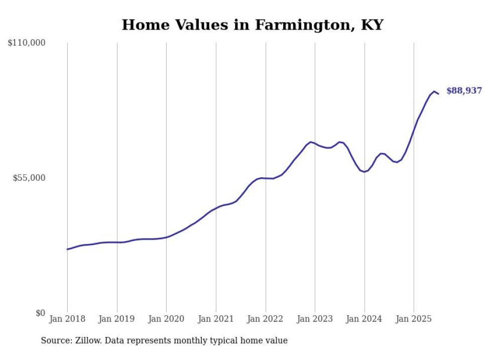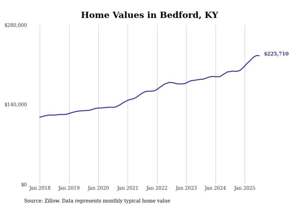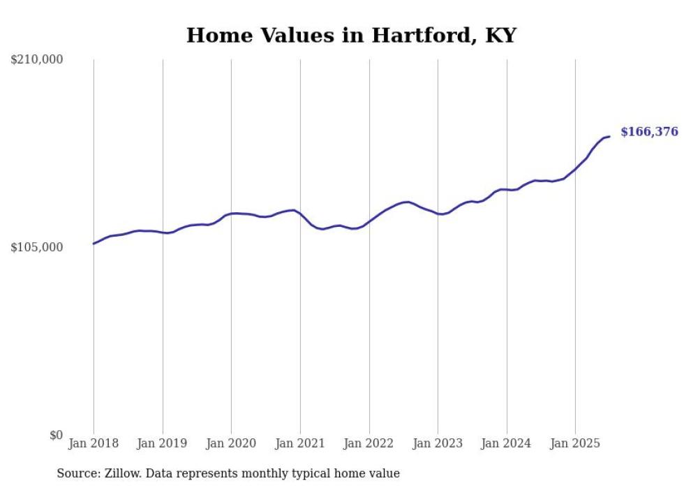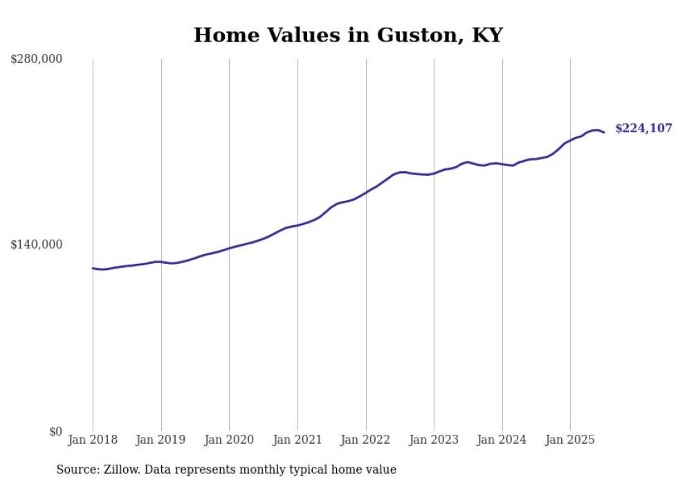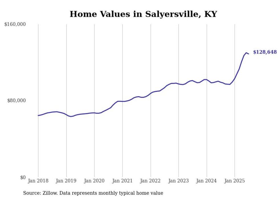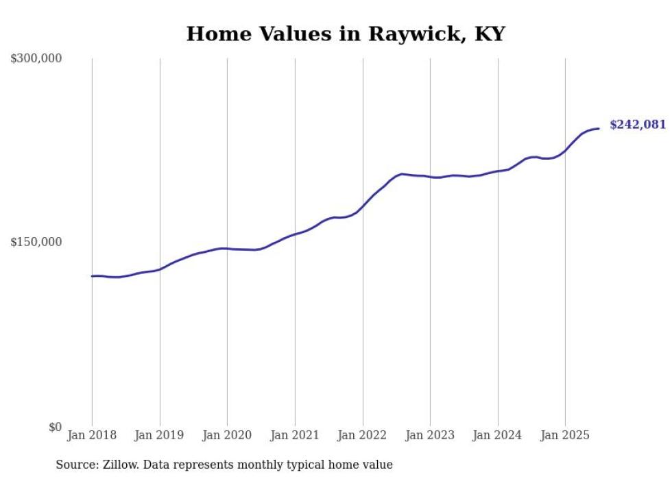 Stacker compiled a list of cities with the fastest-growing home prices in Kentucky using data from Zillow. Cities are ranked by the dollar change in the Zillow Home Values Index for all homes from the 12 months ending July 2025. The charts in this story were created automatically using Matplotlib. Data was available for 50 cities and towns in Kentucky.