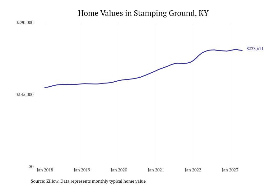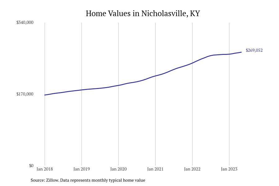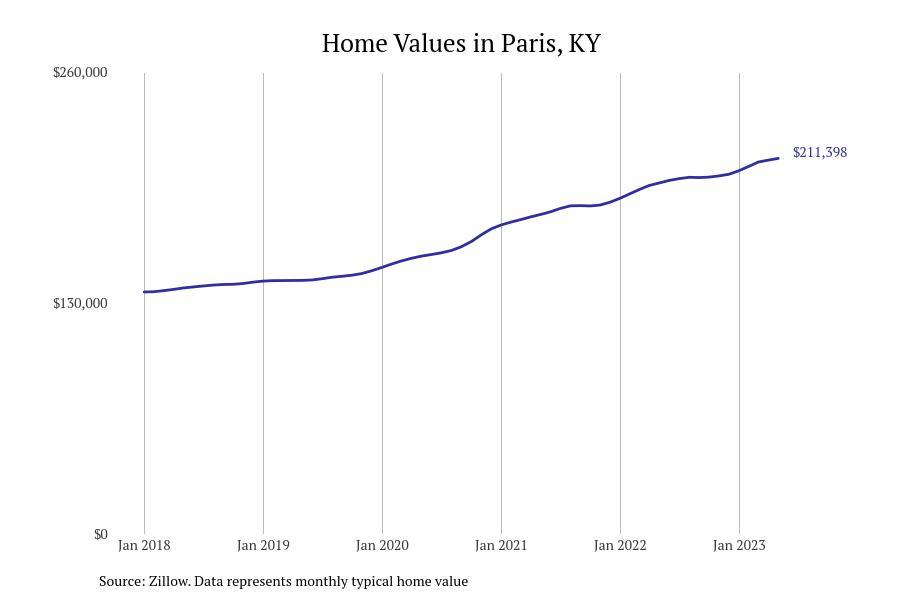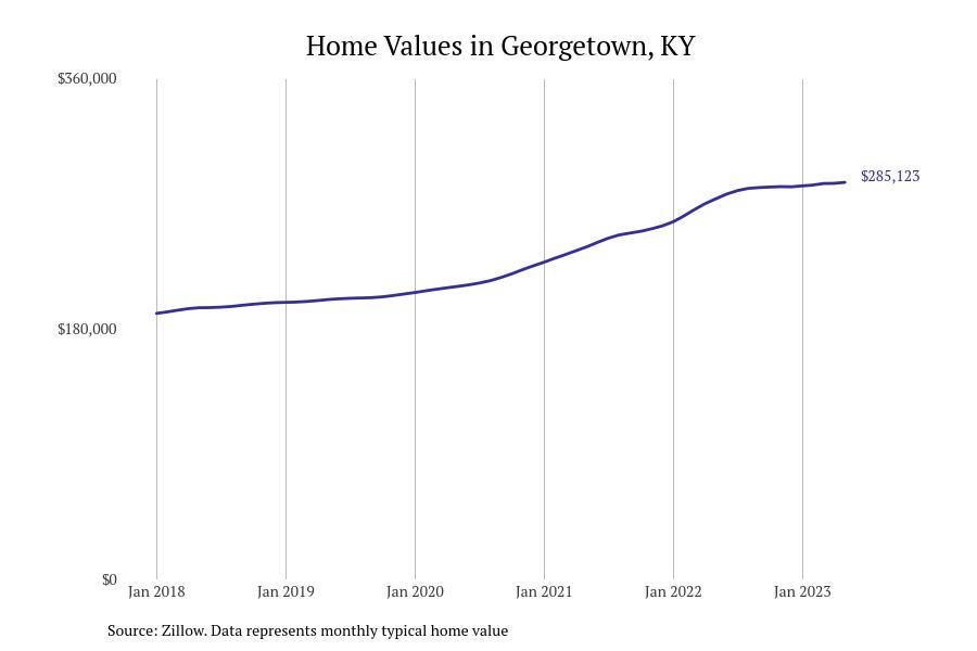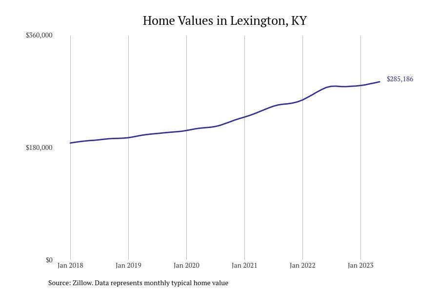 Stacker compiled a list of cities with the fastest-growing home prices in the Lexington-Fayette, KY metro area using data from Zillow. Cities are ranked by 1-year price change as of May 2023. The typical home value in the United States increased over the last year by 0.9% to $346,856. All 10 cities and towns with data available were included in the list.