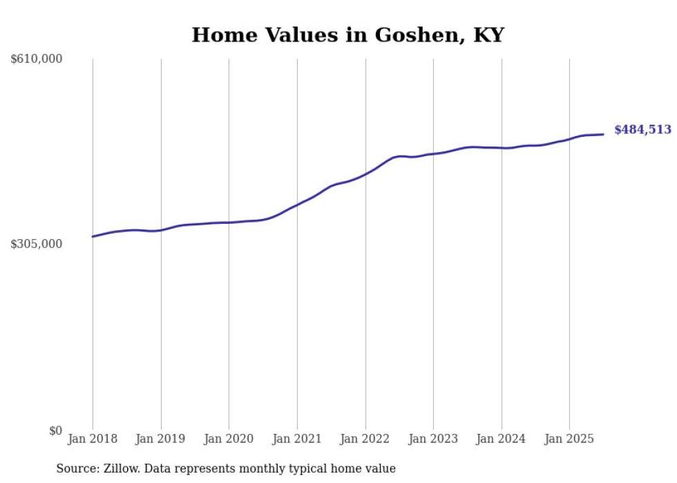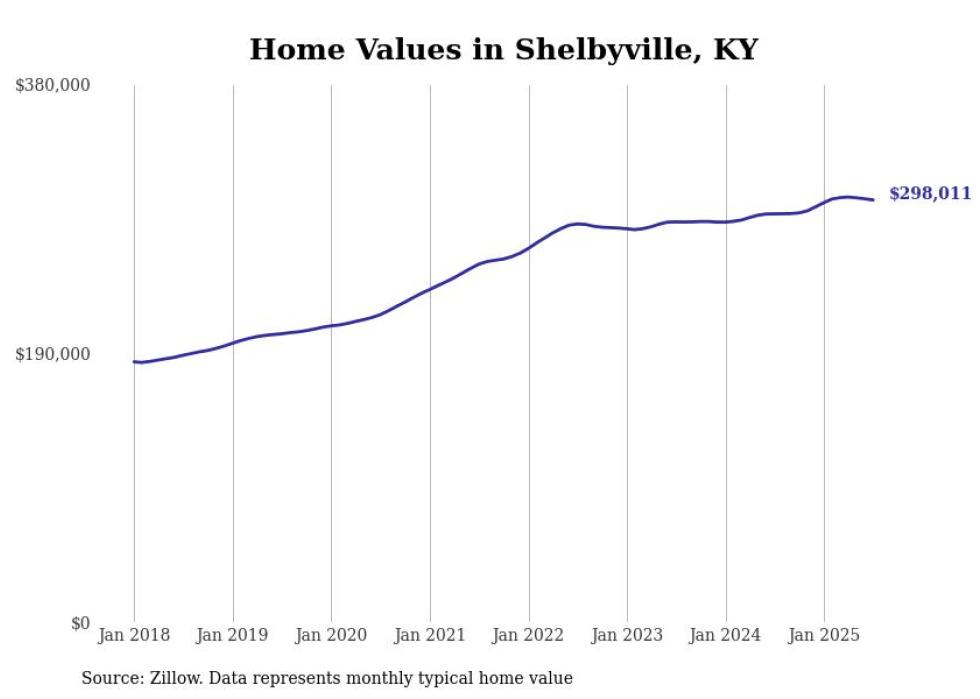 Stacker compiled a list of cities with the most expensive homes in the Louisville metro area using data from Zillow. Charts show the monthly typical home value since January 2018. Data was available for 64 cities and towns.