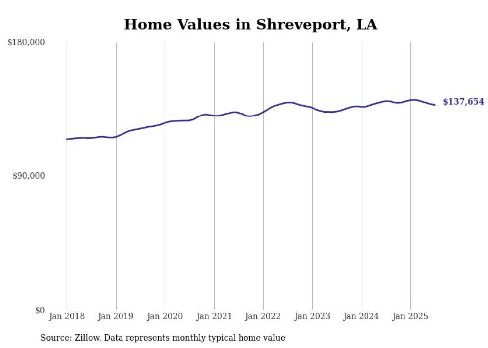 Stacker compiled a list of cities with the most expensive homes in the Shreveport metro area using data from Zillow. Charts show the monthly typical home value since January 2018. All 19 cities and towns with data available were included in the list.