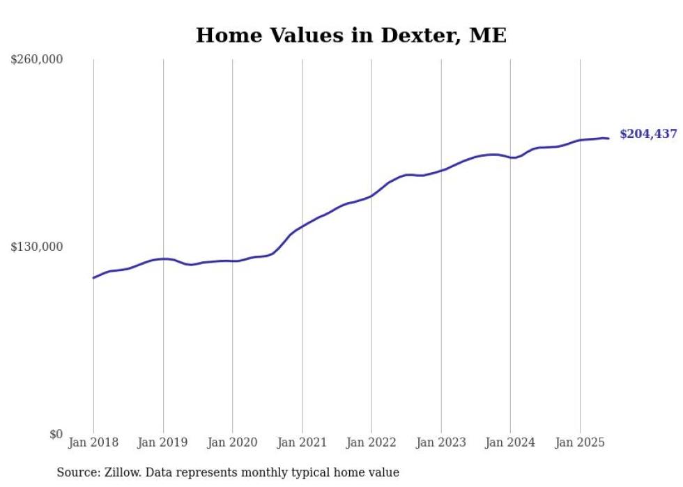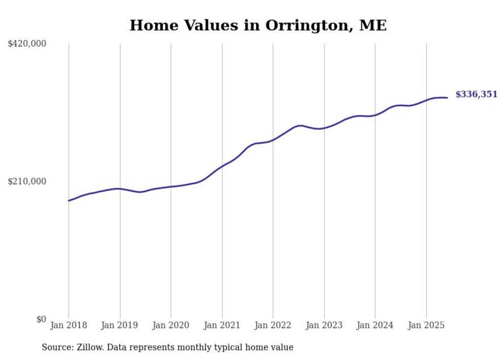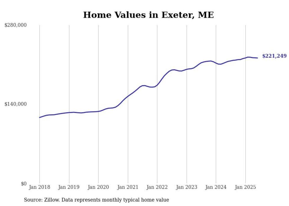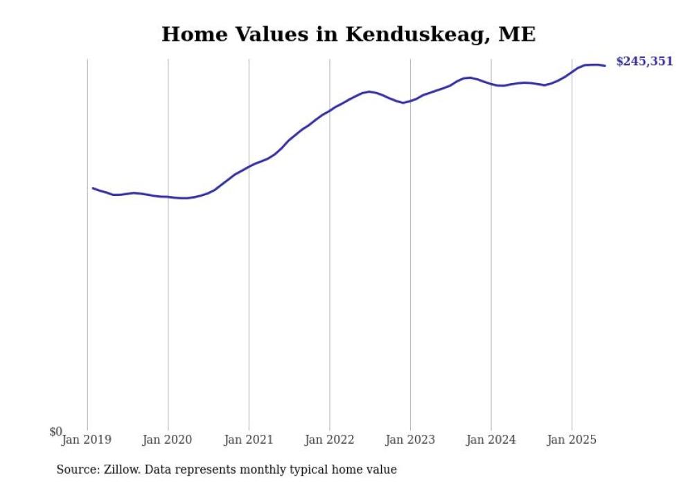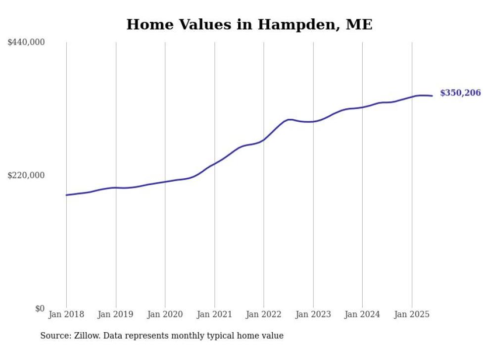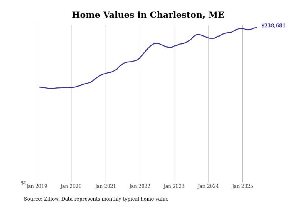 Stacker compiled a list of cities with the most expensive homes in the Bangor, ME metro area using data from Zillow. Charts show the monthly typical home value since January 2018.