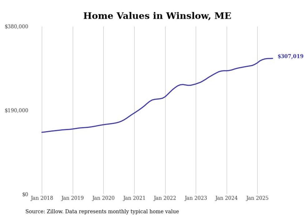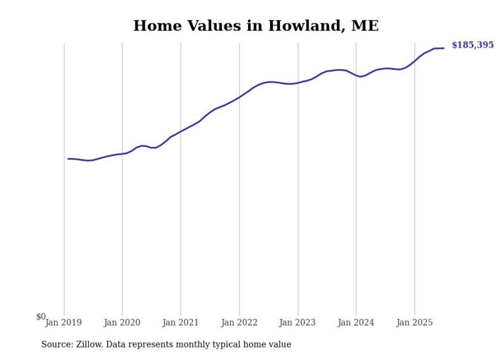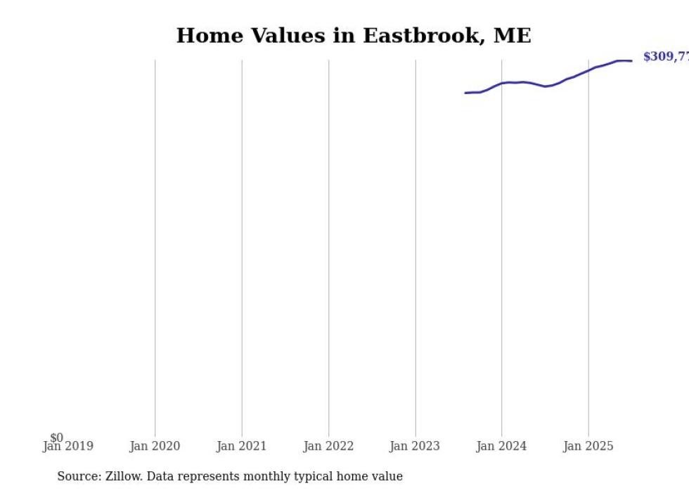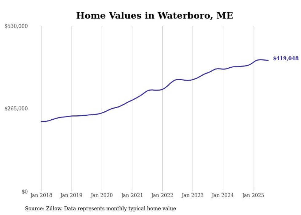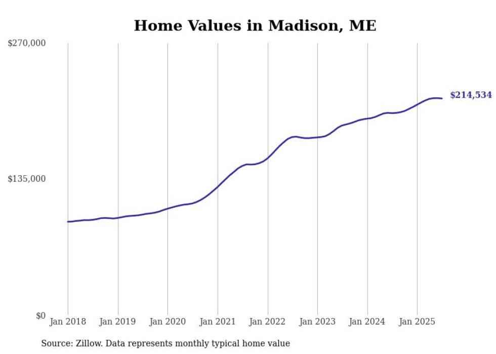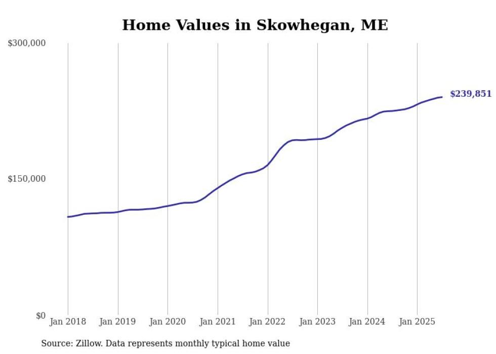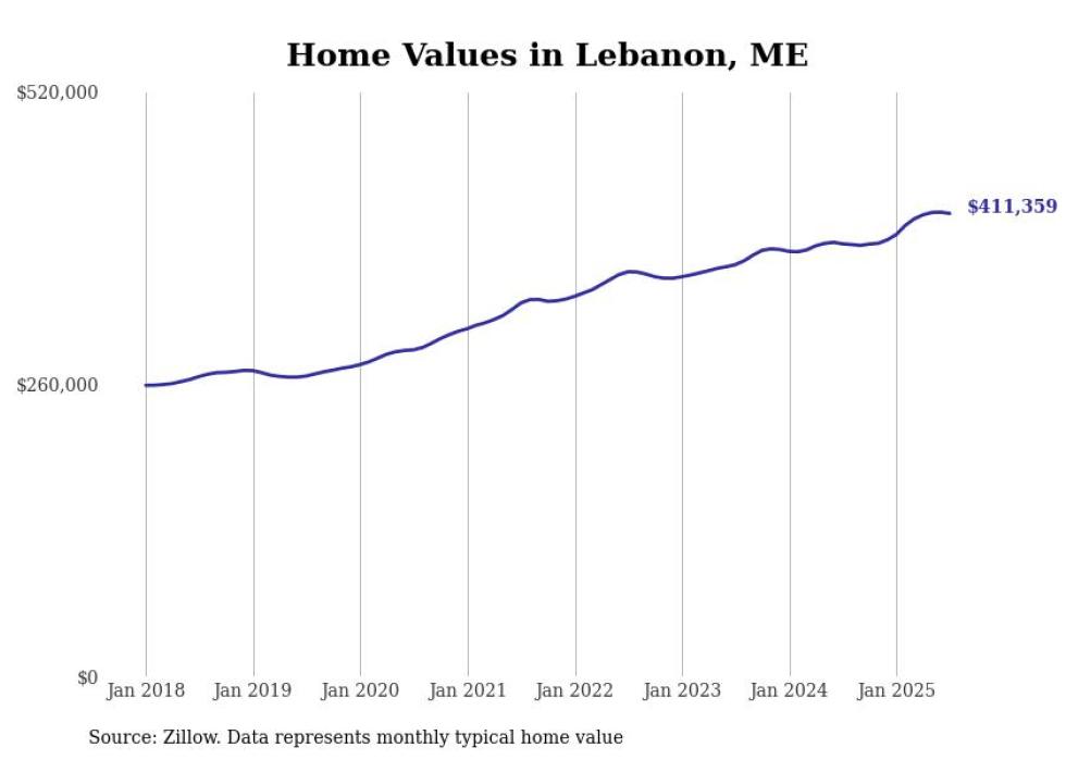 Stacker compiled a list of cities with the fastest-growing home prices in Maine using data from Zillow. Cities are ranked by the dollar change in the Zillow Home Values Index for all homes from the 12 months ending July 2025. The charts in this story were created automatically using Matplotlib. Data was available for 50 cities and towns in Maine.