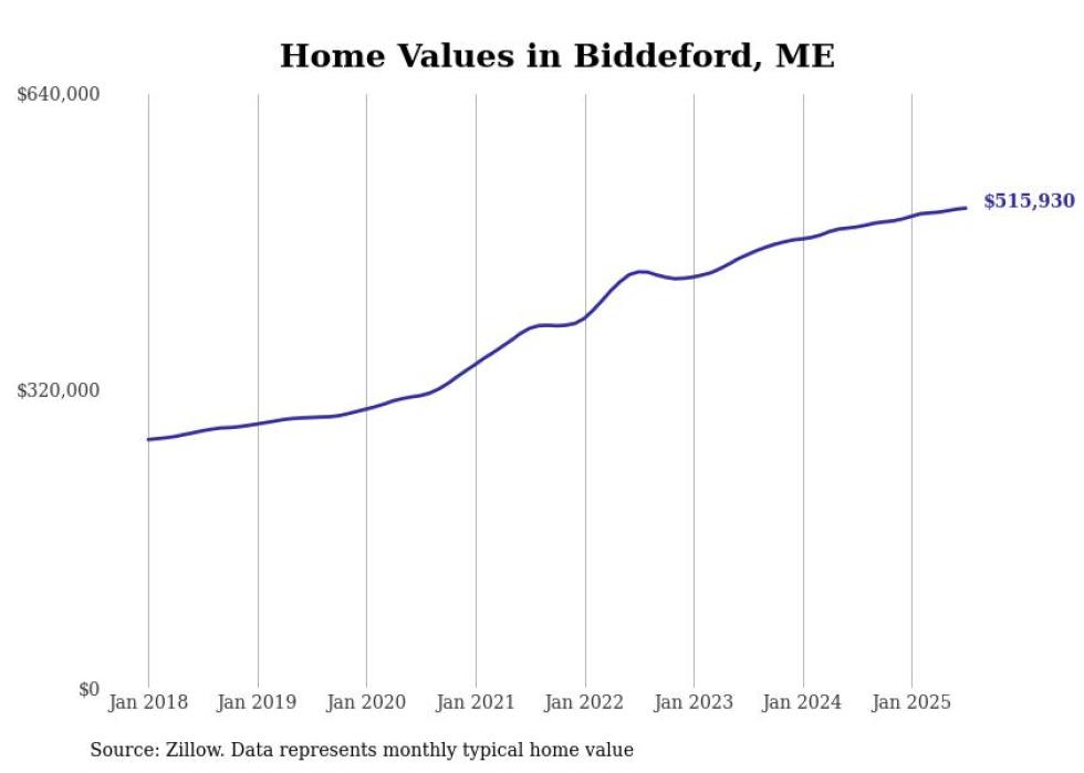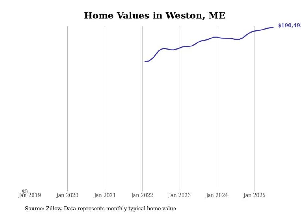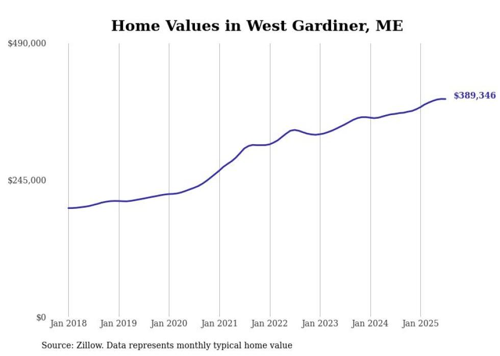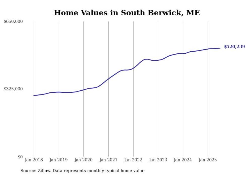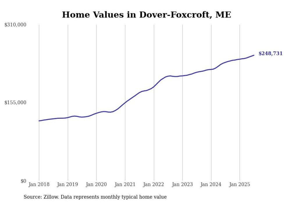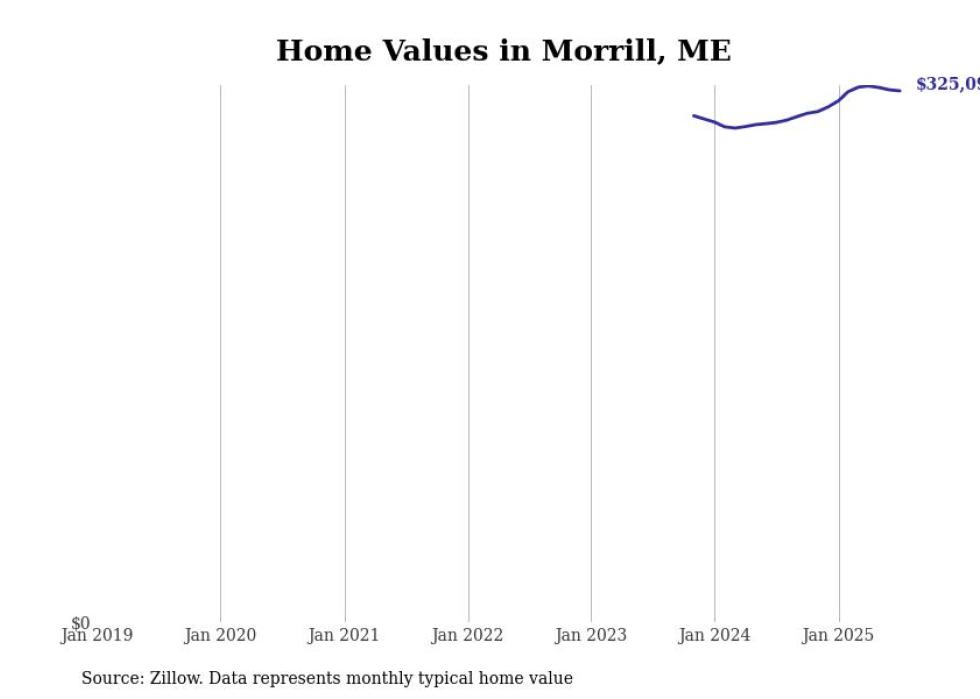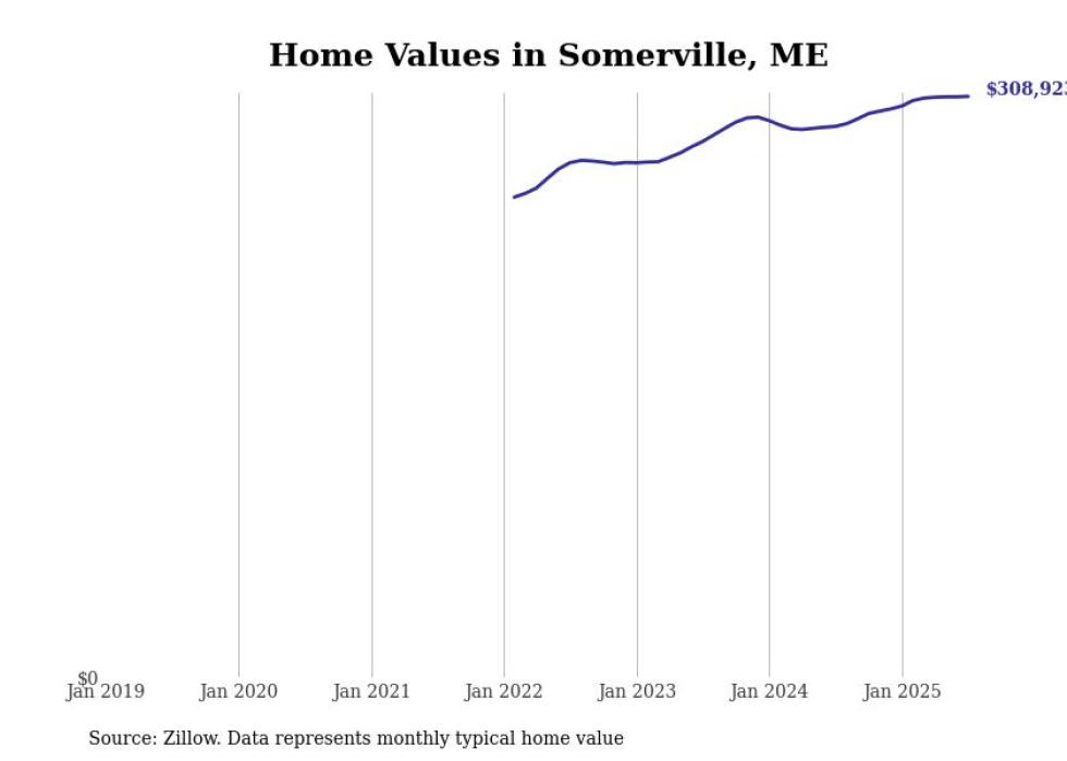 Stacker compiled a list of cities with the fastest-growing home prices in Maine using data from Zillow. Cities are ranked by the dollar change in the Zillow Home Values Index for all homes from the 12 months ending July 2025. The charts in this story were created automatically using Matplotlib. Data was available for 50 cities and towns in Maine.