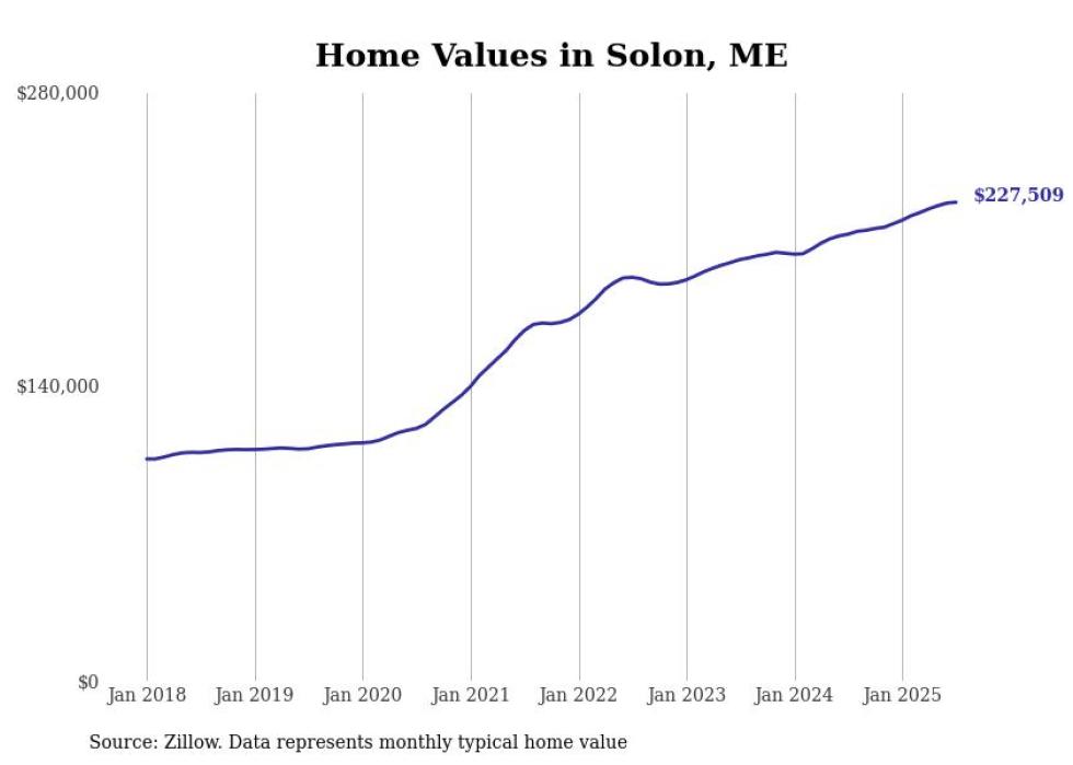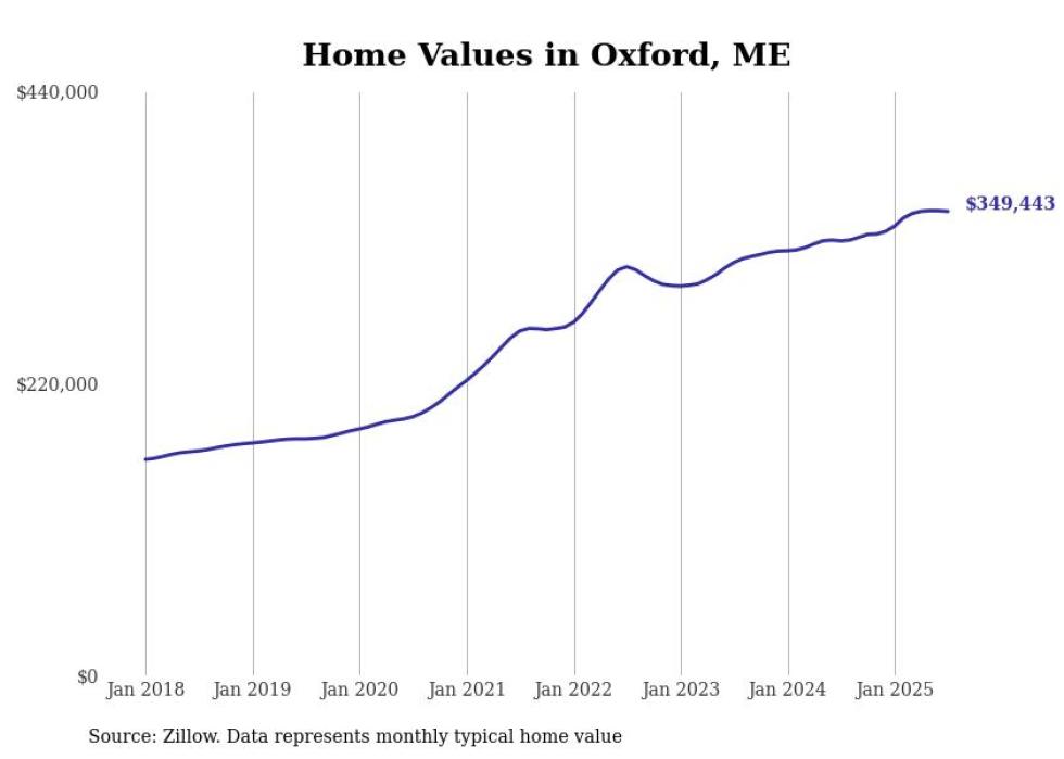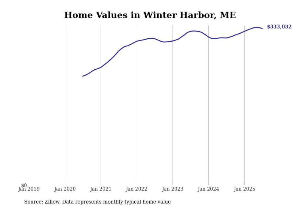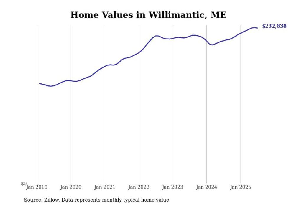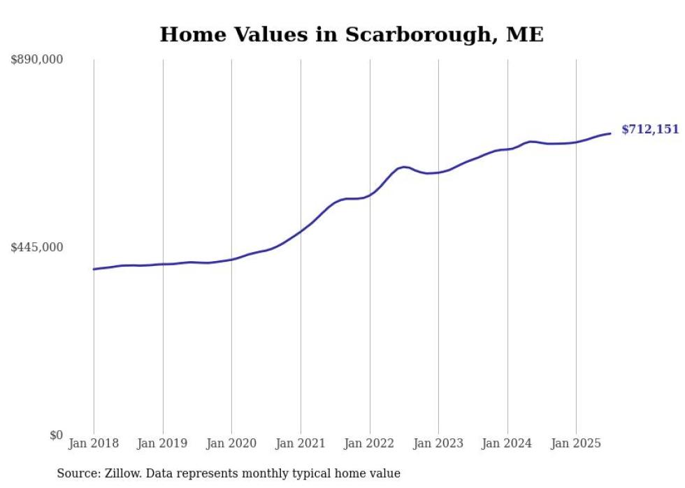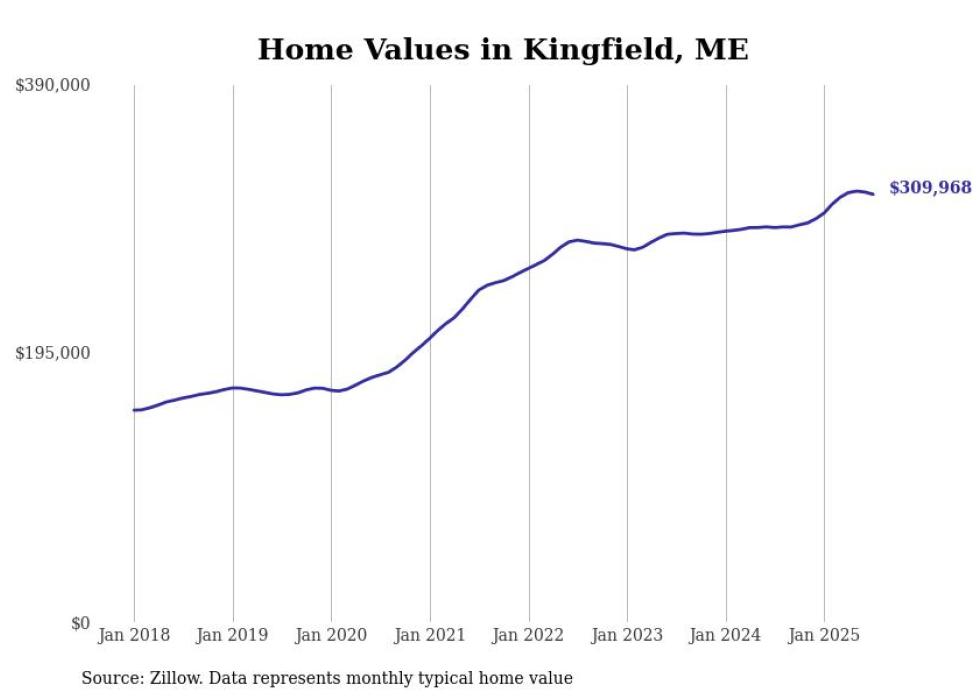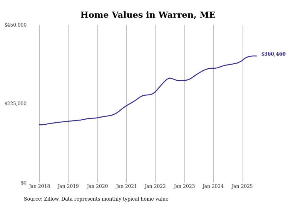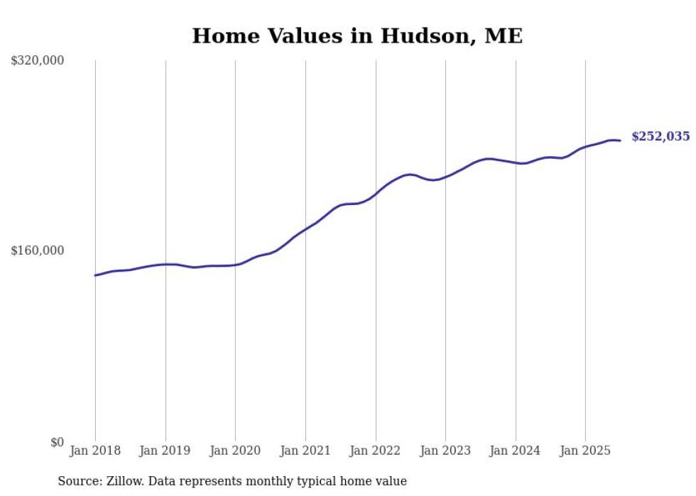 Stacker compiled a list of cities with the fastest-growing home prices in Maine using data from Zillow. Cities are ranked by the dollar change in the Zillow Home Values Index for all homes from the 12 months ending July 2025. The charts in this story were created automatically using Matplotlib. Data was available for 50 cities and towns in Maine.
