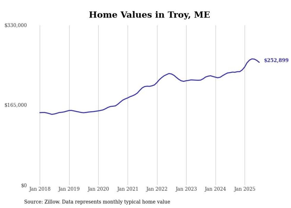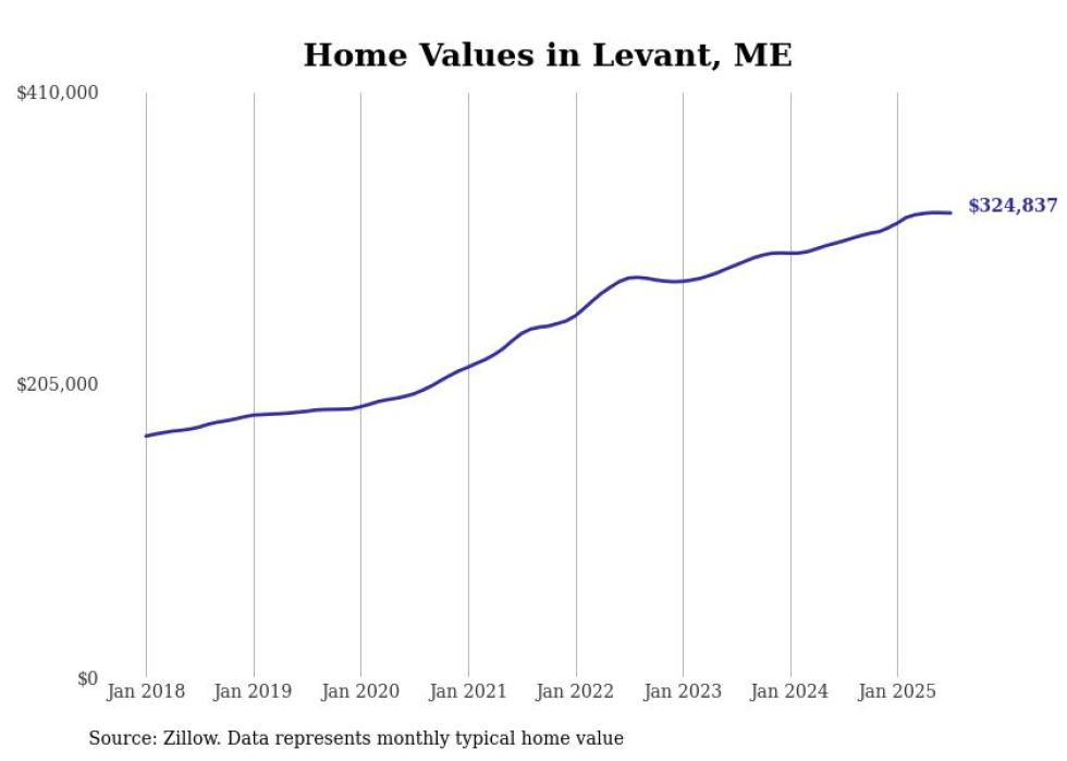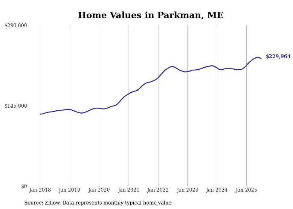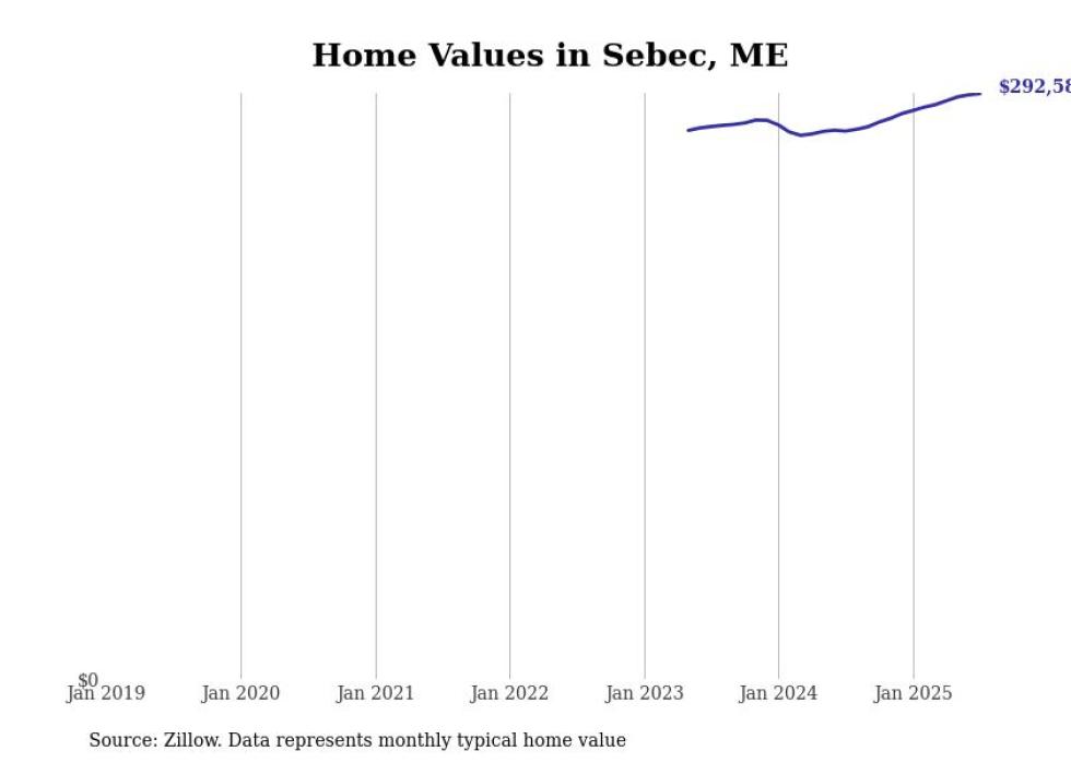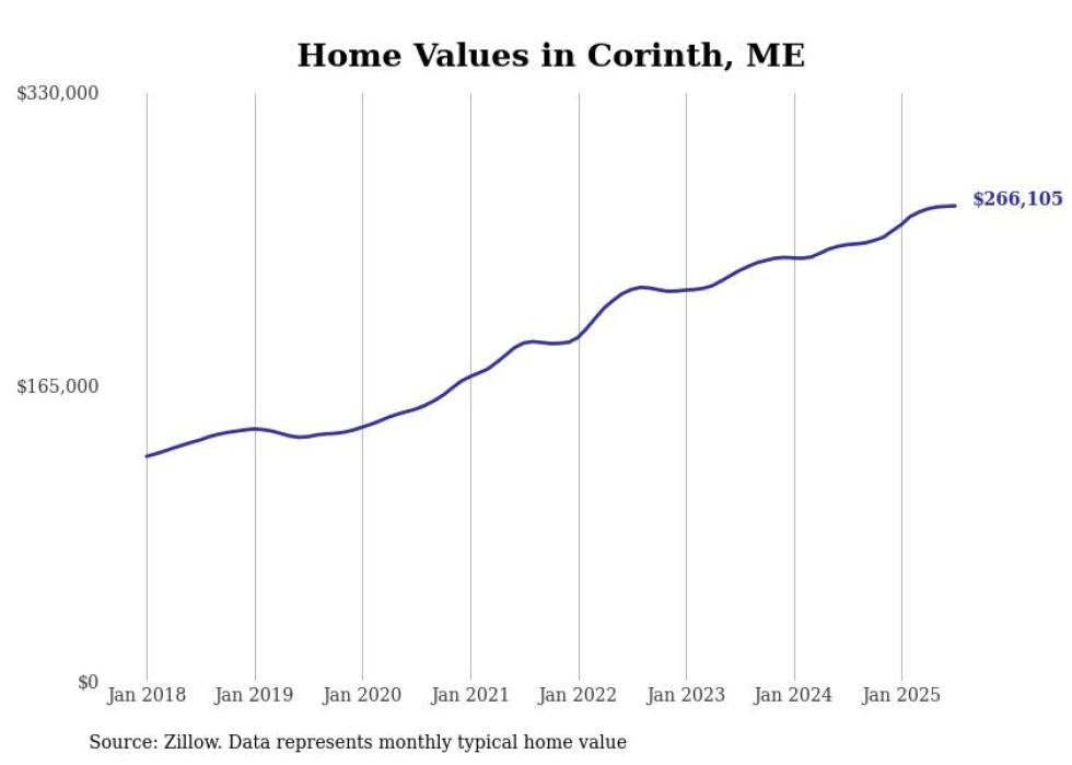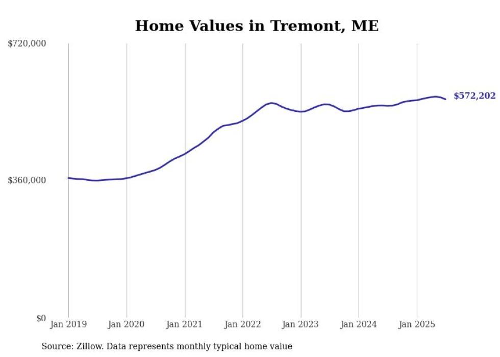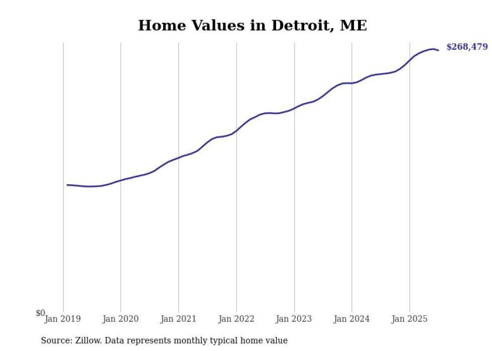 Stacker compiled a list of cities with the fastest-growing home prices in Maine using data from Zillow. Cities are ranked by the dollar change in the Zillow Home Values Index for all homes from the 12 months ending July 2025. The charts in this story were created automatically using Matplotlib. Data was available for 50 cities and towns in Maine.