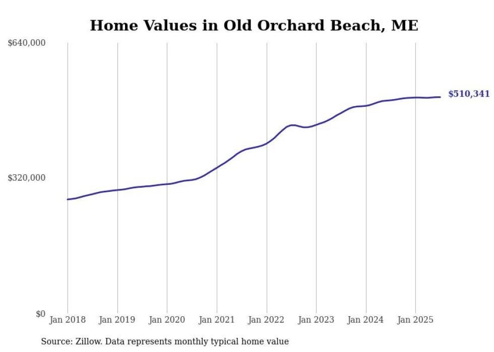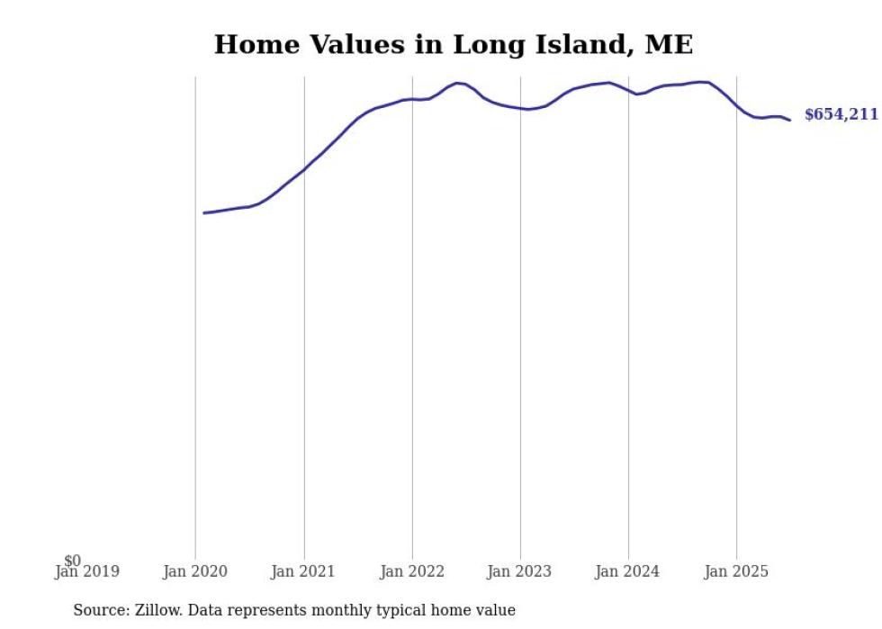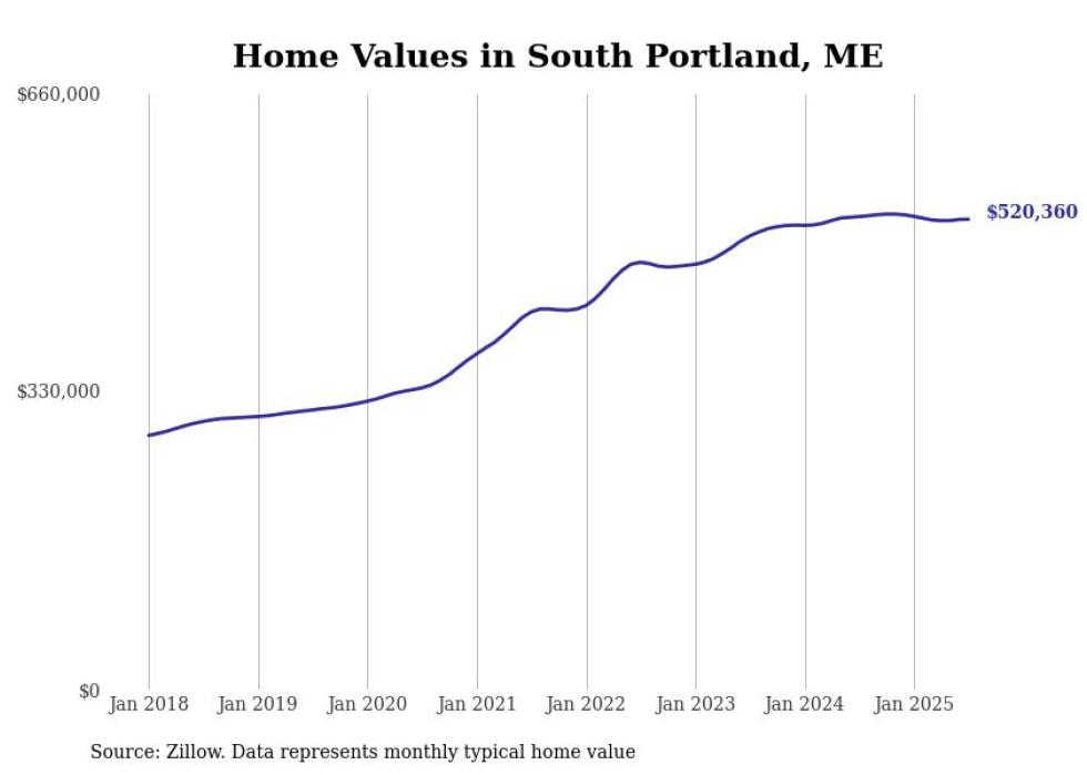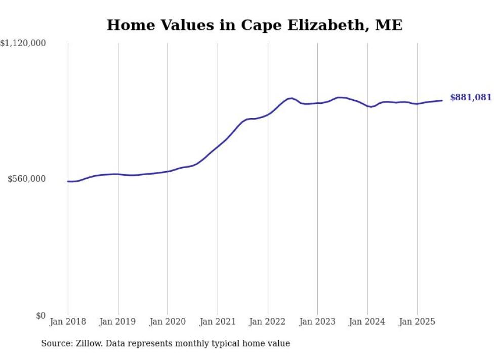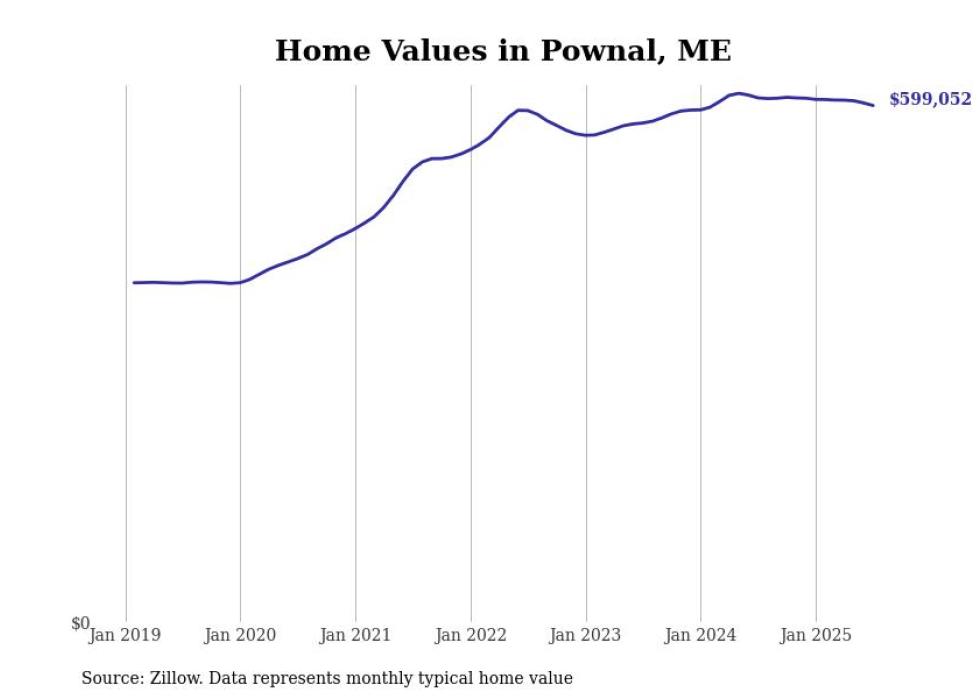 Stacker compiled a list of cities with the most expensive homes in the Portland, Maine metro area using data from Zillow. Charts show the monthly typical home value since January 2018. Data was available for 65 cities and towns.