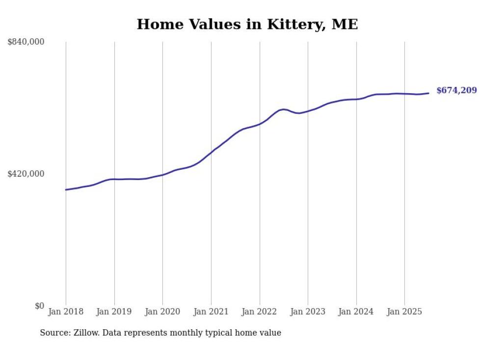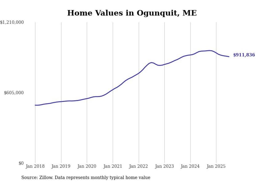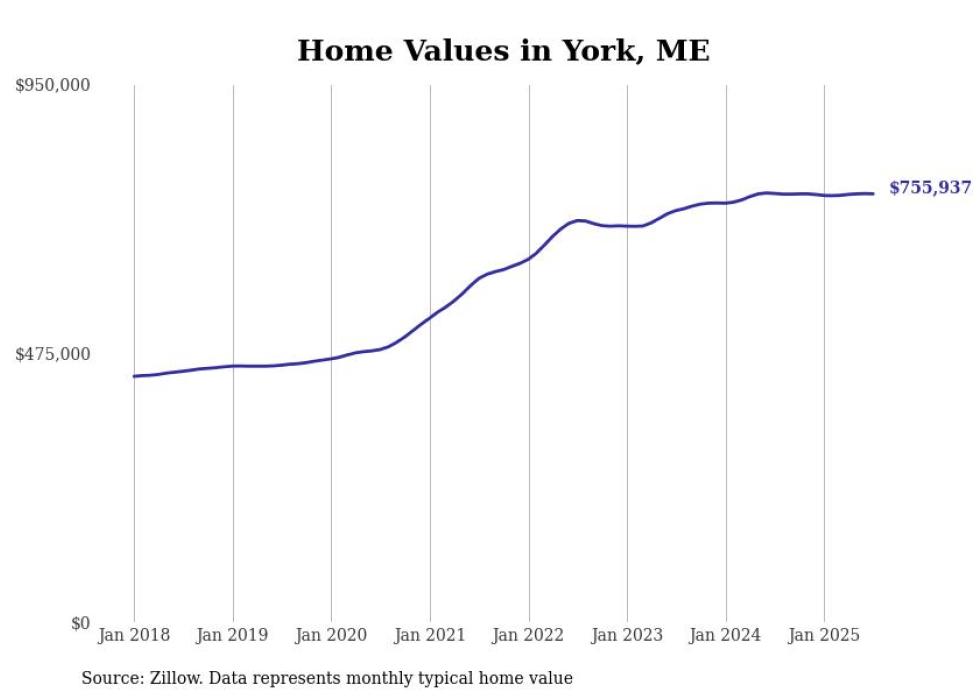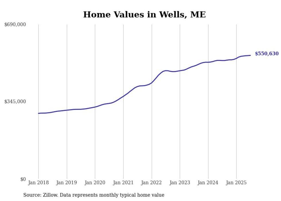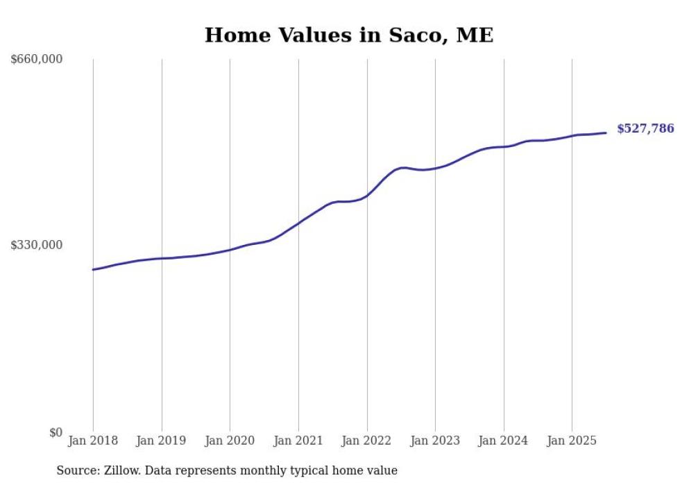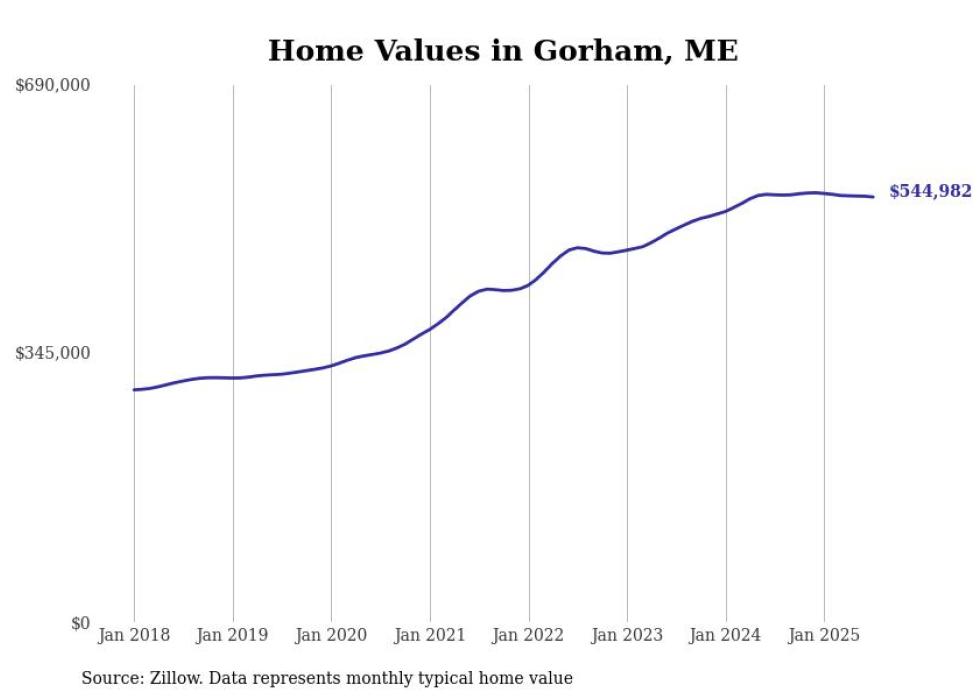 Stacker compiled a list of cities with the most expensive homes in the Portland, Maine metro area using data from Zillow. Charts show the monthly typical home value since January 2018. Data was available for 65 cities and towns.