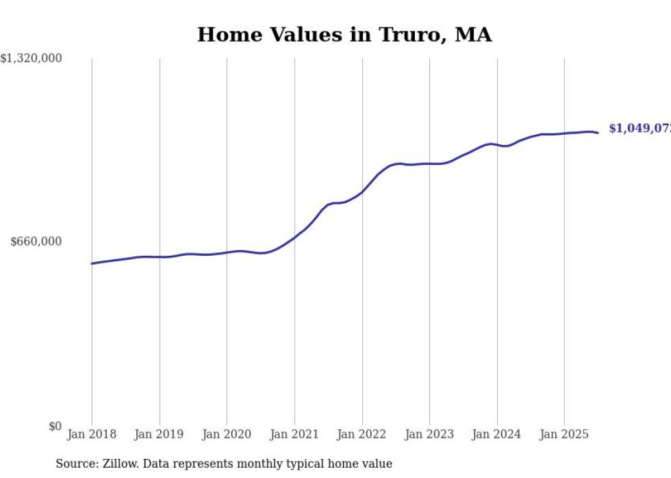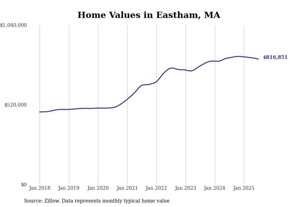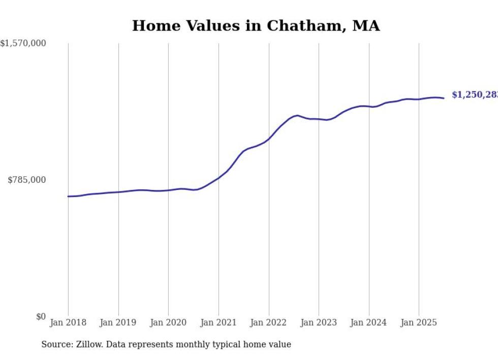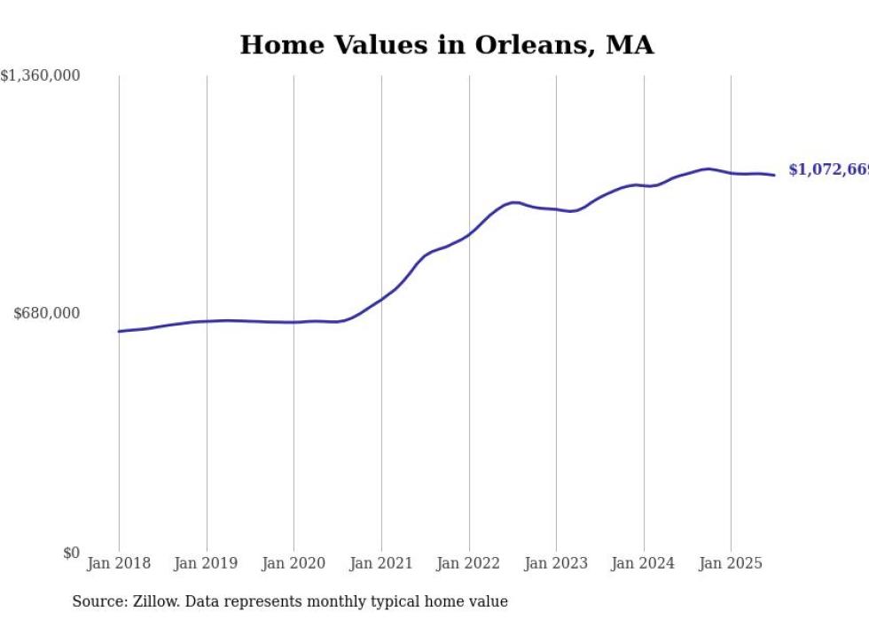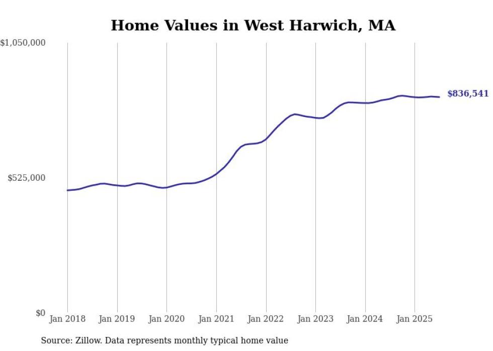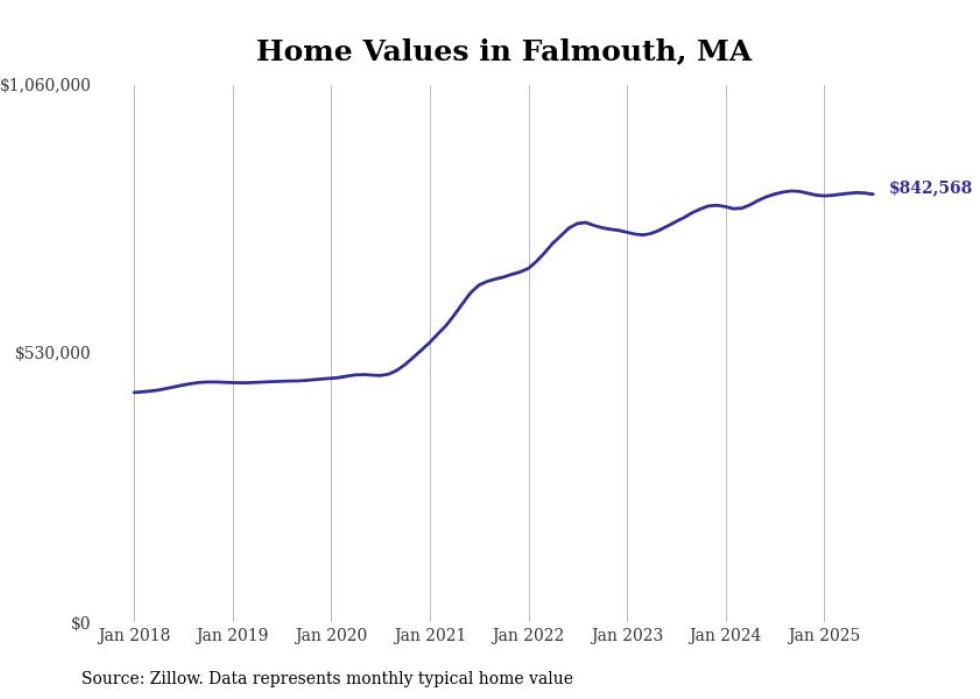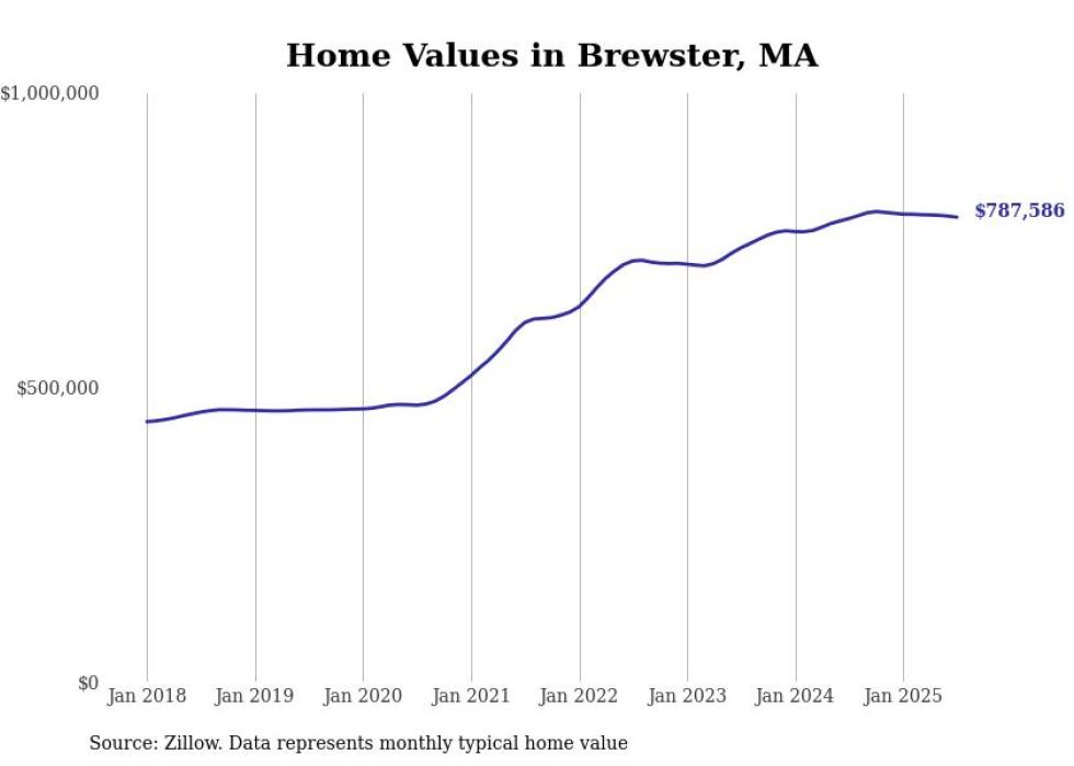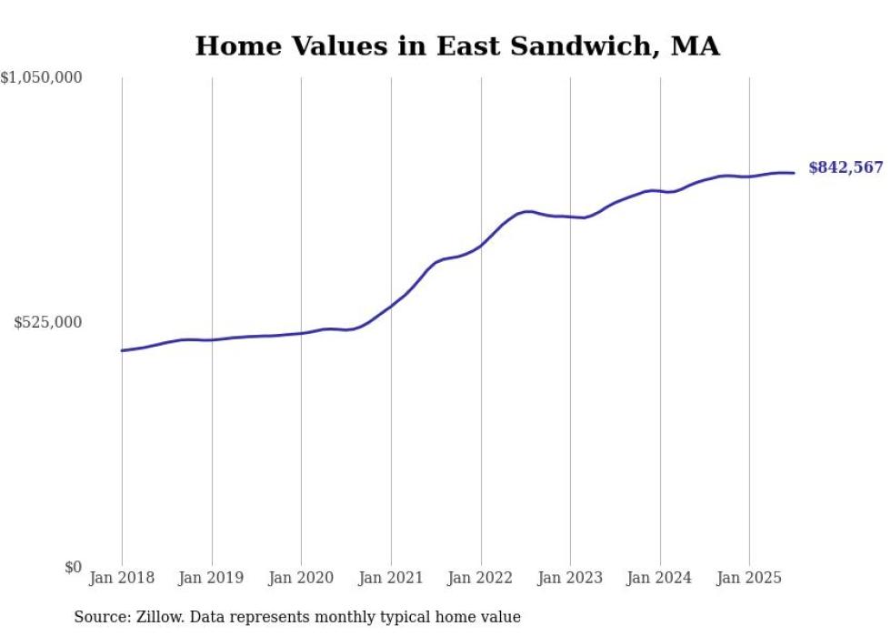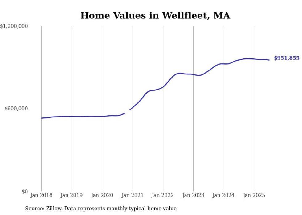 Stacker compiled a list of cities with the most expensive homes in the Barnstable Town metro area using data from Zillow. Charts show the monthly typical home value since January 2018. All 19 cities and towns with data available were included in the list.
