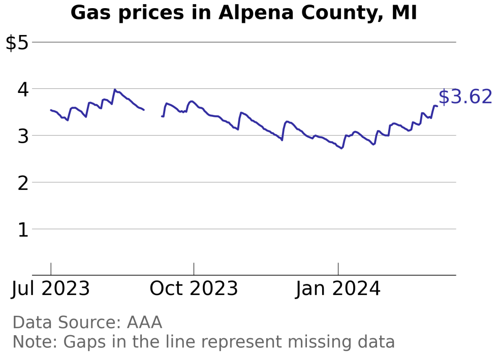 Stacker compiled statistics on gas prices in Alpena County using data from AAA. Gas prices are current as of March 11.