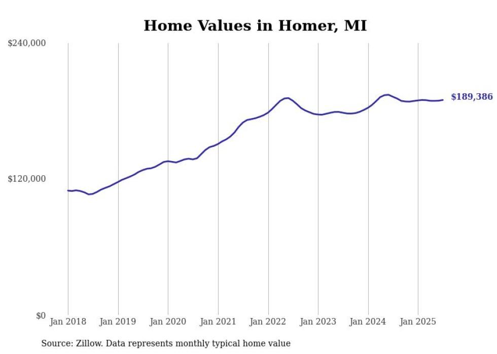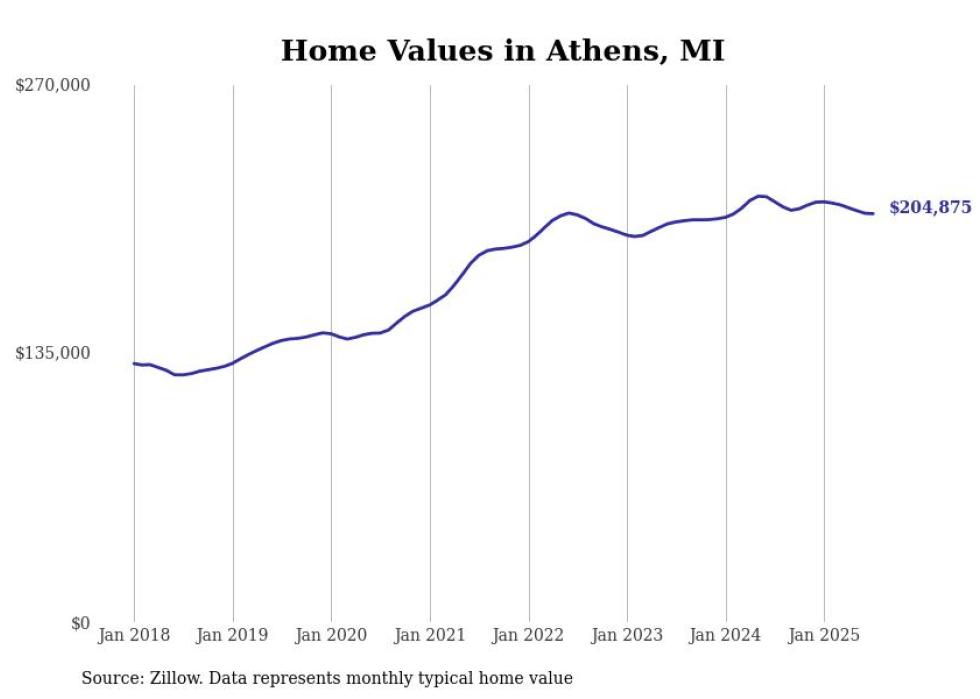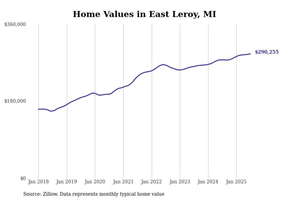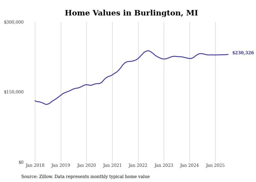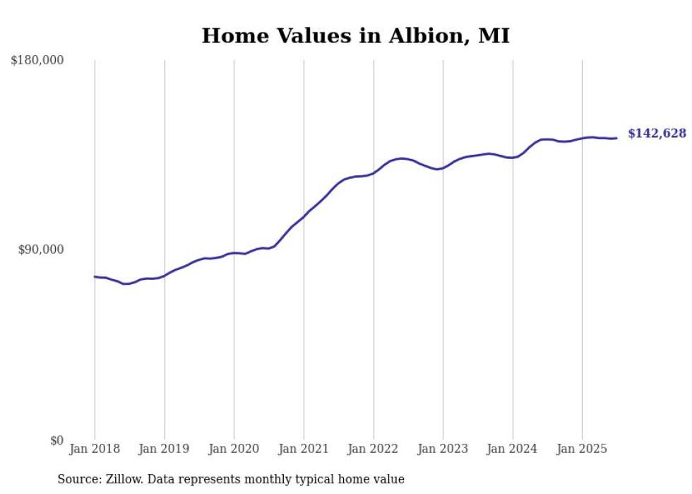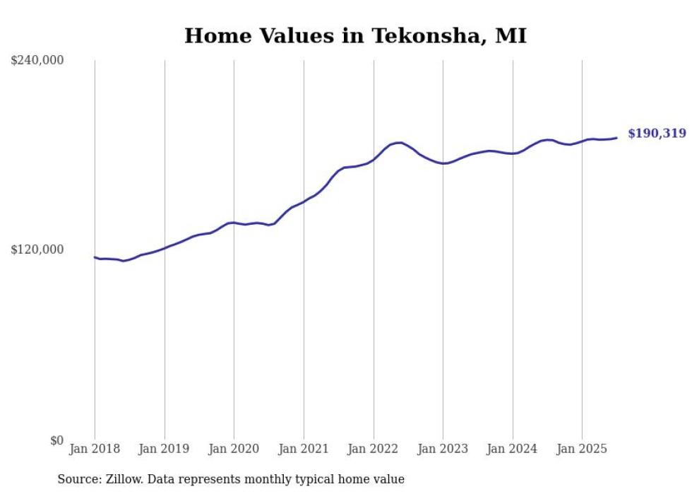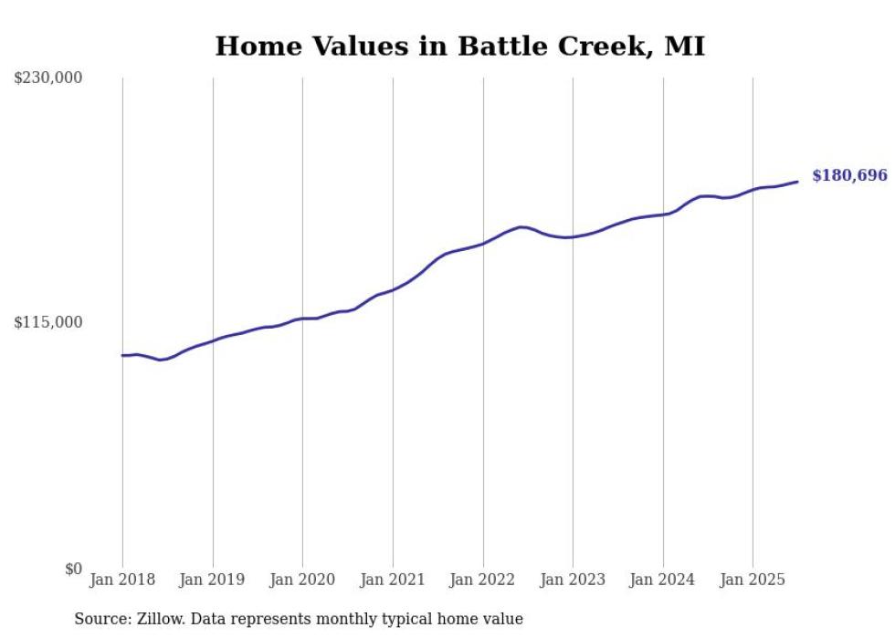 Stacker compiled a list of cities with the most expensive homes in the Battle Creek metro area using data from Zillow. Charts show the monthly typical home value since January 2018. All 10 cities and towns with data available were included in the list.