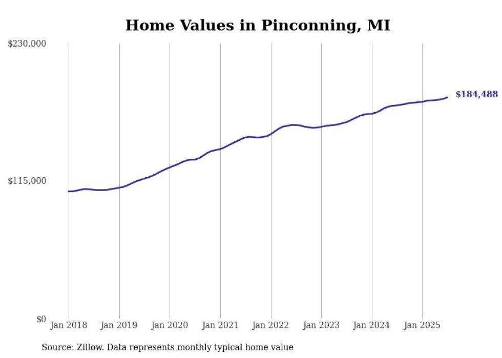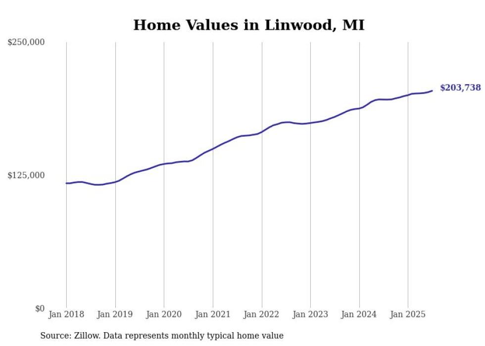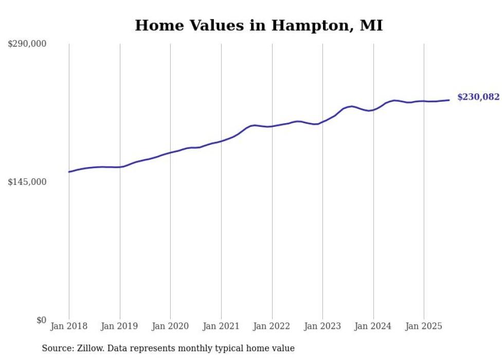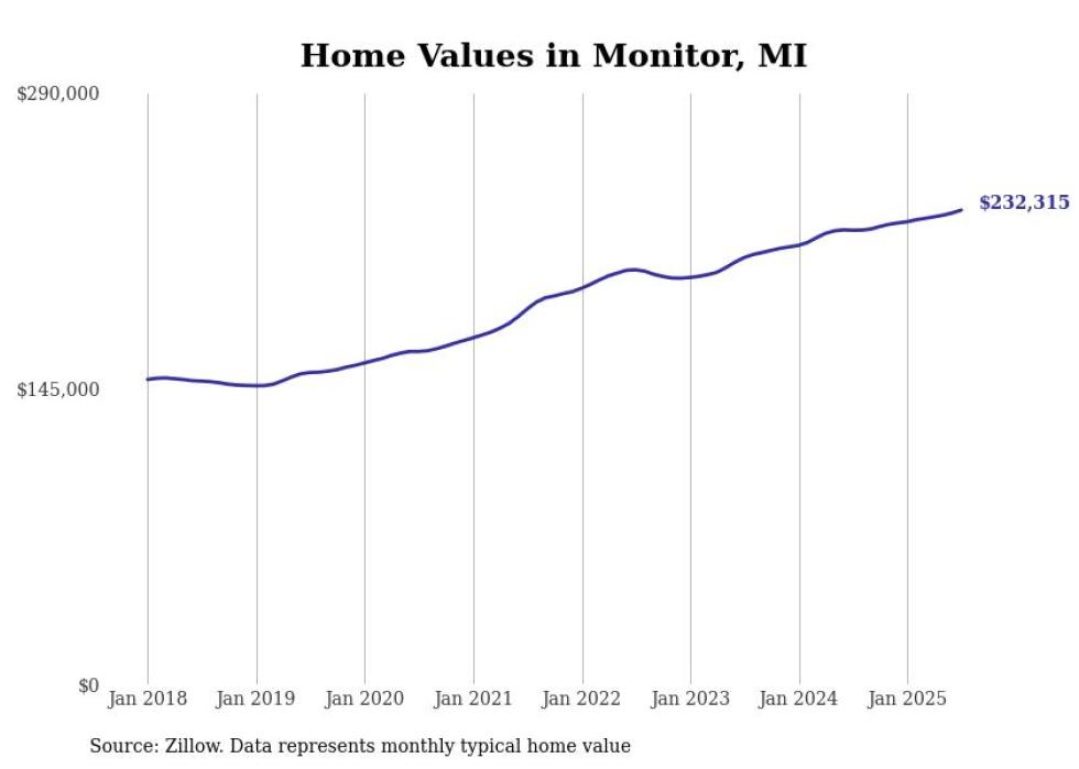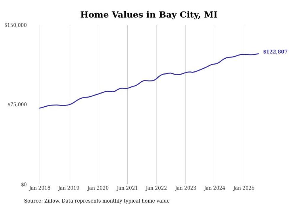 Stacker compiled a list of cities with the most expensive homes in the Bay City metro area using data from Zillow. Charts show the monthly typical home value since January 2018. All 11 cities and towns with data available were included in the list.