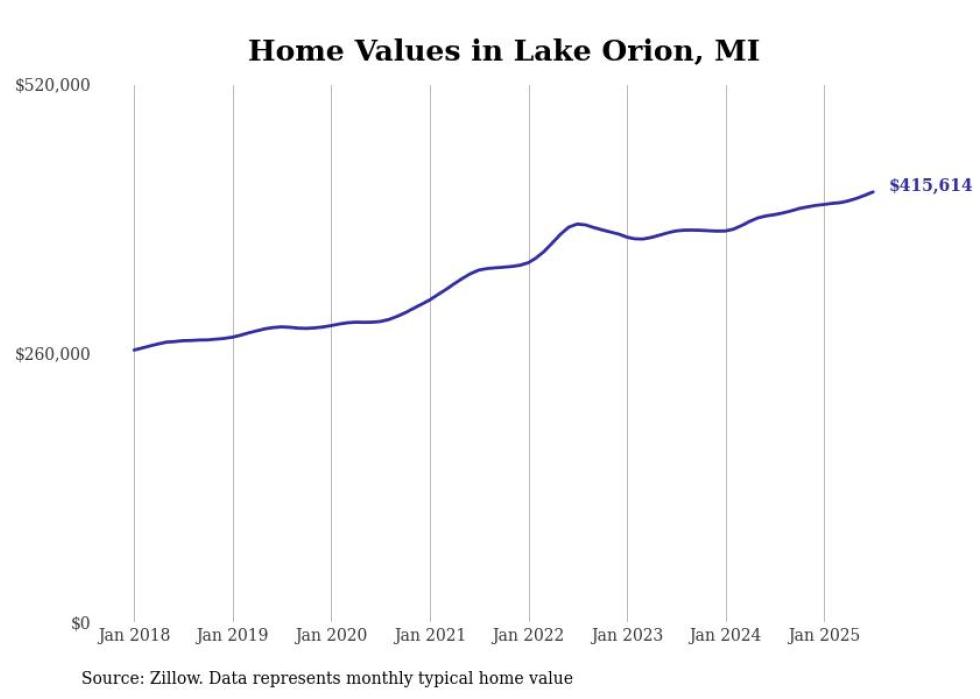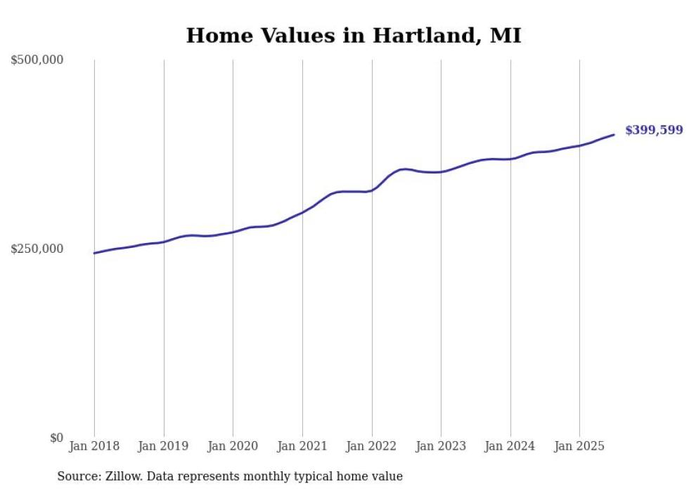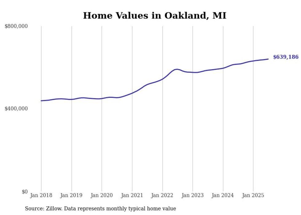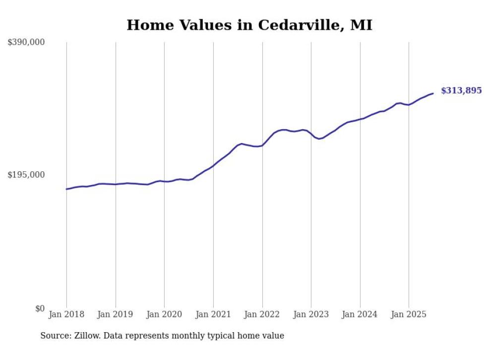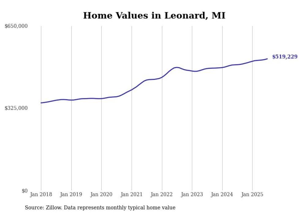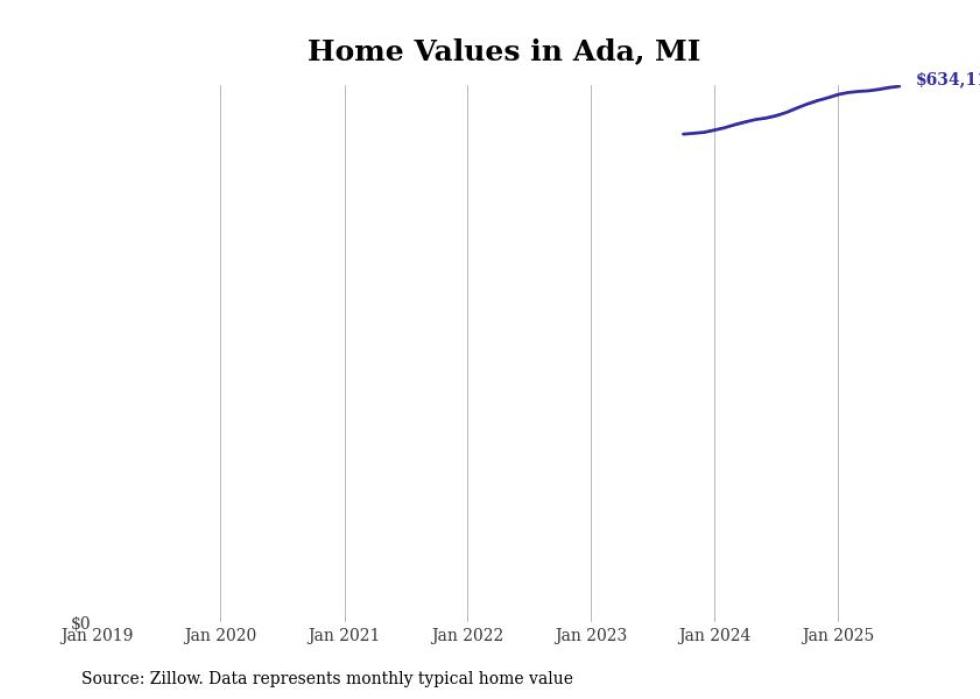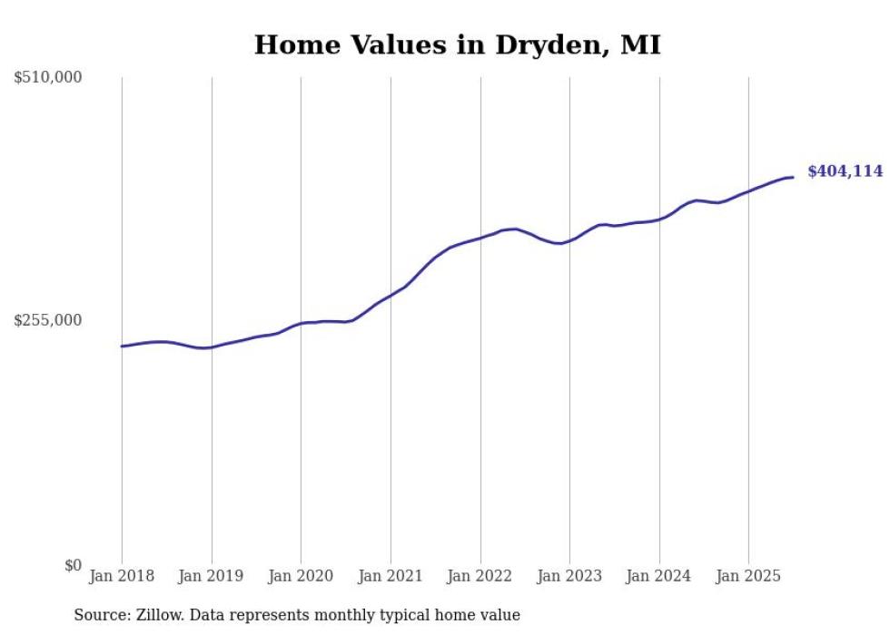 Stacker compiled a list of cities with the fastest-growing home prices in Michigan using data from Zillow. Cities are ranked by the dollar change in the Zillow Home Values Index for all homes from the 12 months ending July 2025. The charts in this story were created automatically using Matplotlib. Data was available for 50 cities and towns in Michigan.
