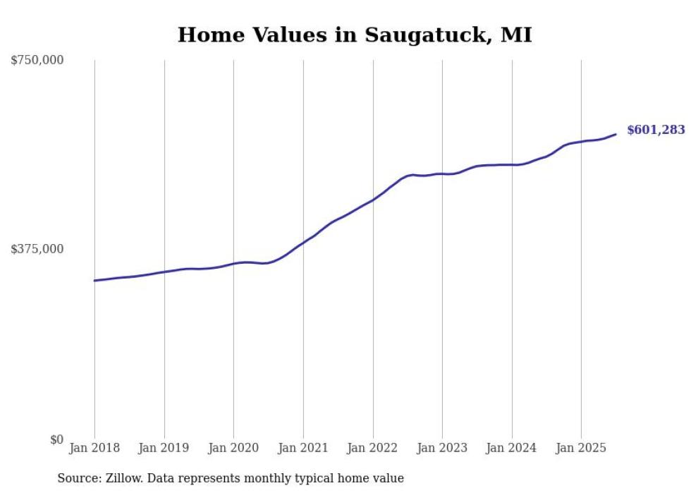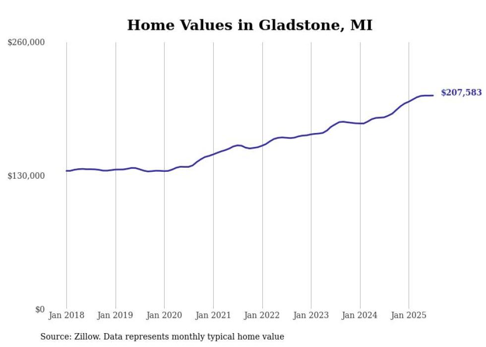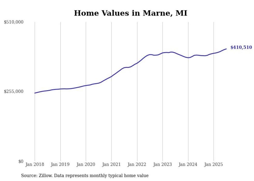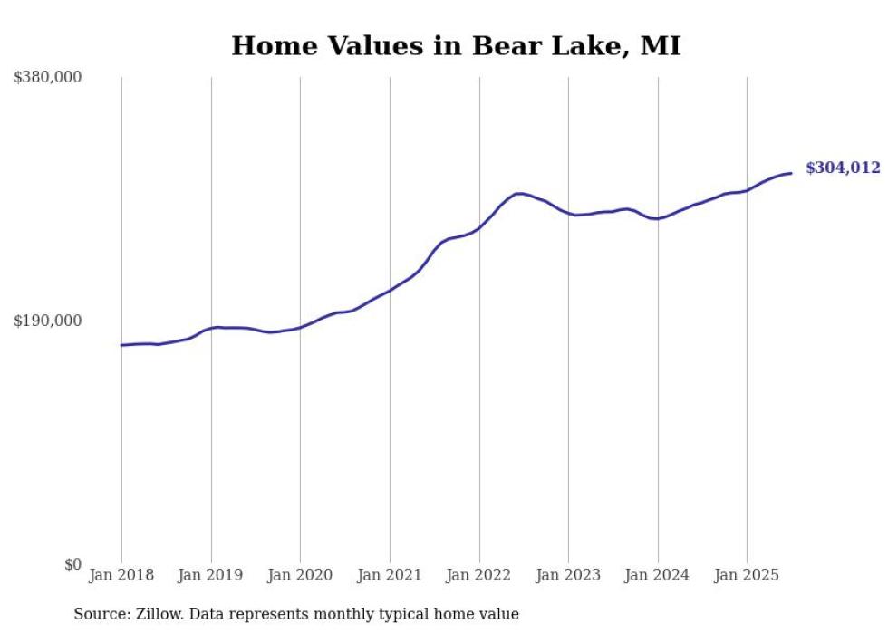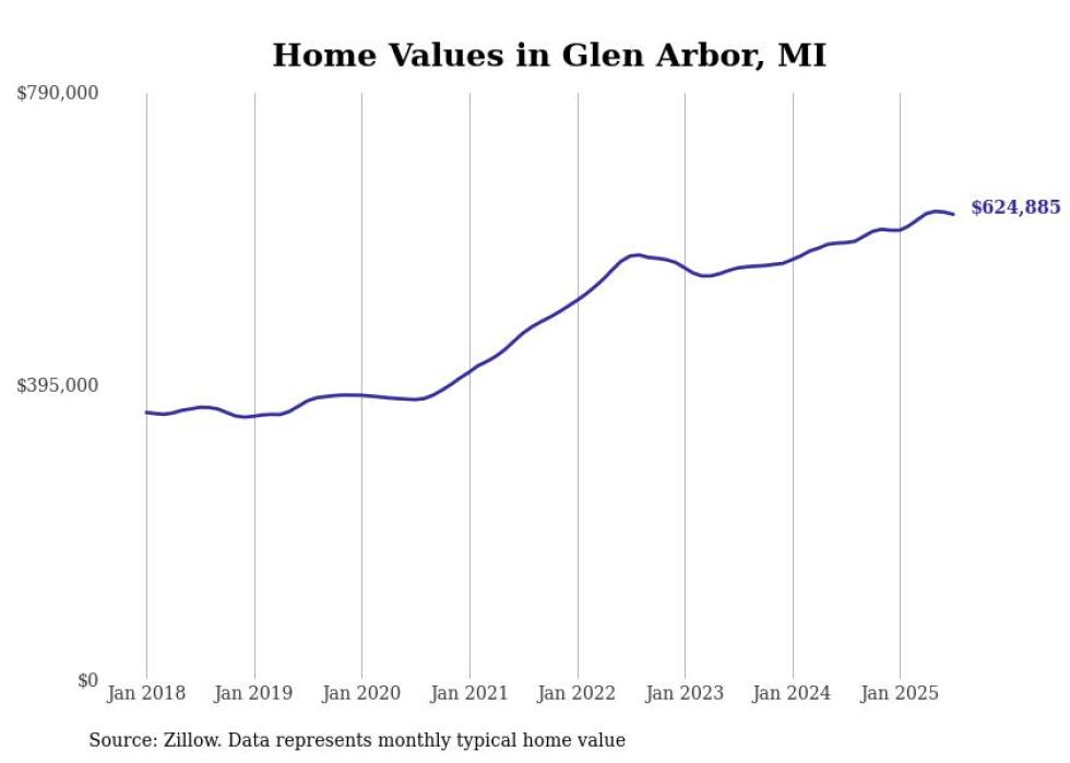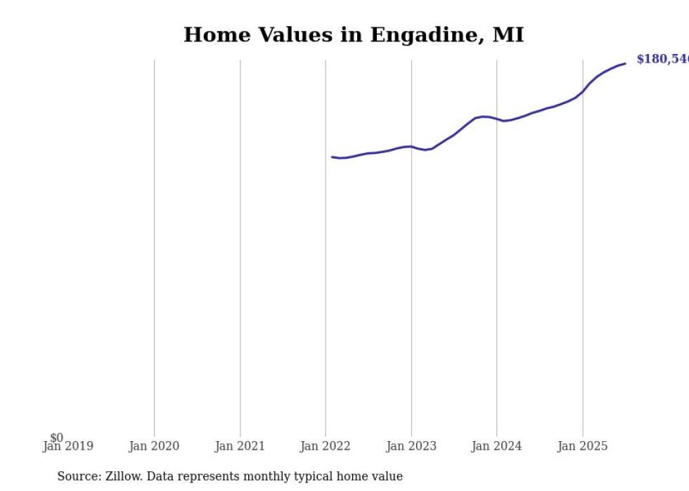 Stacker compiled a list of cities with the fastest-growing home prices in Michigan using data from Zillow. Cities are ranked by the dollar change in the Zillow Home Values Index for all homes from the 12 months ending July 2025. The charts in this story were created automatically using Matplotlib. Data was available for 50 cities and towns in Michigan.