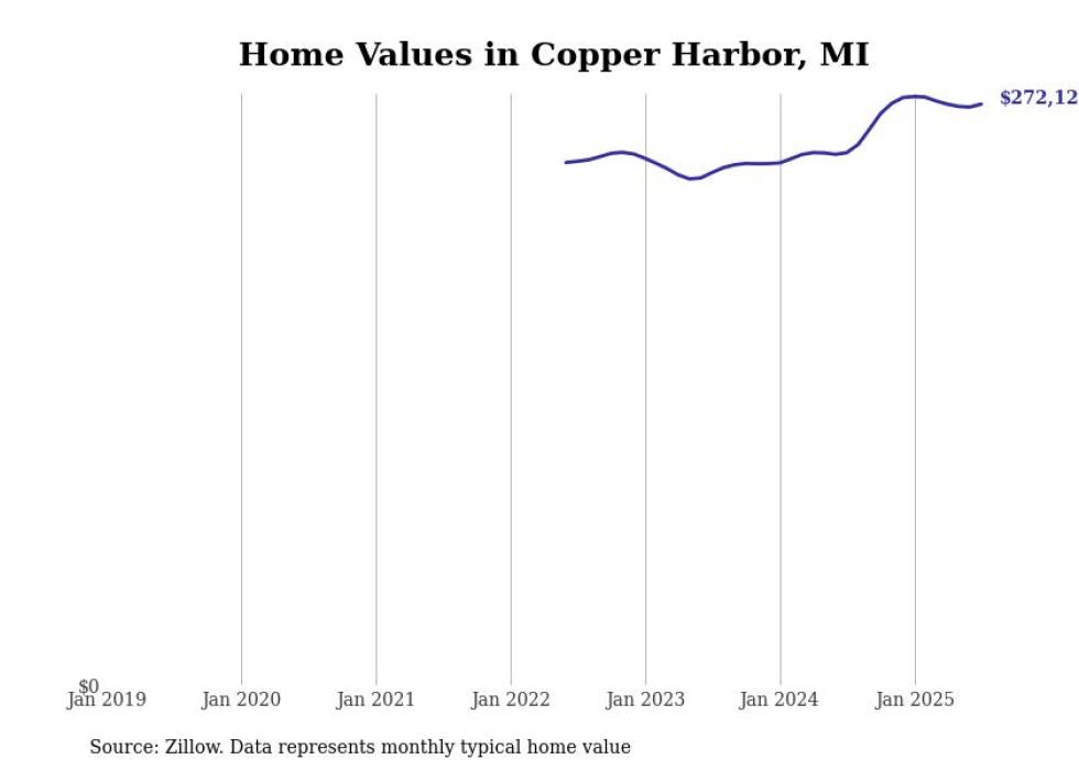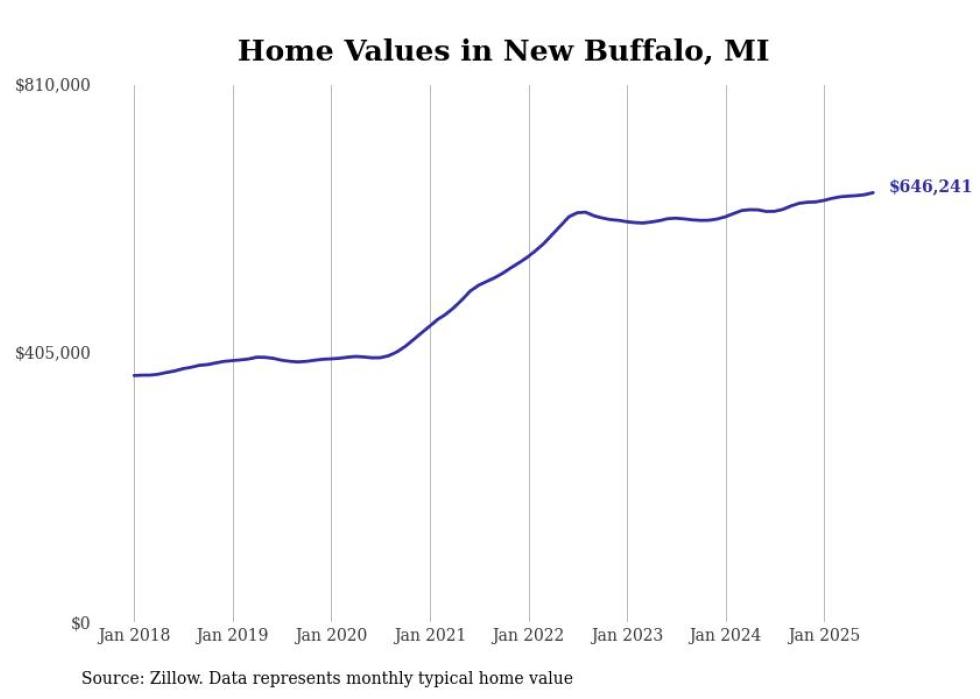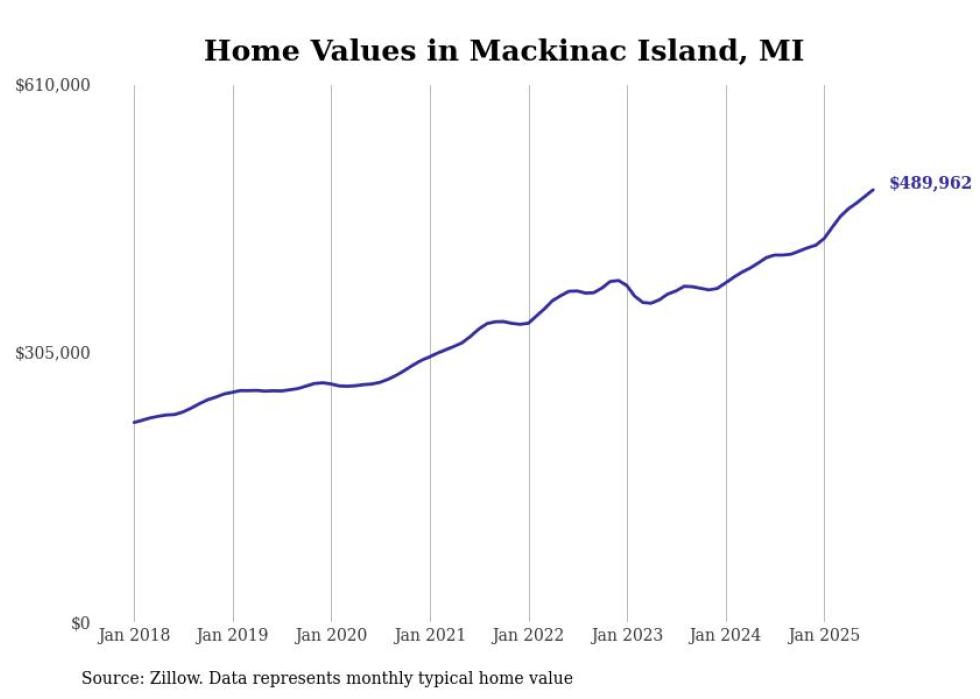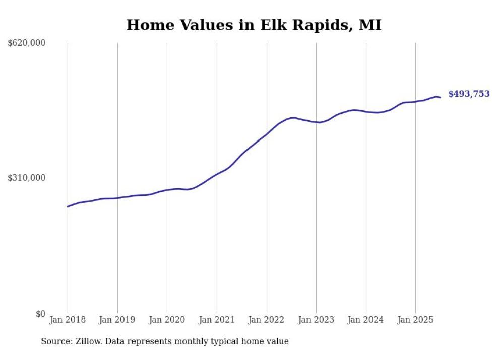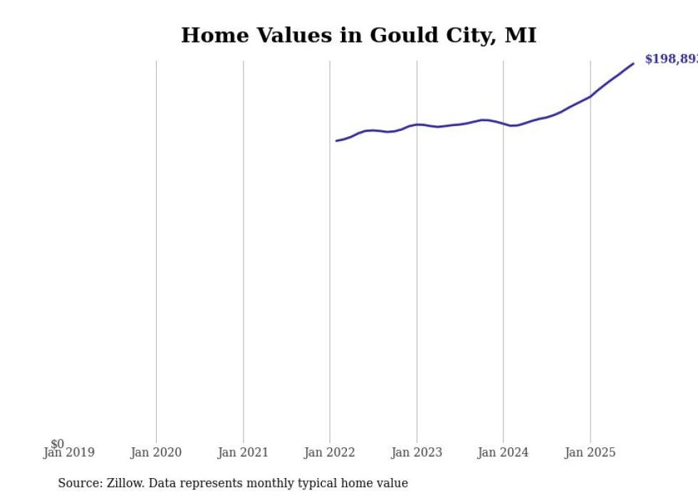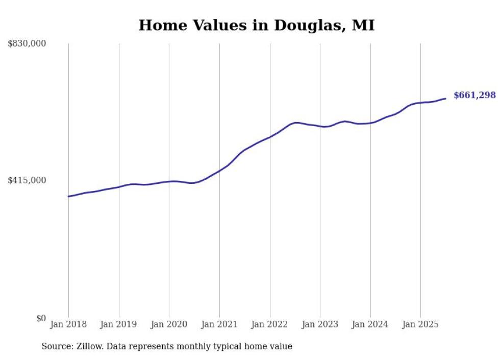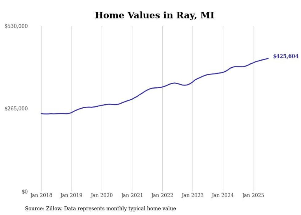 Stacker compiled a list of cities with the fastest-growing home prices in Michigan using data from Zillow. Cities are ranked by the dollar change in the Zillow Home Values Index for all homes from the 12 months ending July 2025. The charts in this story were created automatically using Matplotlib. Data was available for 50 cities and towns in Michigan.
