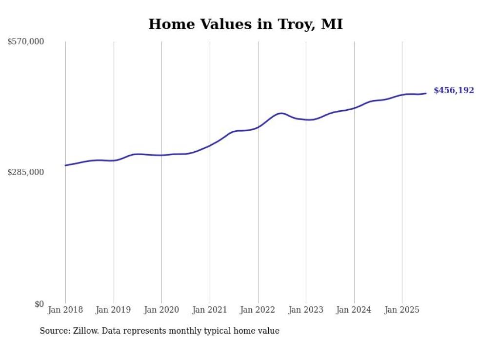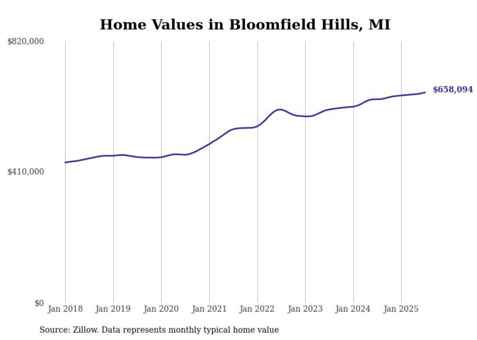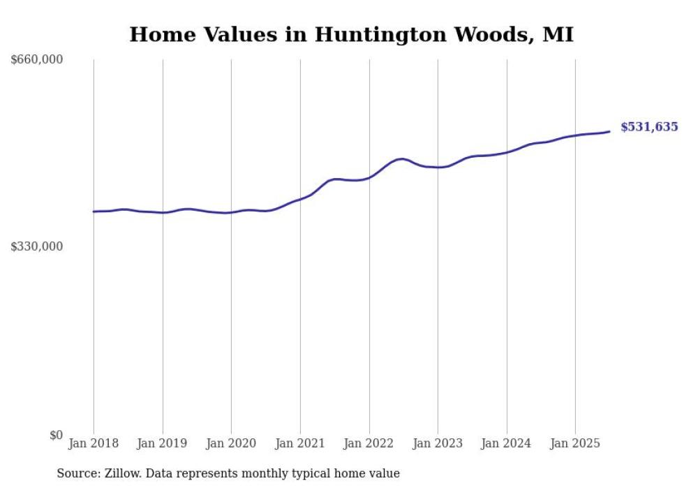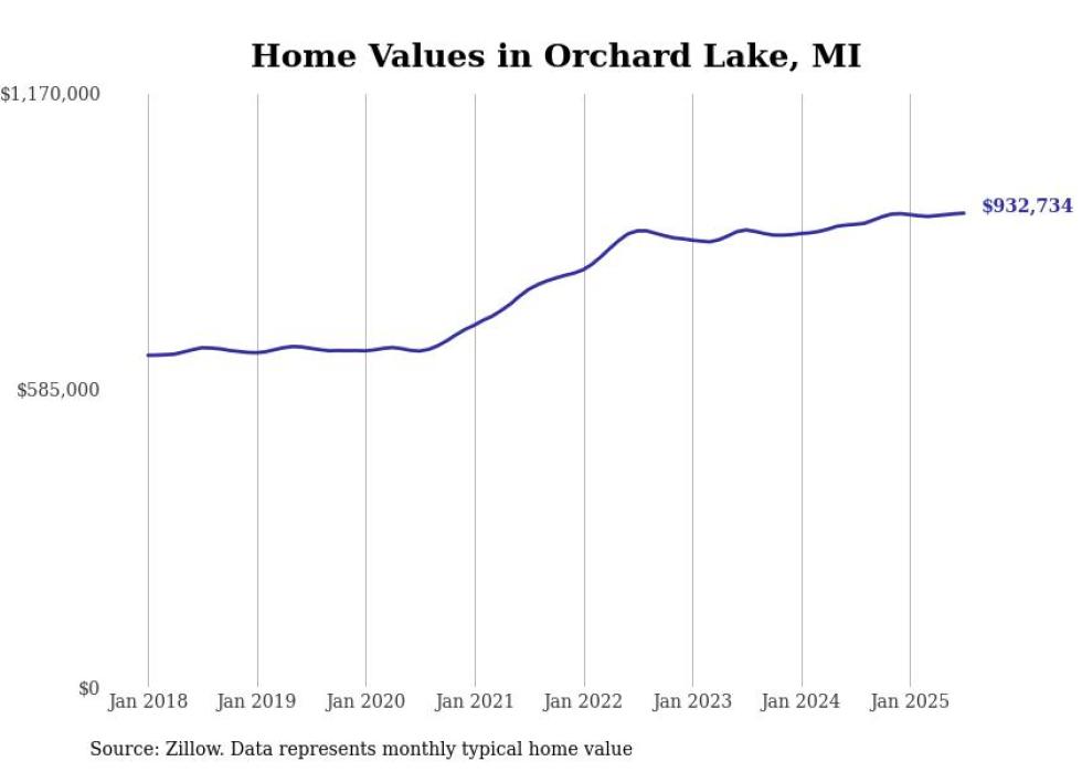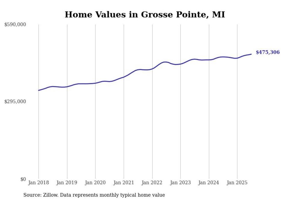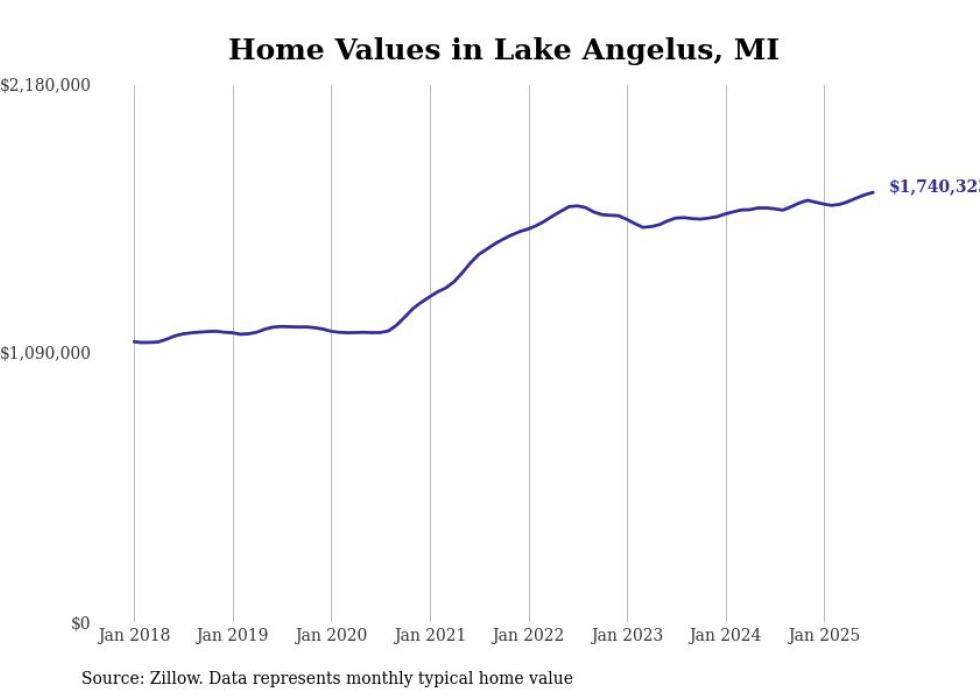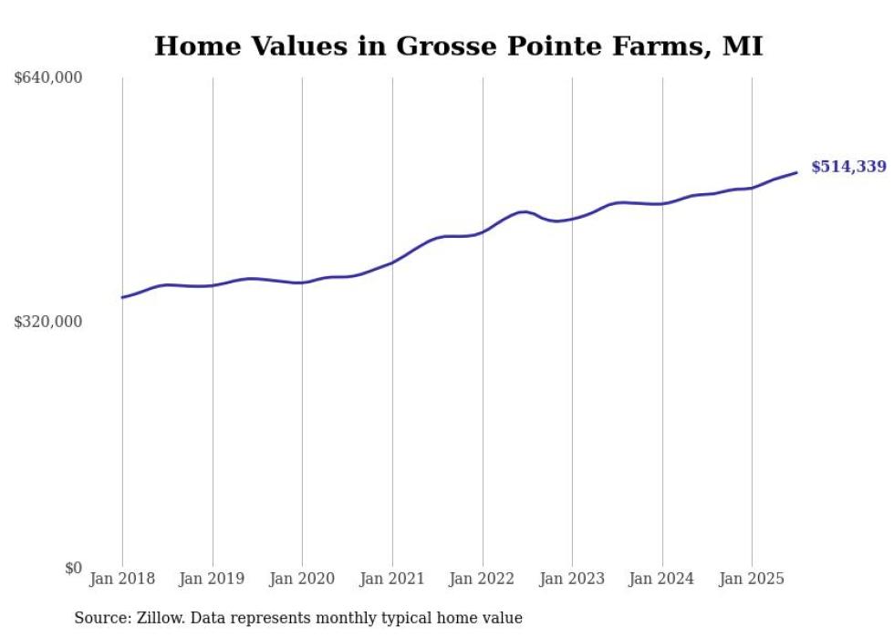 Stacker compiled a list of cities with the most expensive homes in the Detroit metro area using data from Zillow. Charts show the monthly typical home value since January 2018. Data was available for 150 cities and towns.