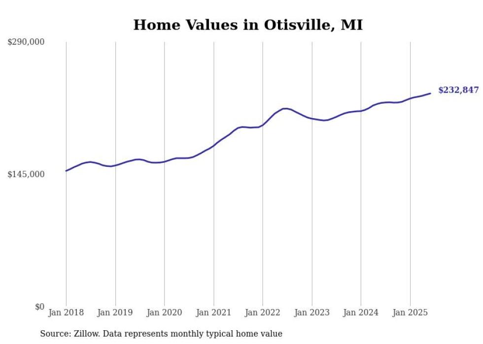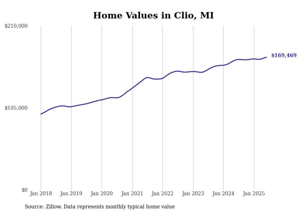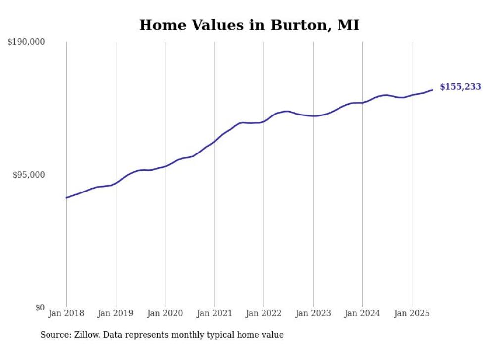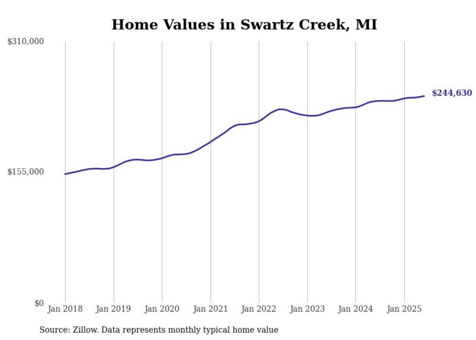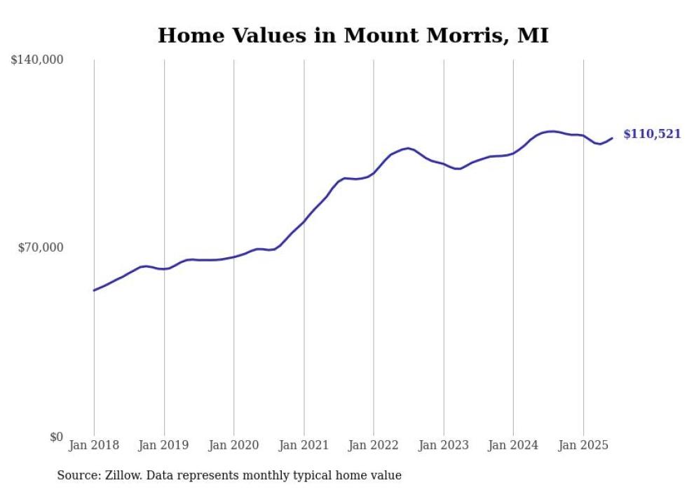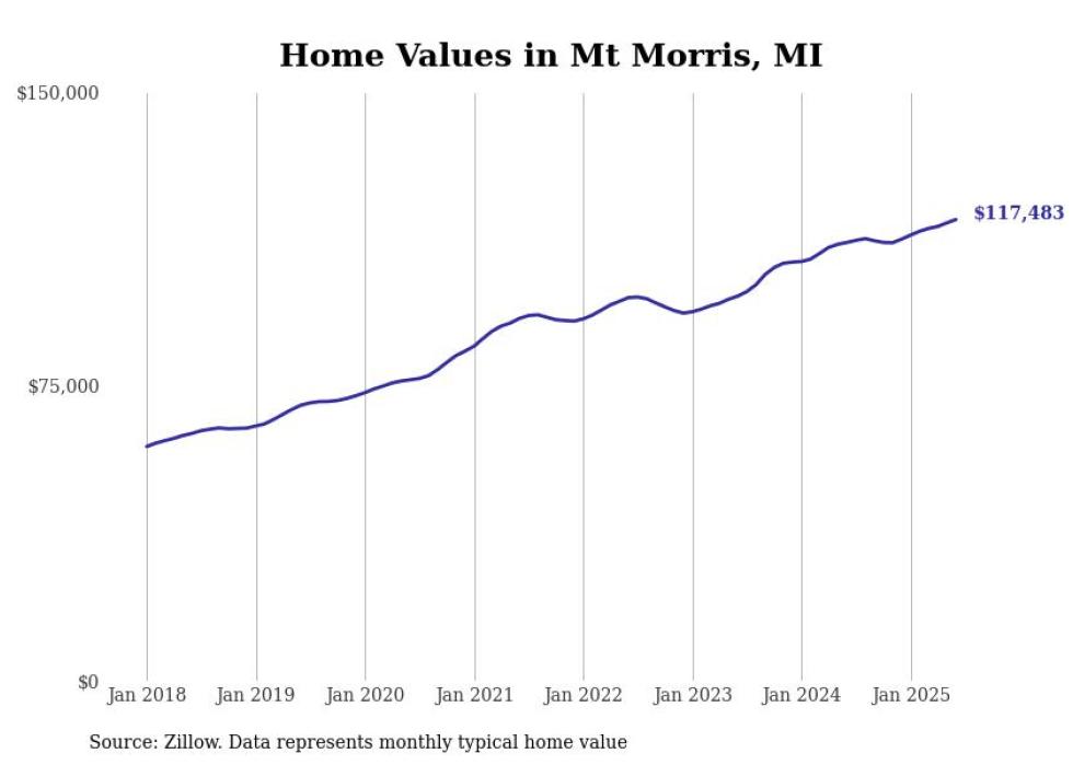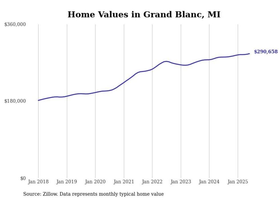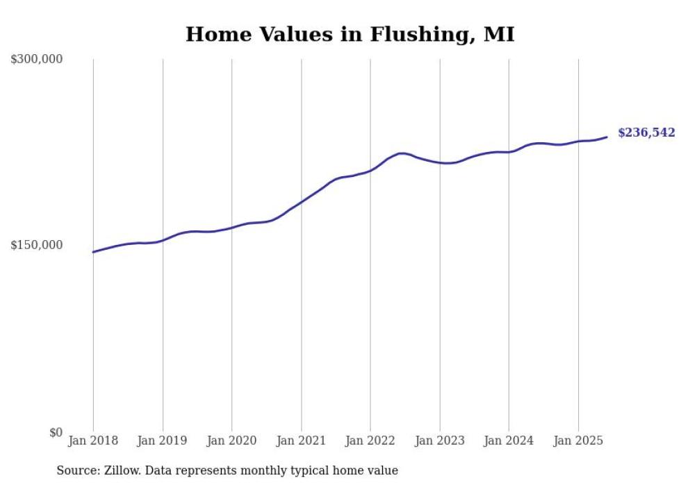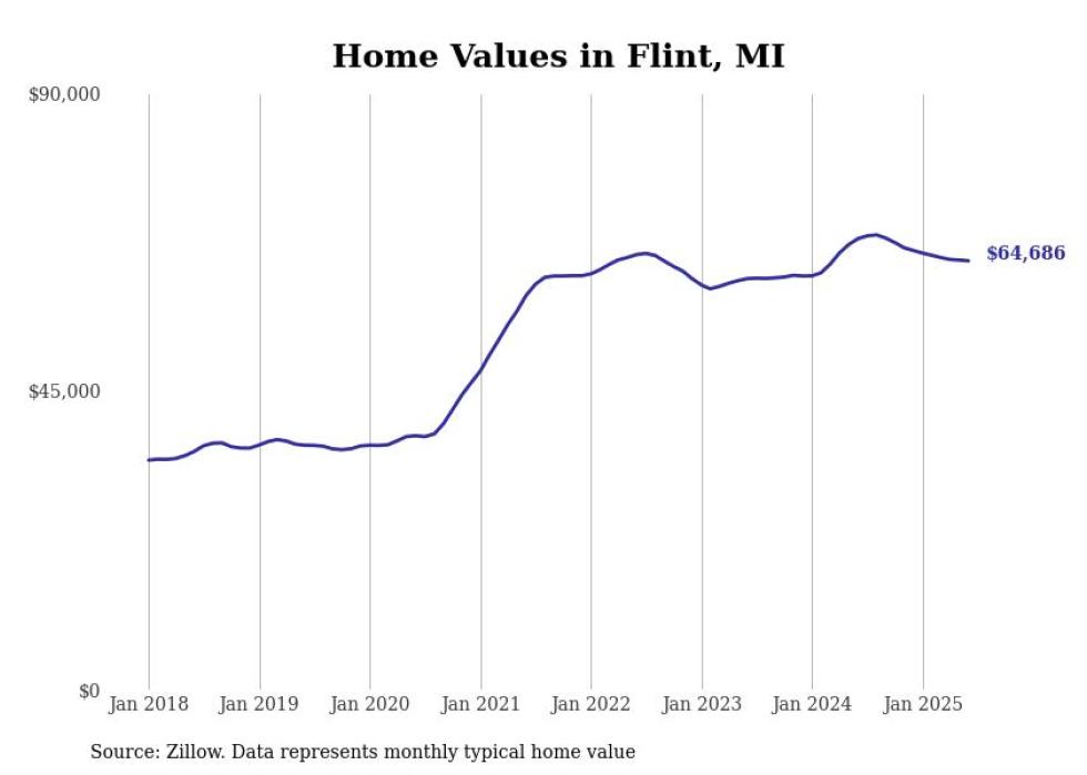 Stacker compiled a list of cities with the most expensive homes in the Flint, MI metro area using data from Zillow. Charts show the monthly typical home value since January 2018.