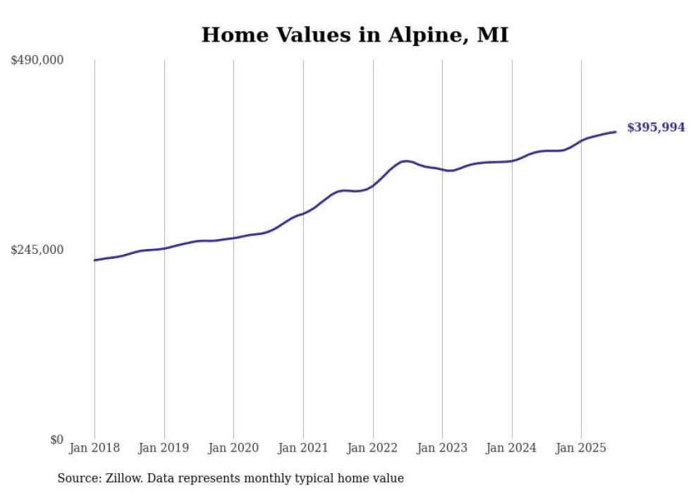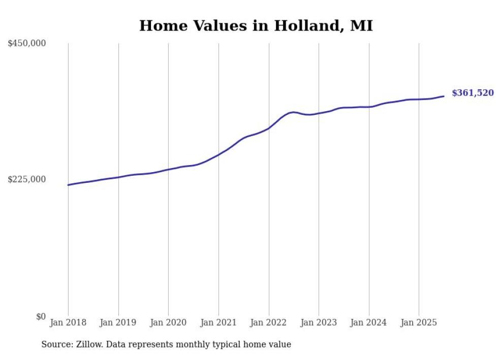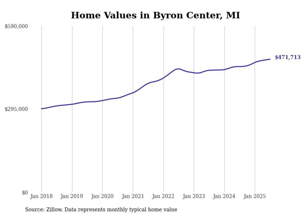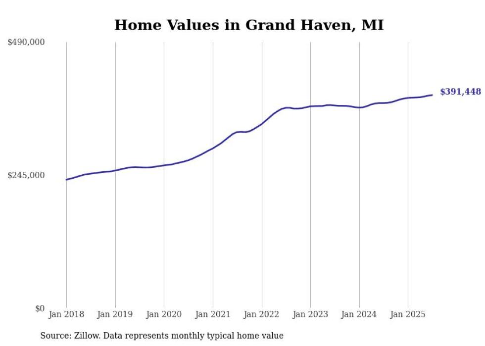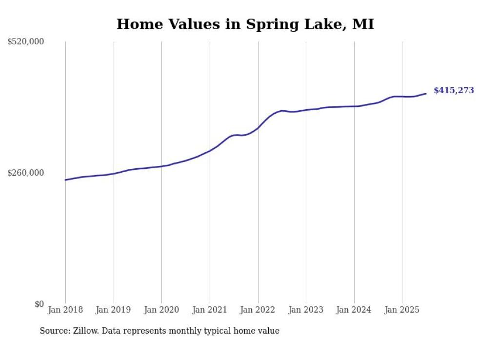 Stacker compiled a list of cities with the most expensive homes in the Grand Rapids metro area using data from Zillow. Charts show the monthly typical home value since January 2018. Data was available for 63 cities and towns.