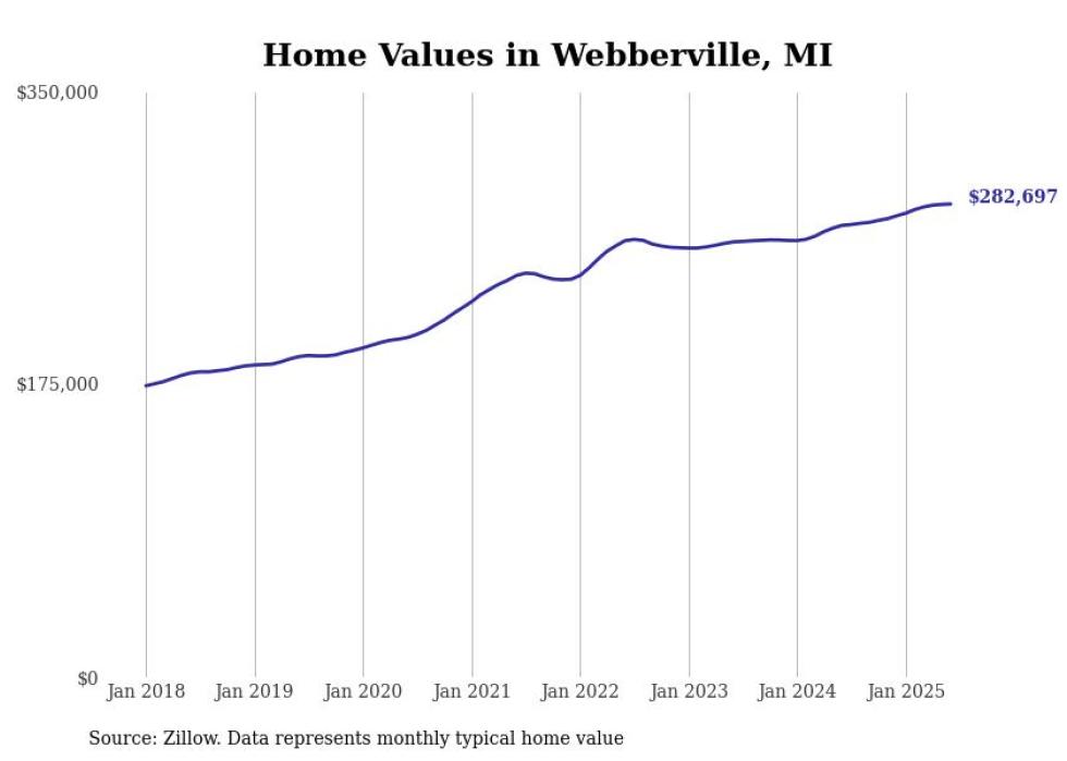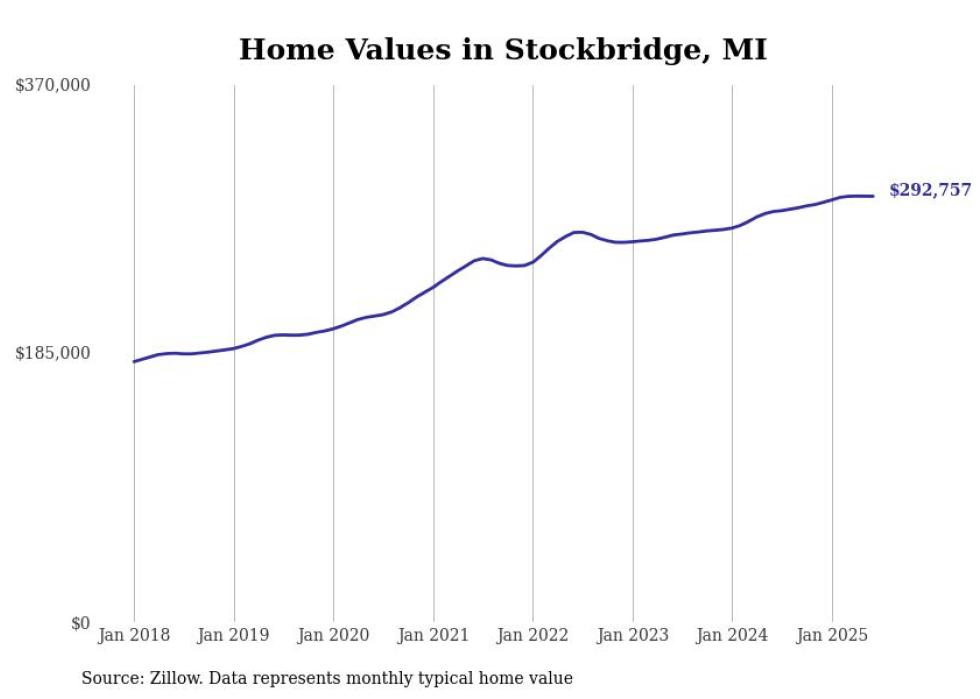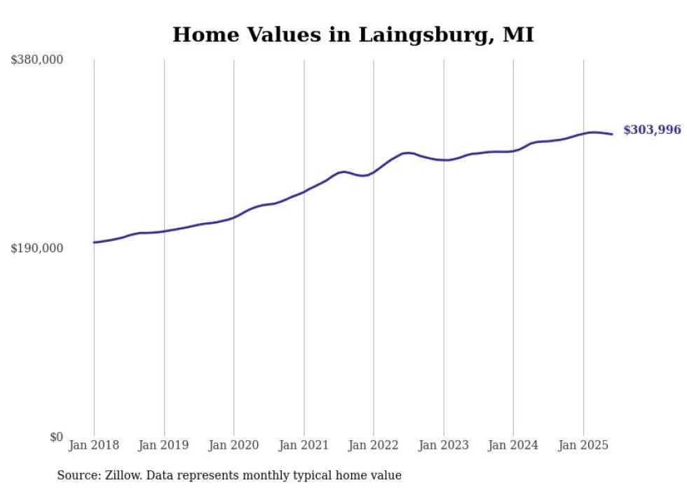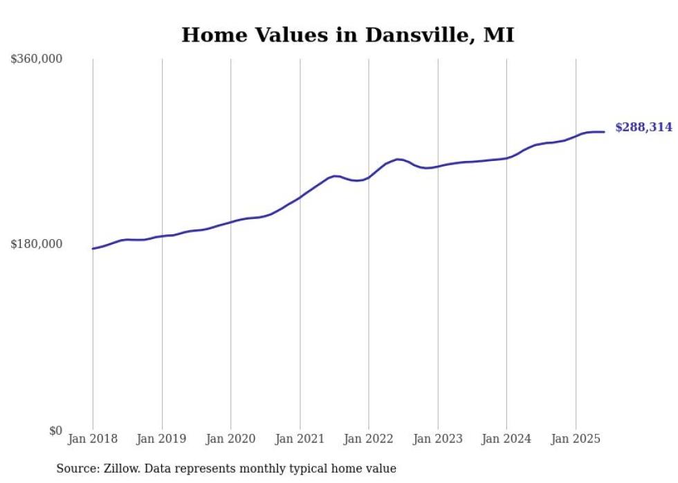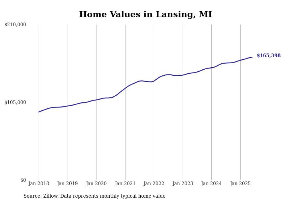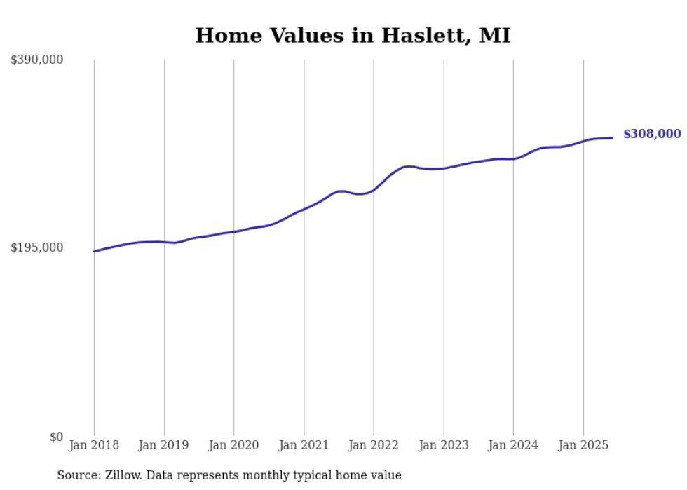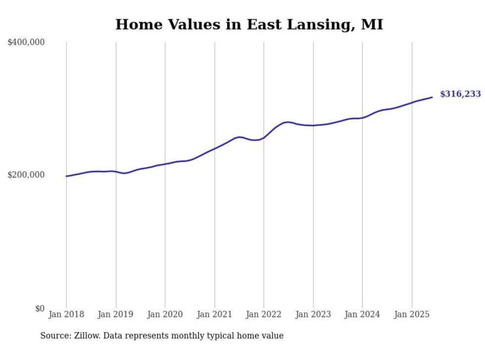 Stacker compiled a list of cities with the most expensive homes in the Lansing-East Lansing, MI metro area using data from Zillow. Charts show the monthly typical home value since January 2018.