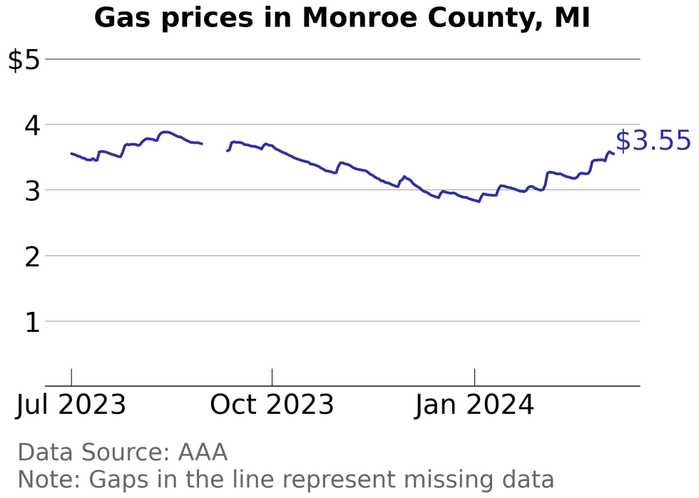 Stacker compiled statistics on gas prices in Monroe County using data from AAA. Gas prices are current as of March 11.