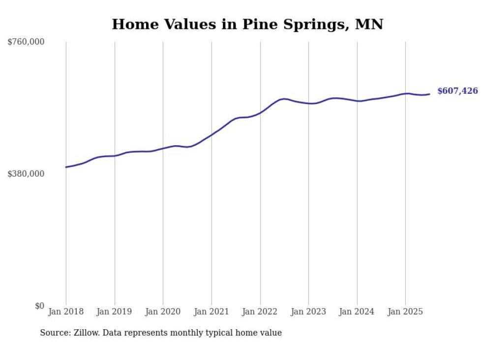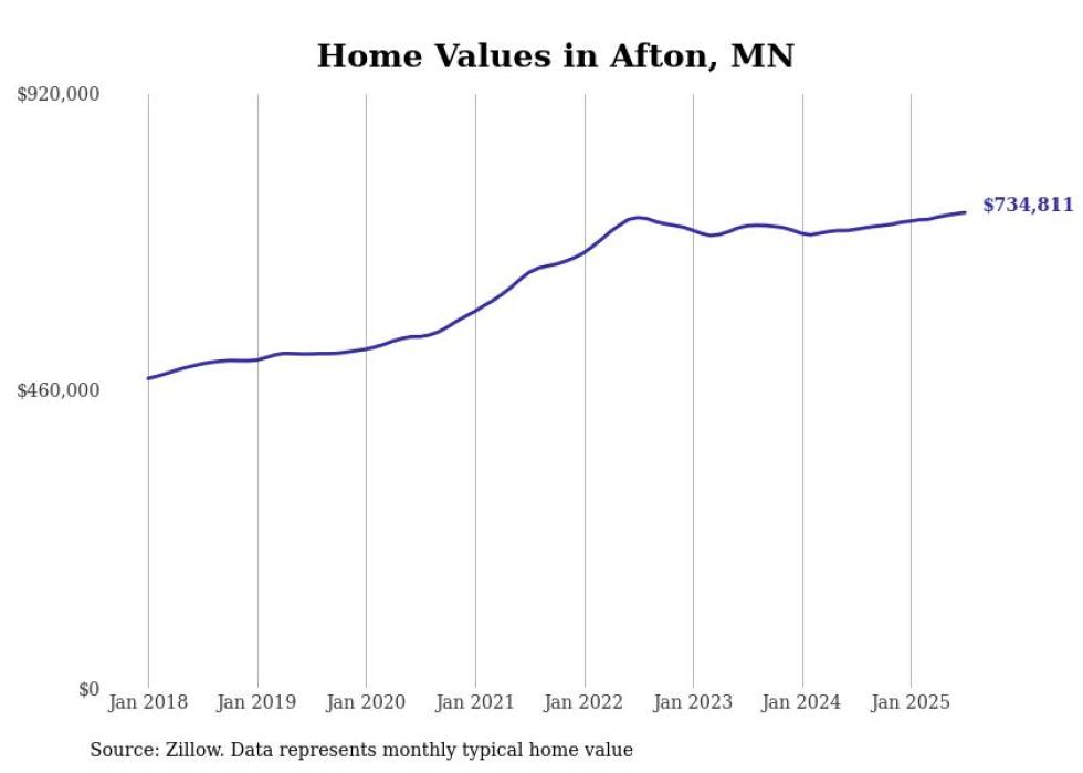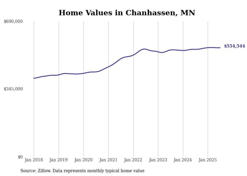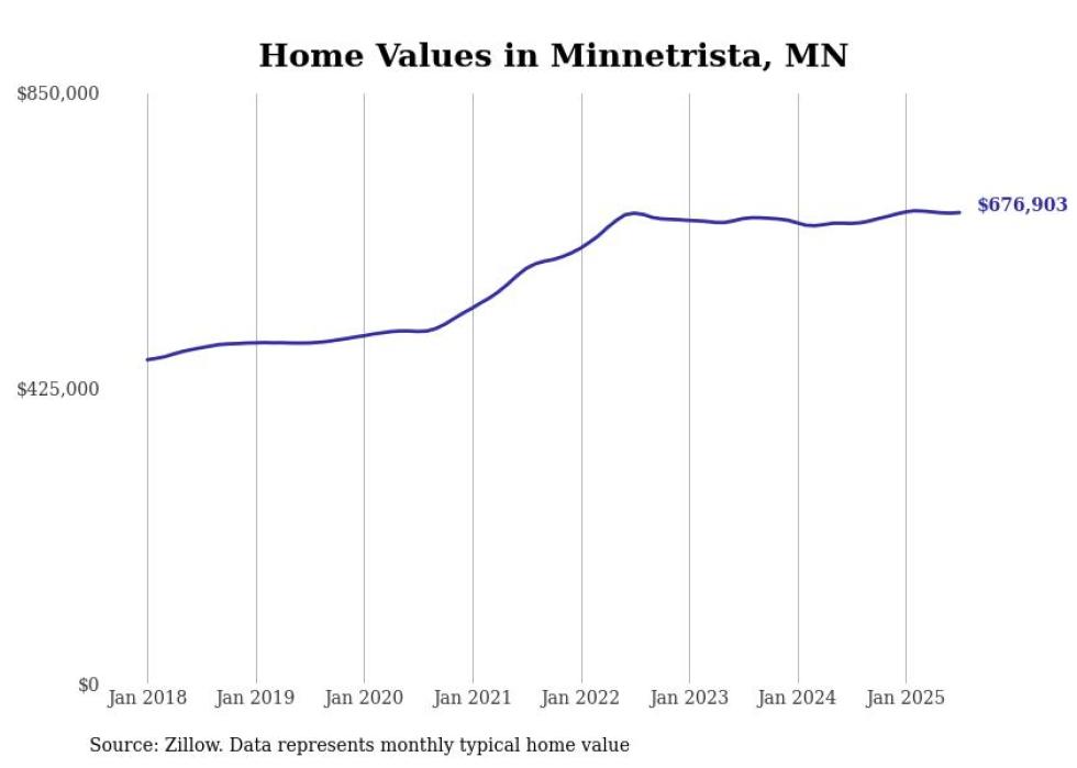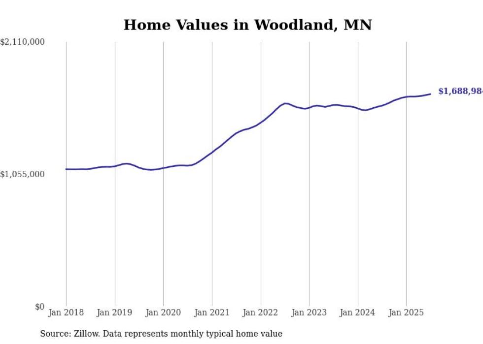 Stacker compiled a list of cities with the most expensive homes in the Minneapolis metro area using data from Zillow. Charts show the monthly typical home value since January 2018. Data was available for 206 cities and towns.