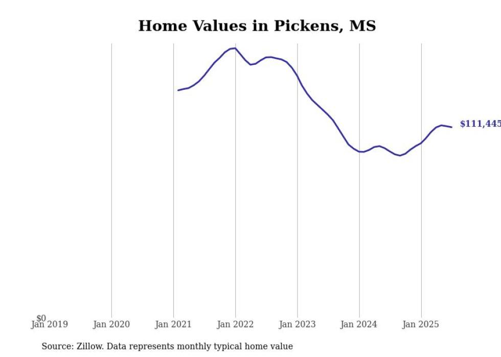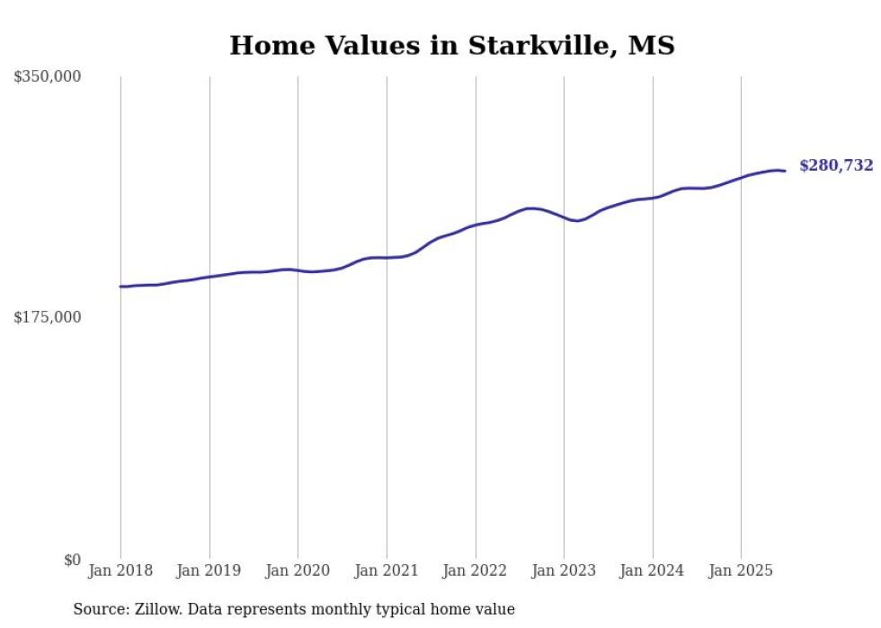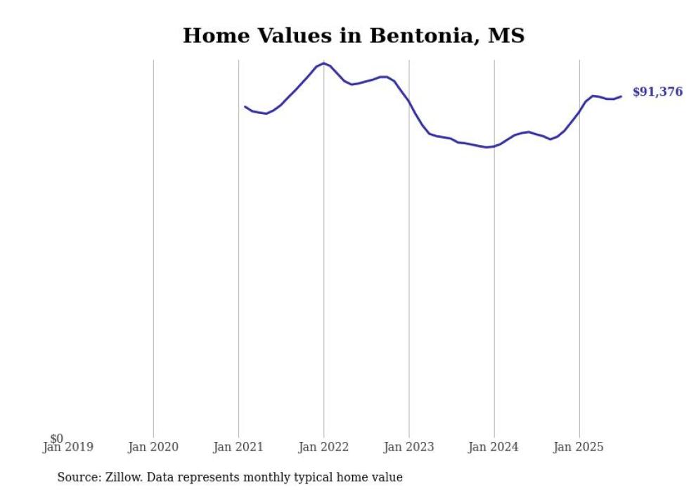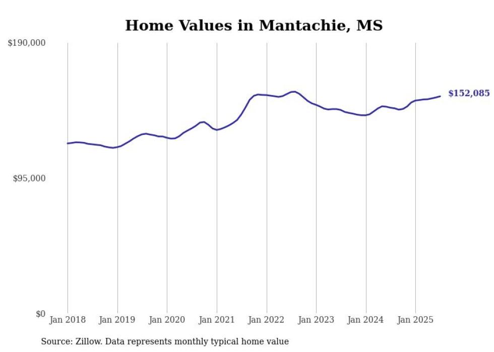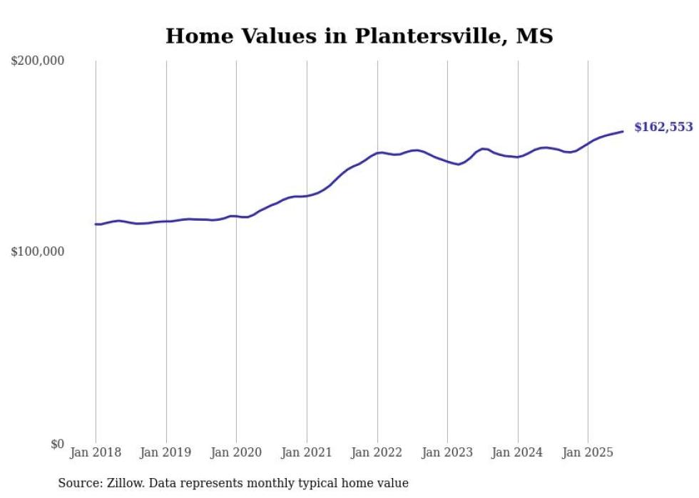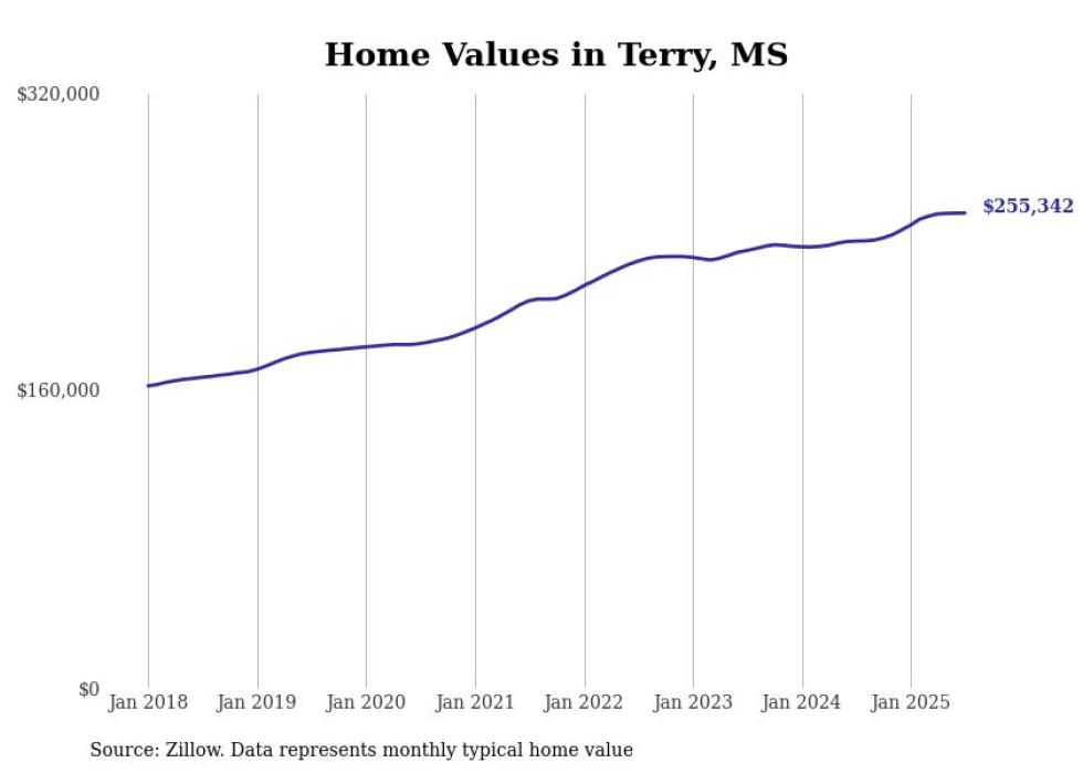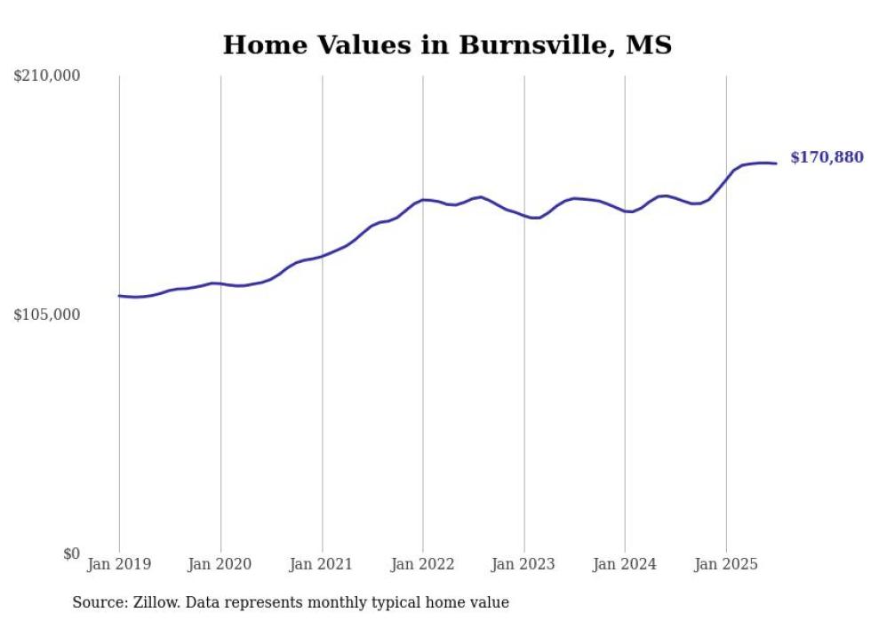 Stacker compiled a list of cities with the fastest-growing home prices in Mississippi using data from Zillow. Cities are ranked by the dollar change in the Zillow Home Values Index for all homes from the 12 months ending July 2025. The charts in this story were created automatically using Matplotlib. Data was available for 50 cities and towns in Mississippi.