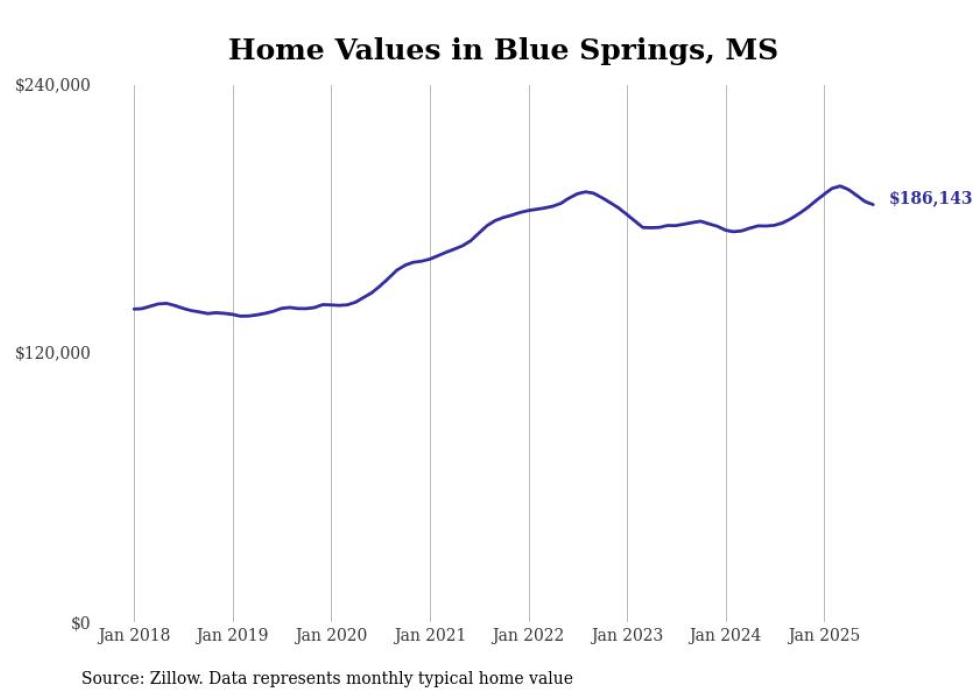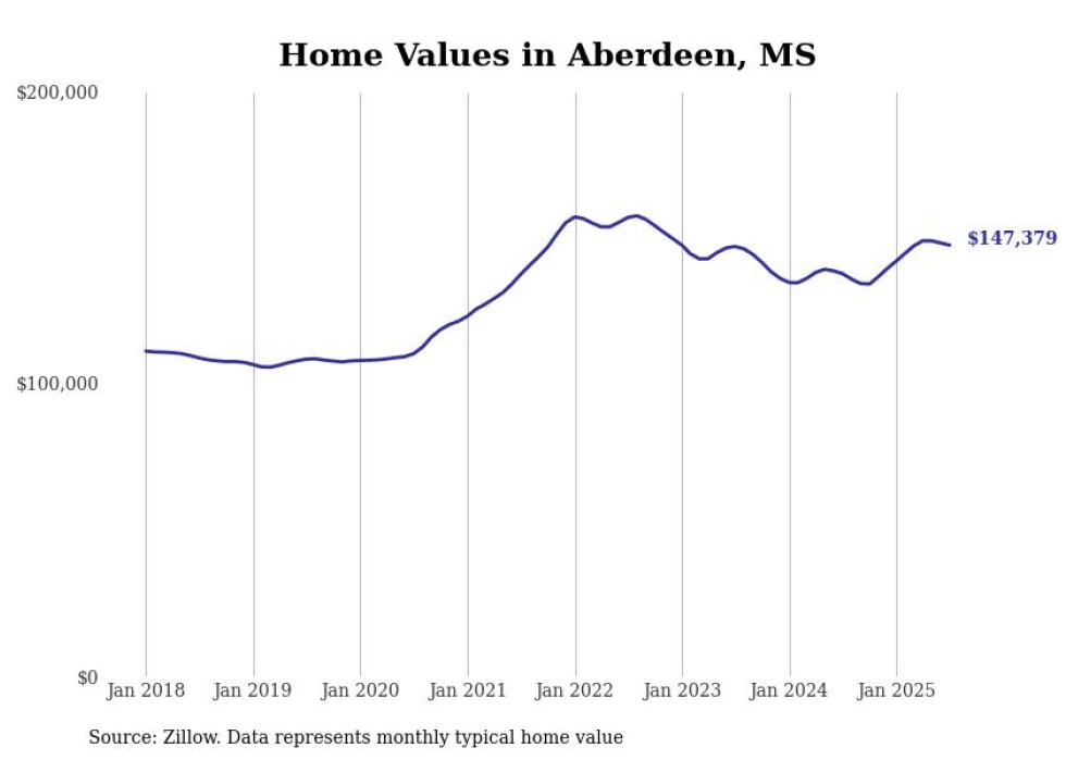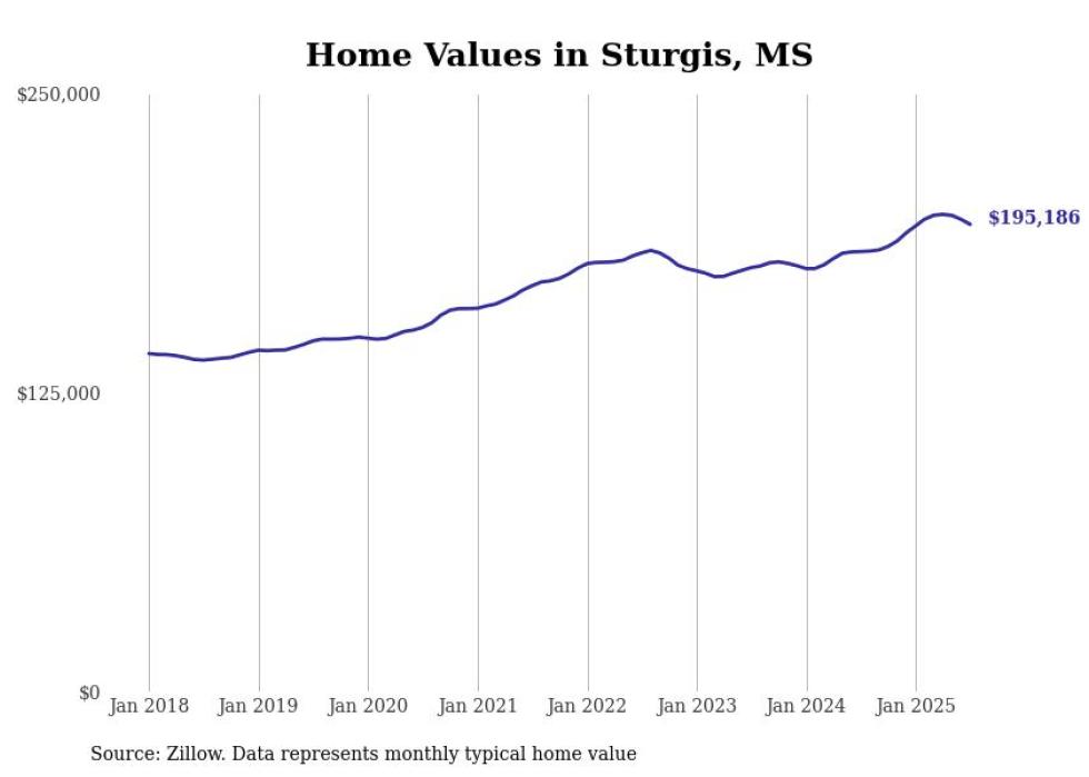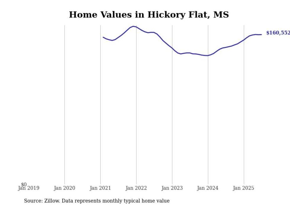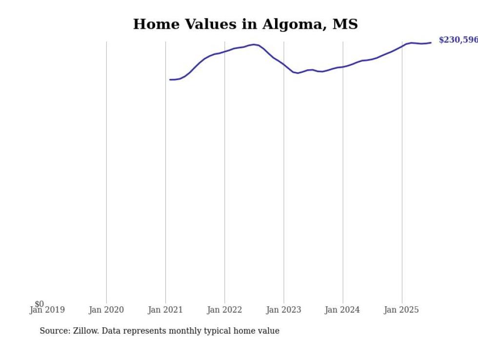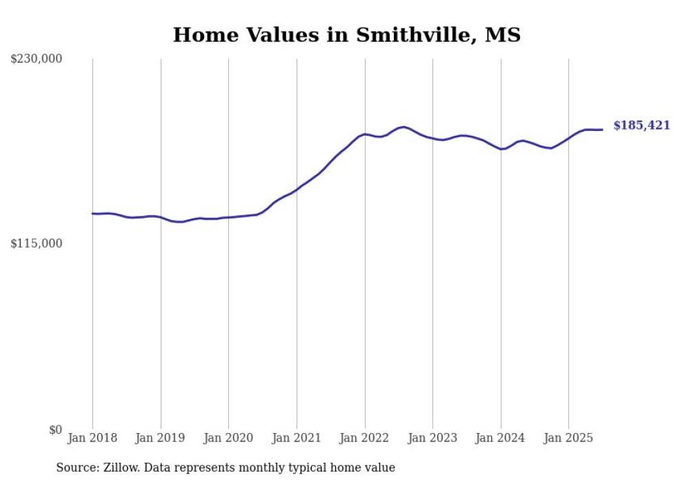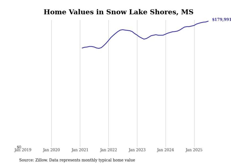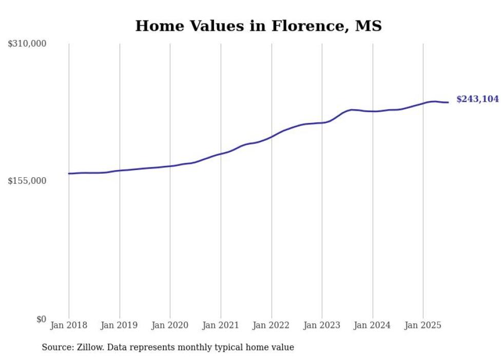 Stacker compiled a list of cities with the fastest-growing home prices in Mississippi using data from Zillow. Cities are ranked by the dollar change in the Zillow Home Values Index for all homes from the 12 months ending July 2025. The charts in this story were created automatically using Matplotlib. Data was available for 50 cities and towns in Mississippi.