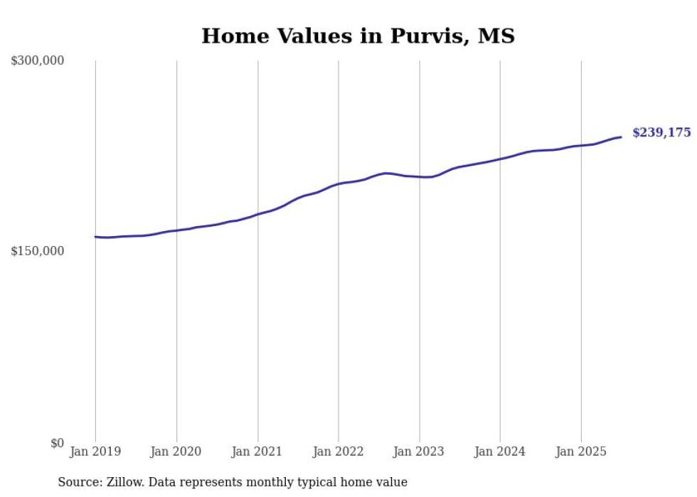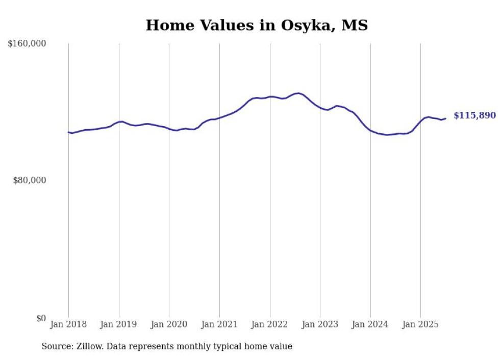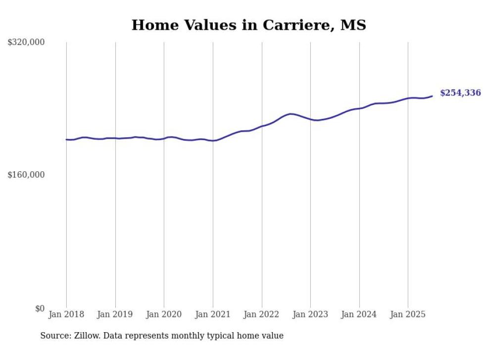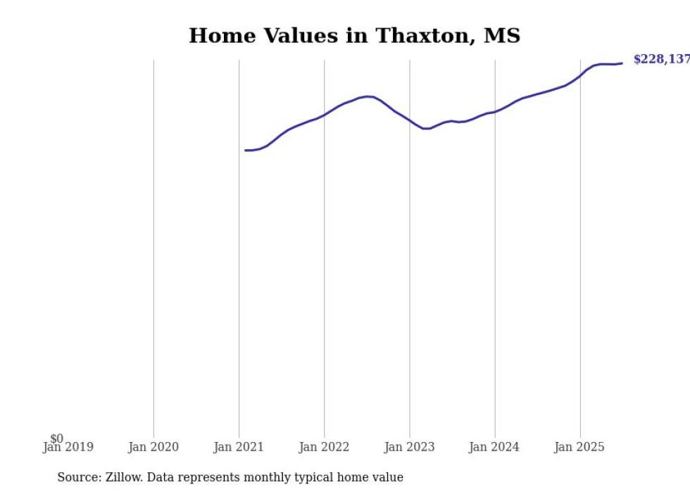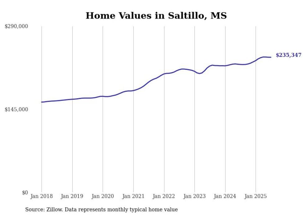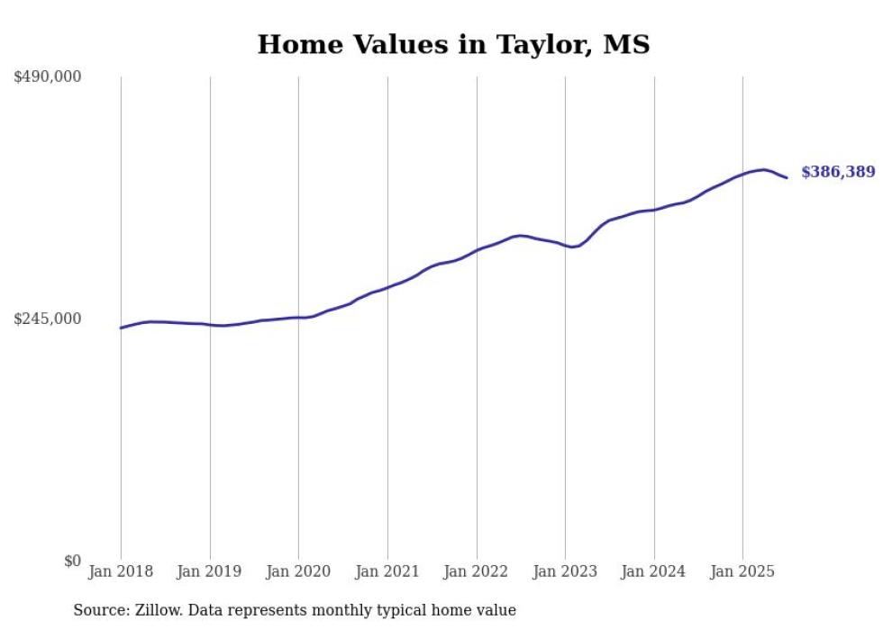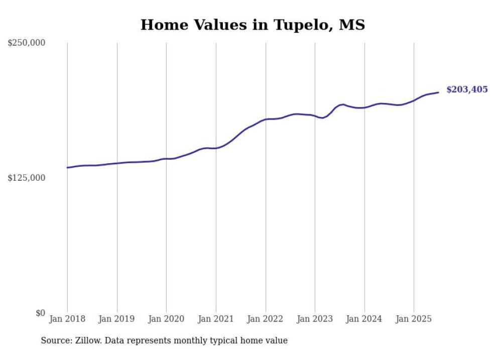 Stacker compiled a list of cities with the fastest-growing home prices in Mississippi using data from Zillow. Cities are ranked by the dollar change in the Zillow Home Values Index for all homes from the 12 months ending July 2025. The charts in this story were created automatically using Matplotlib. Data was available for 50 cities and towns in Mississippi.