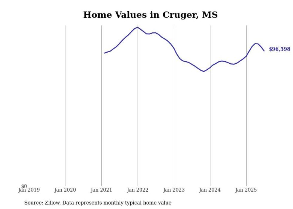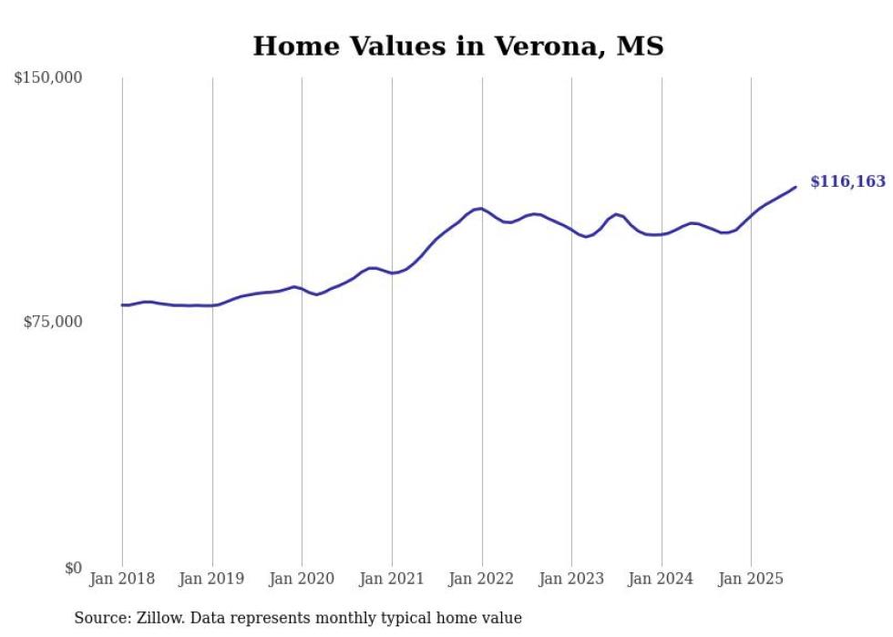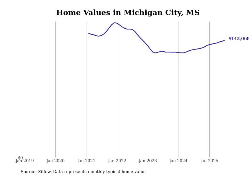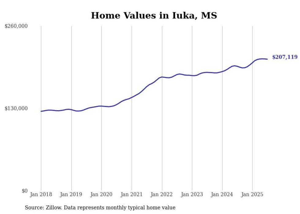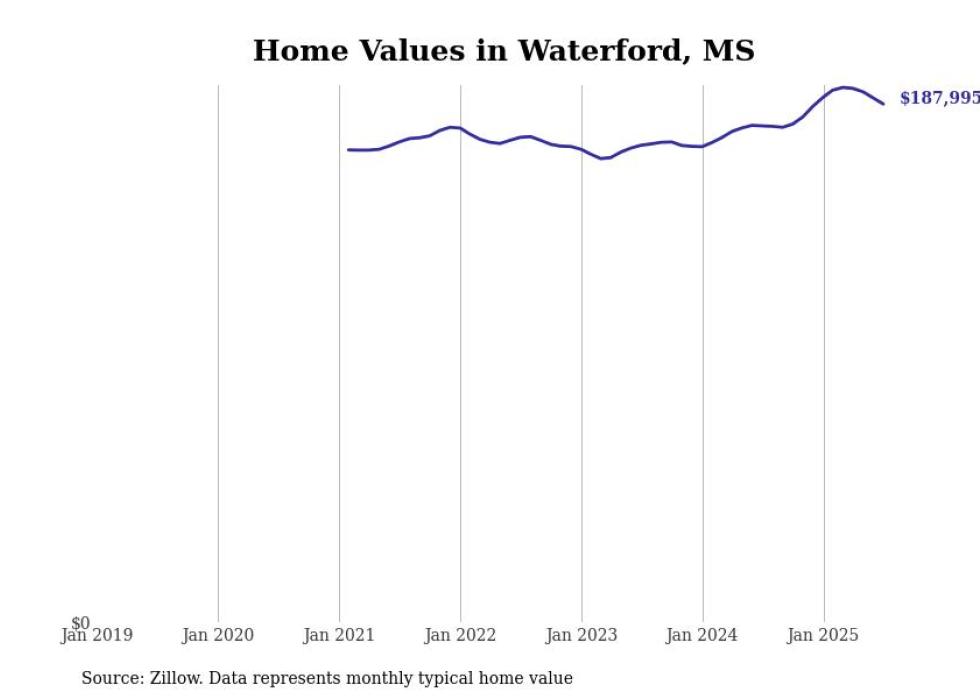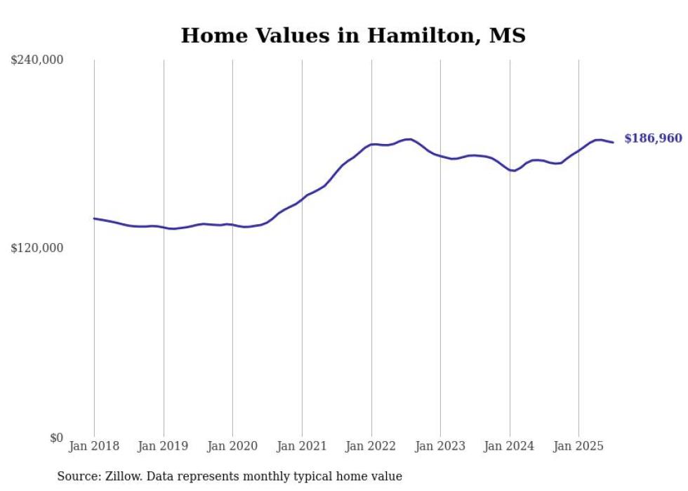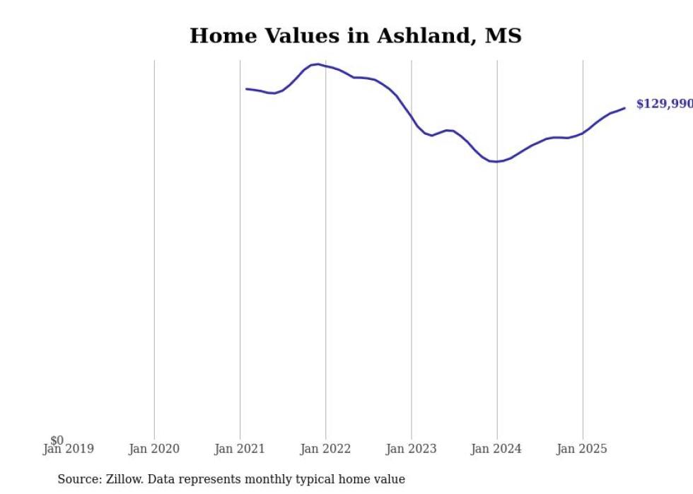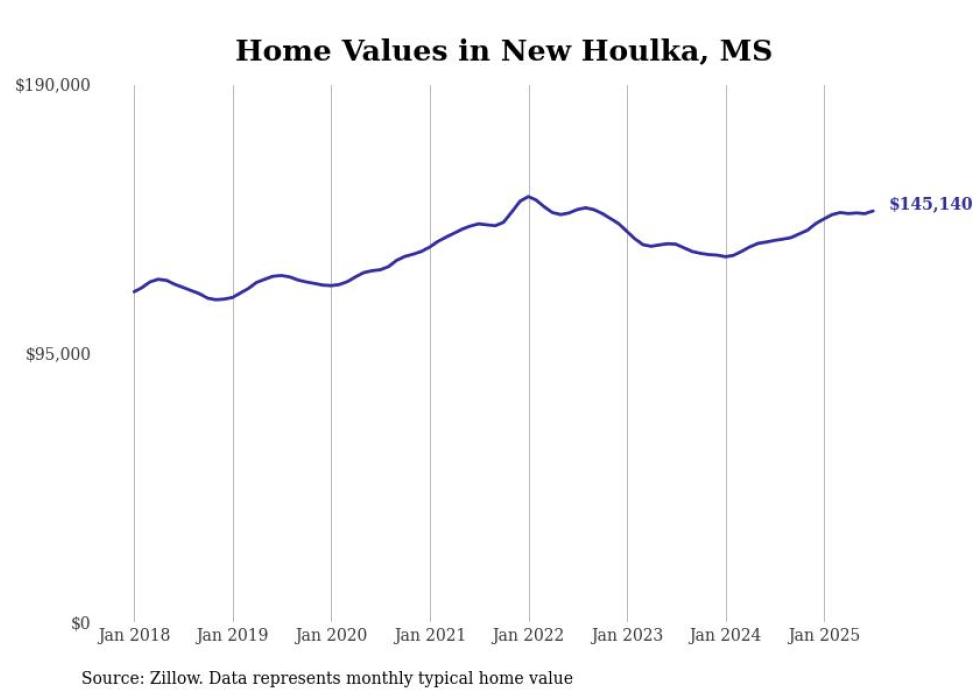 Stacker compiled a list of cities with the fastest-growing home prices in Mississippi using data from Zillow. Cities are ranked by the dollar change in the Zillow Home Values Index for all homes from the 12 months ending July 2025. The charts in this story were created automatically using Matplotlib. Data was available for 50 cities and towns in Mississippi.