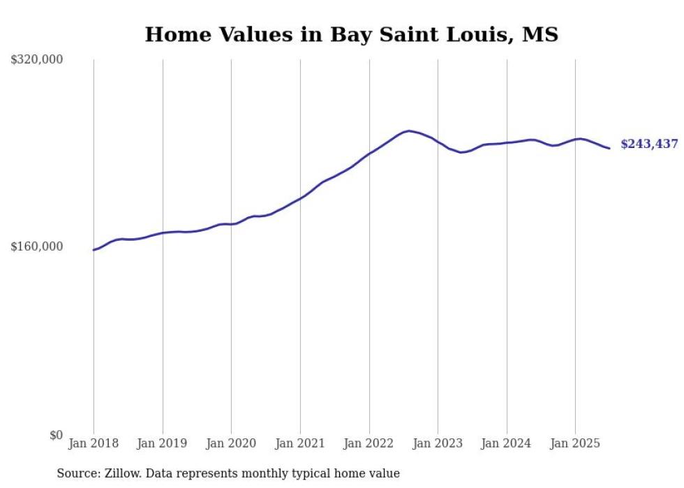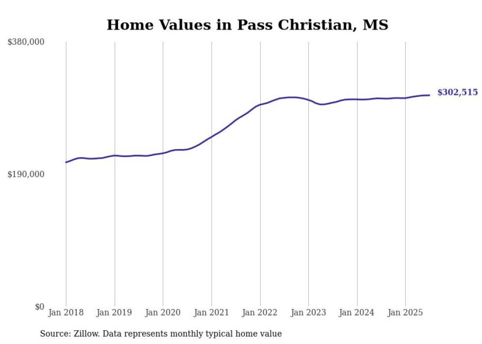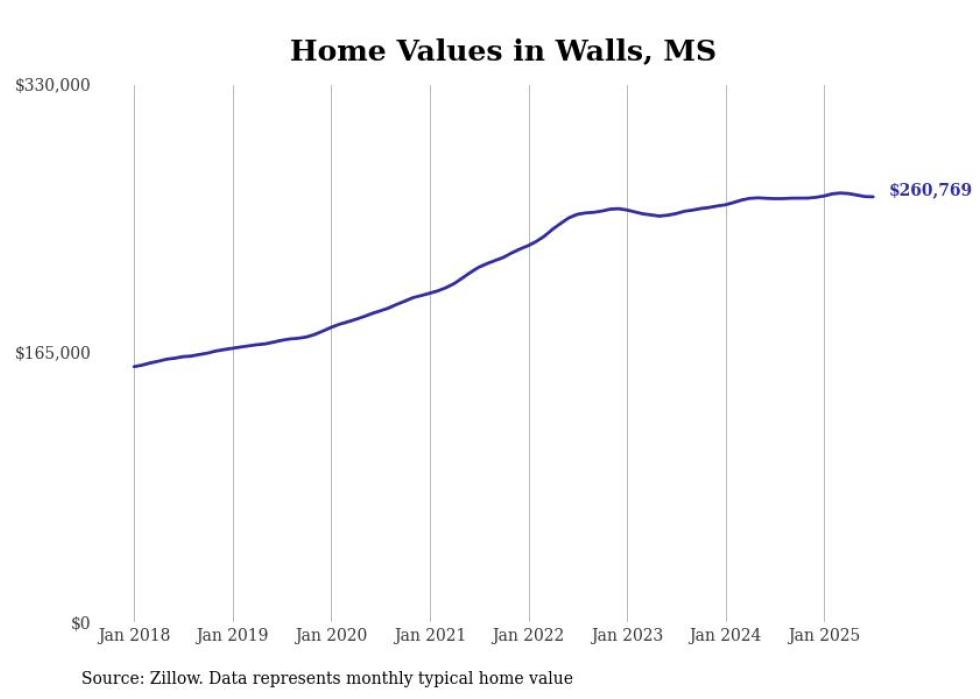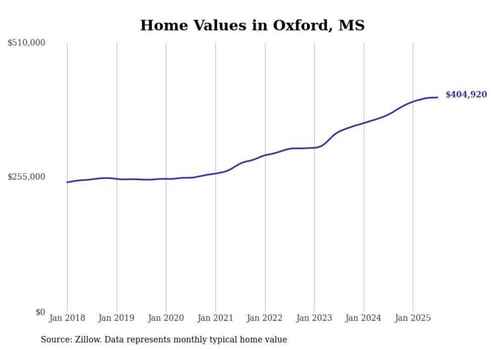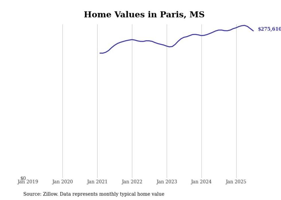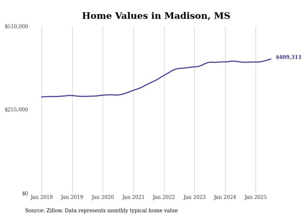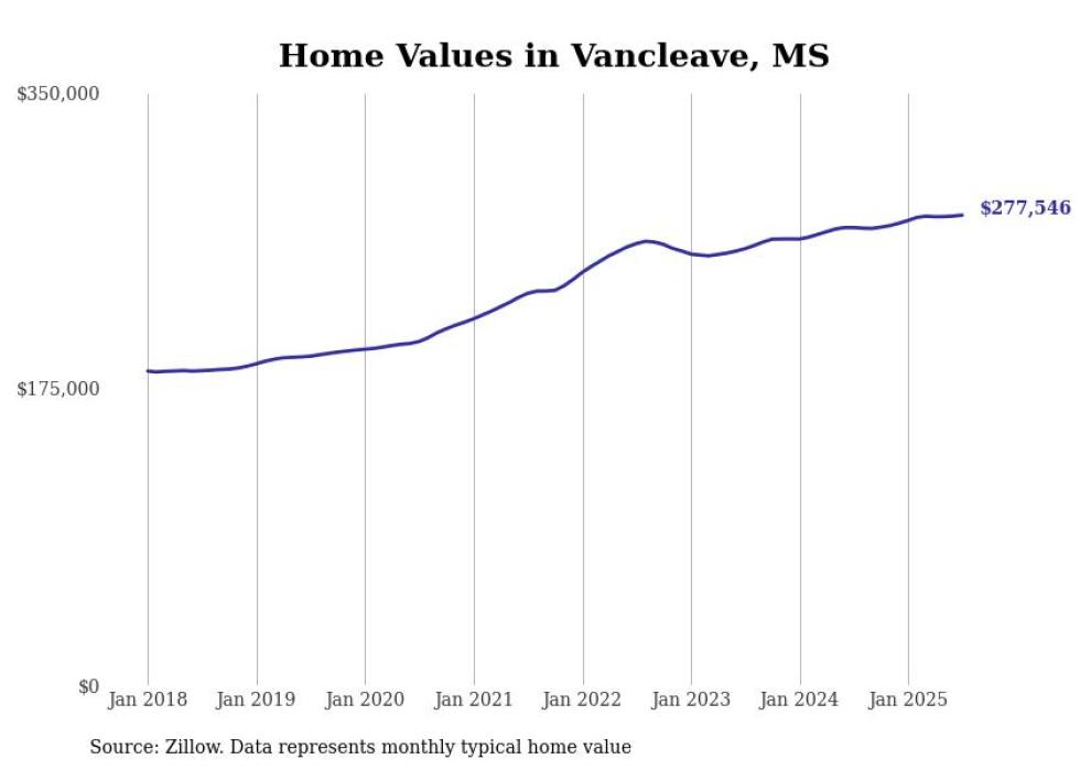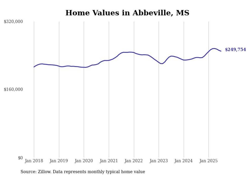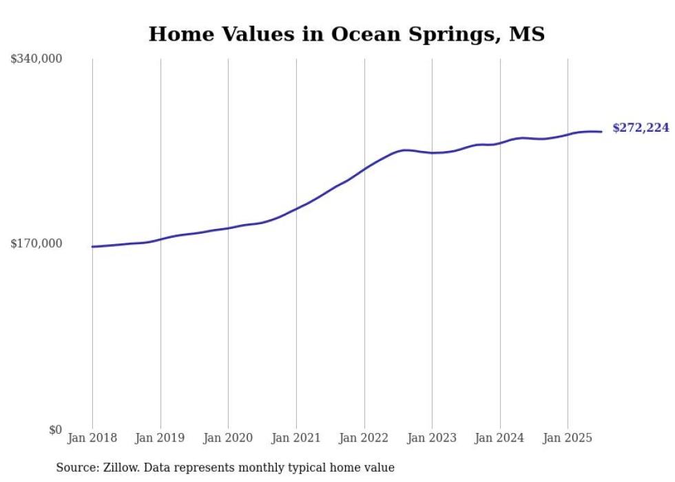 Stacker compiled a list of cities with the most expensive homes in Mississippi using data from Zillow. Cities are ranked by the Zillow Home Values Index for all homes as of July 2025. The charts in this story were created automatically using Matplotlib.