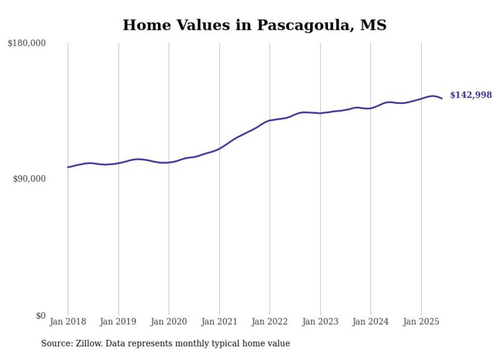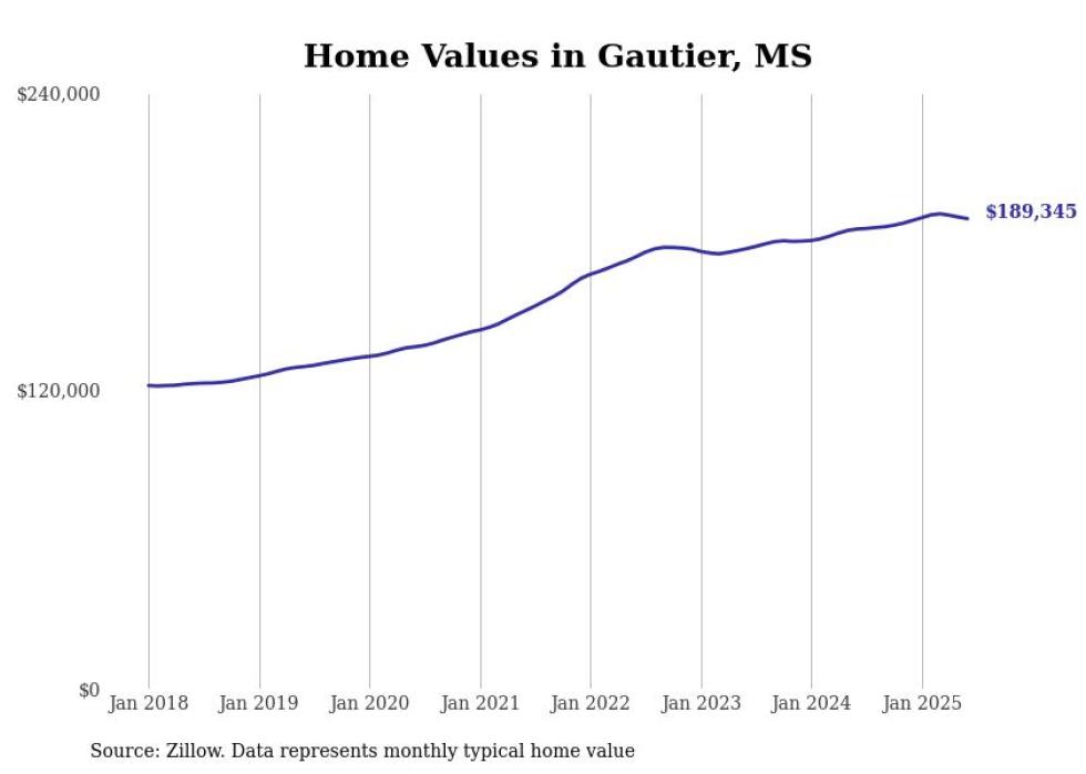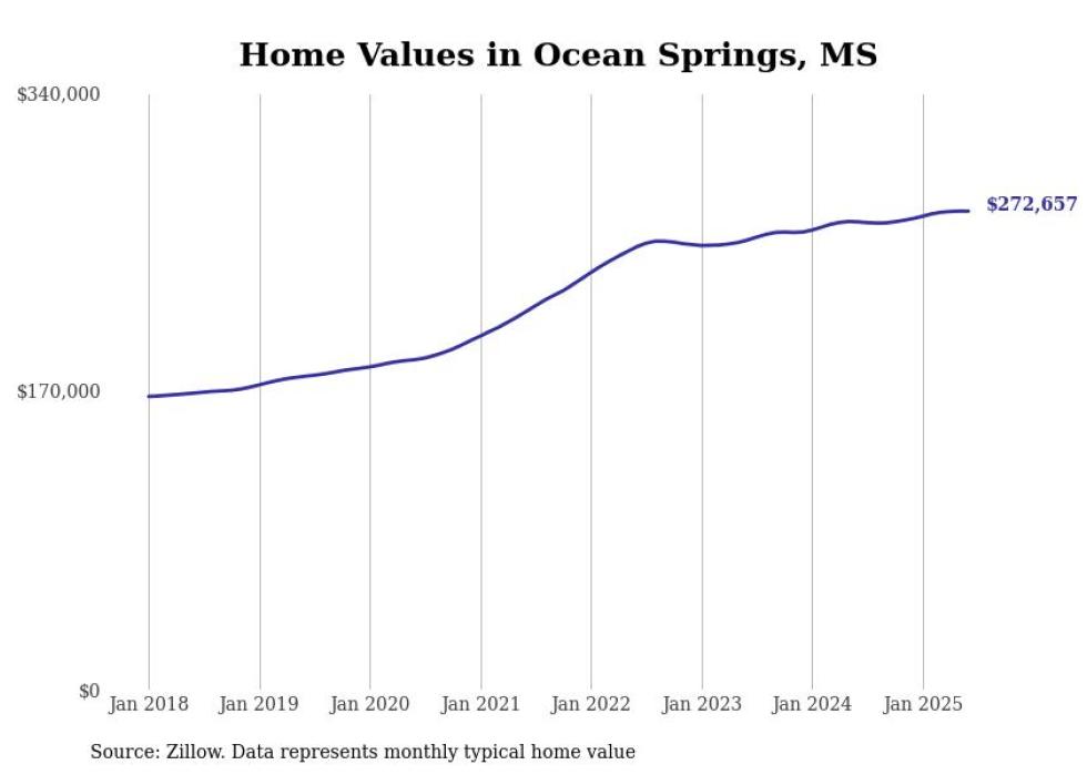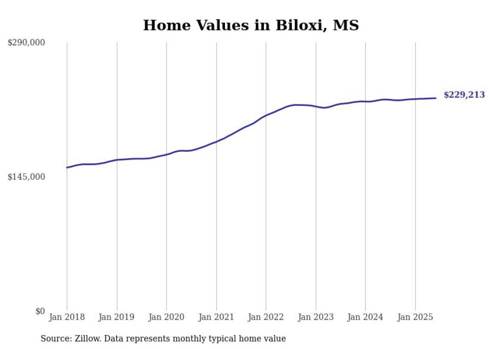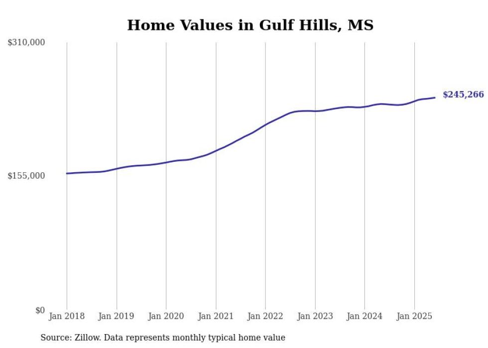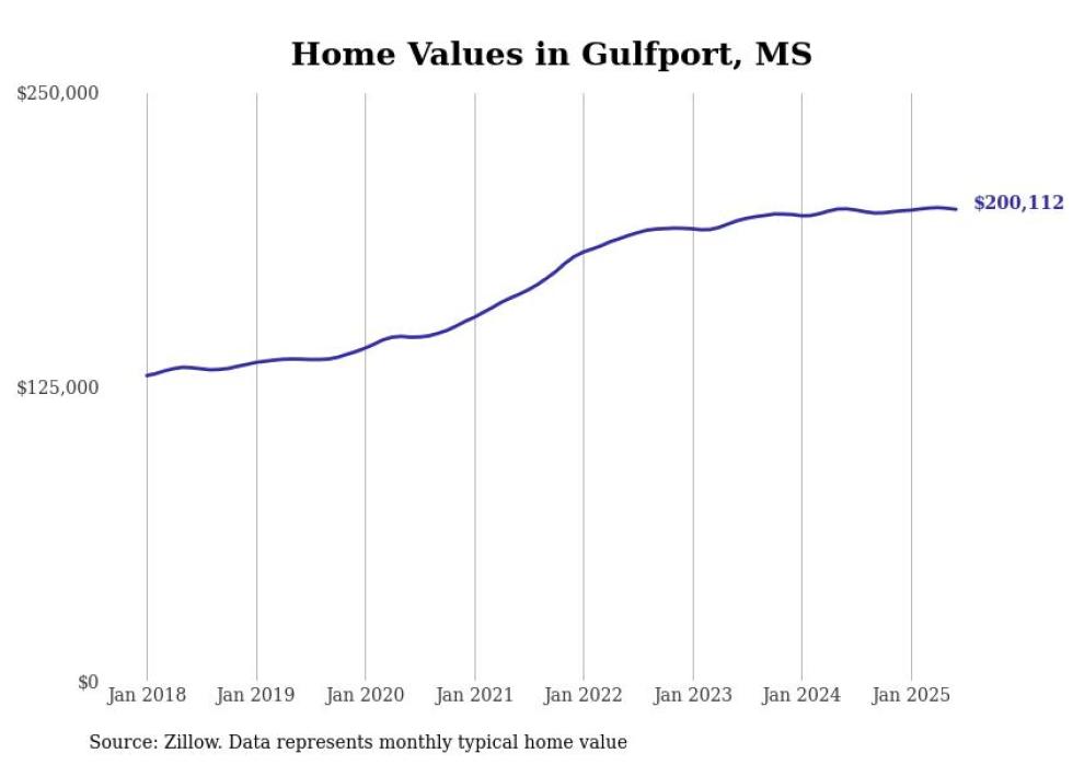 Stacker compiled a list of cities with the most expensive homes in the Gulfport-Biloxi, MS metro area using data from Zillow. Charts show the monthly typical home value since January 2018.