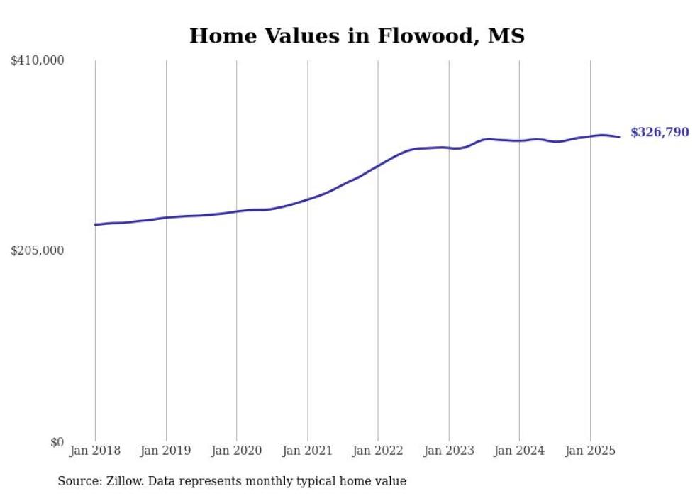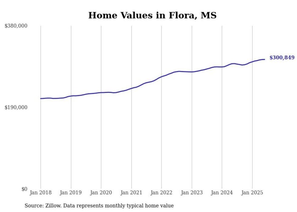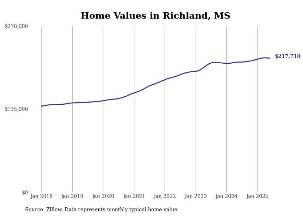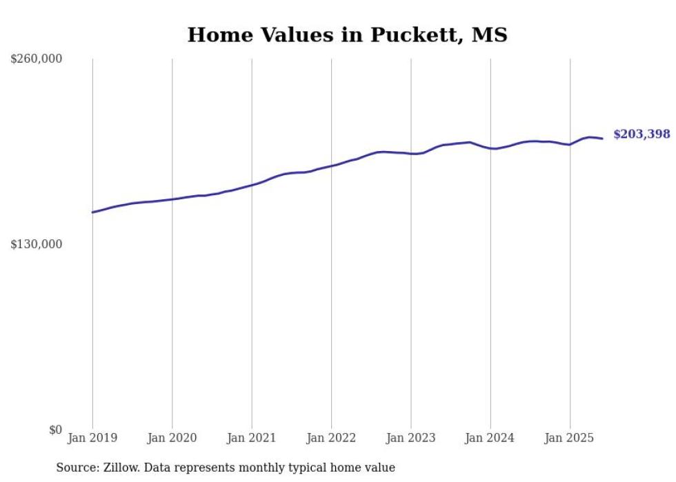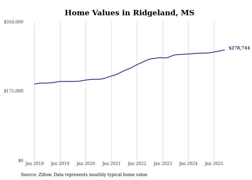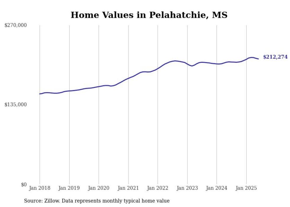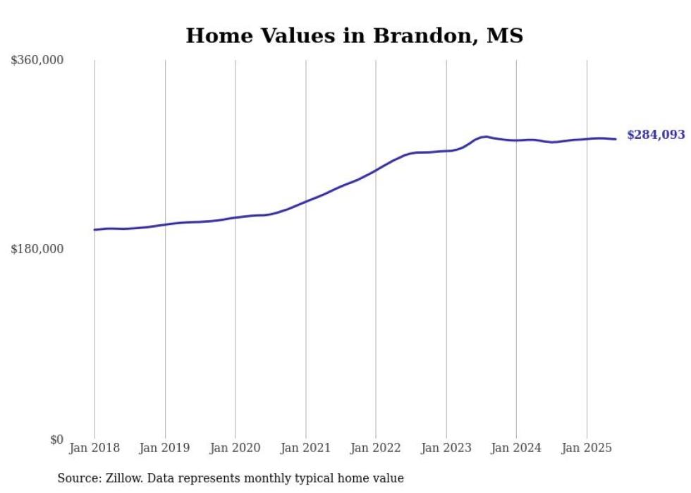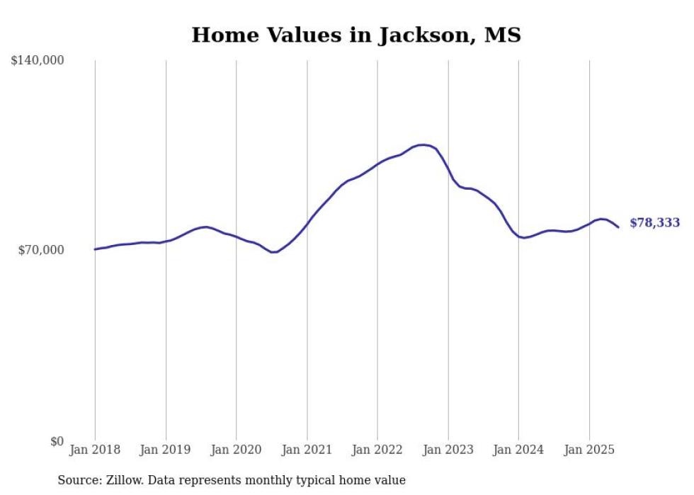 Stacker compiled a list of cities with the most expensive homes in the Jackson, MS metro area using data from Zillow. Charts show the monthly typical home value since January 2018.