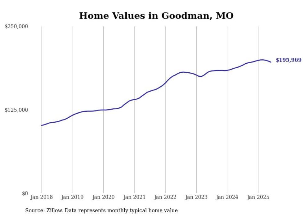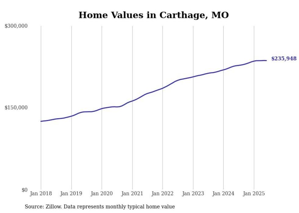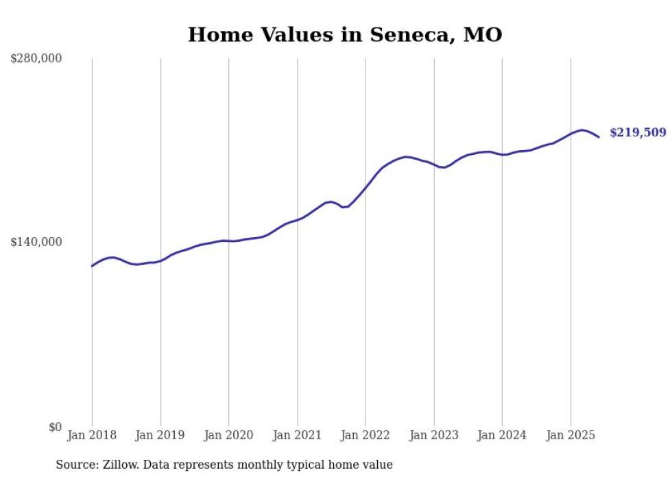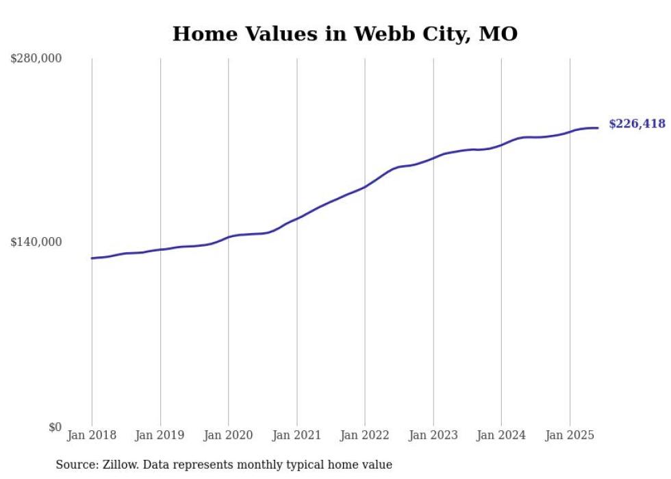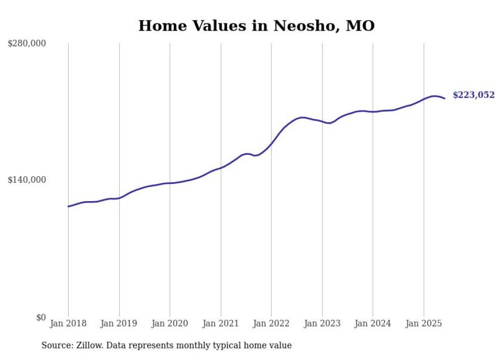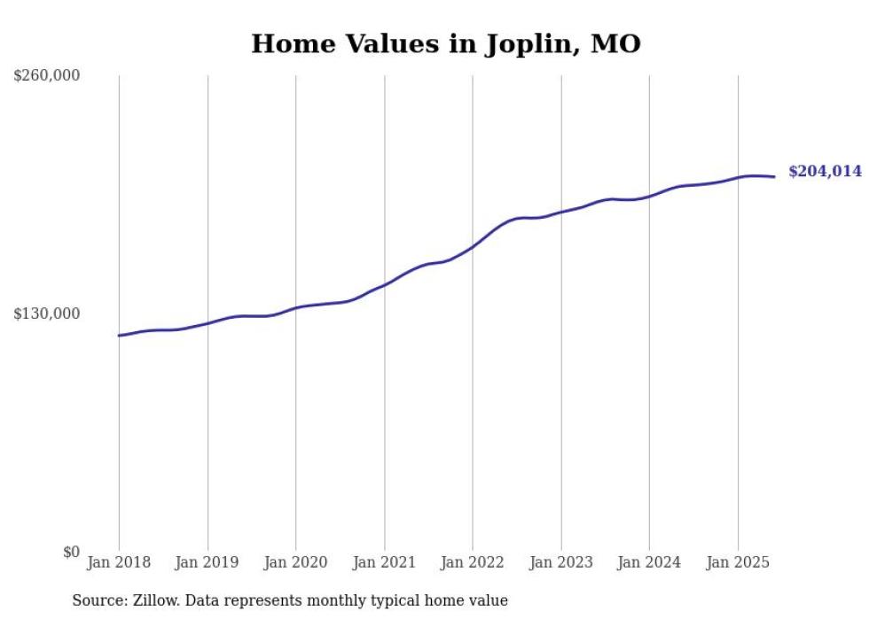 Stacker compiled a list of cities with the most expensive homes in the Joplin, MO metro area using data from Zillow. Charts show the monthly typical home value since January 2018.