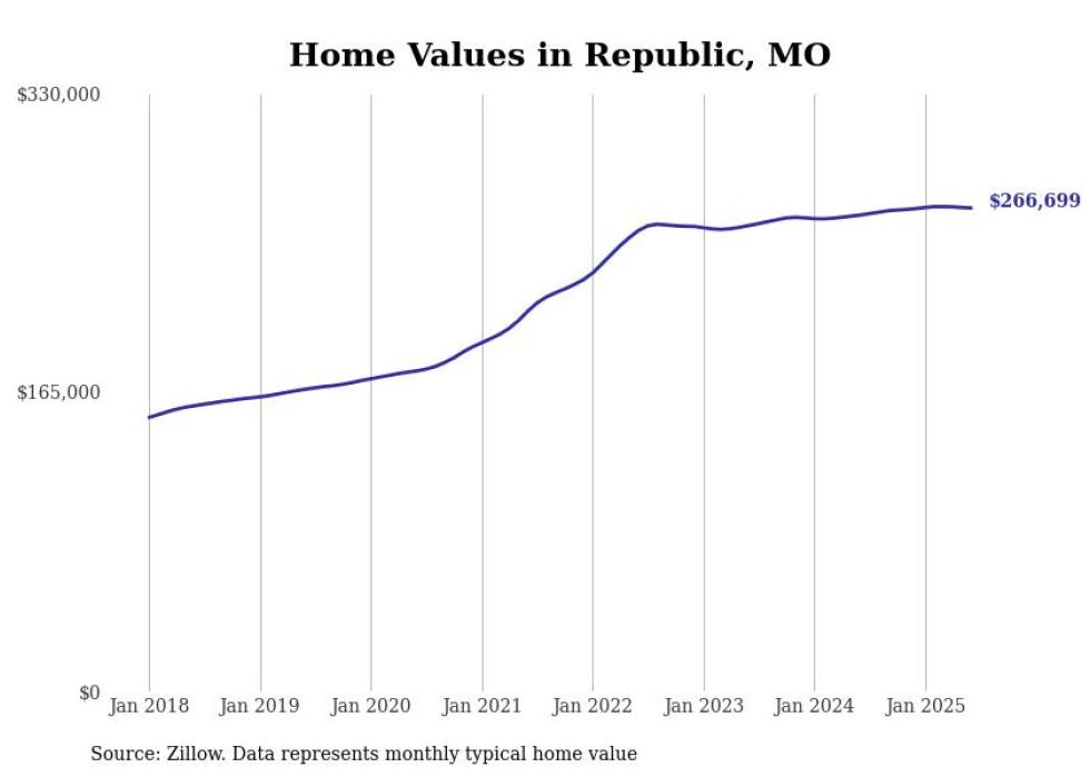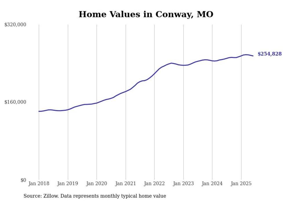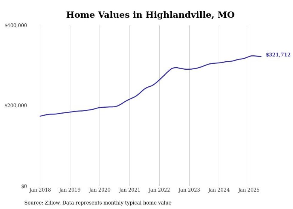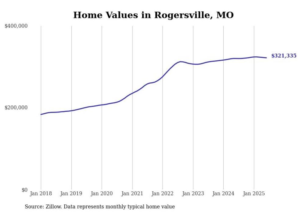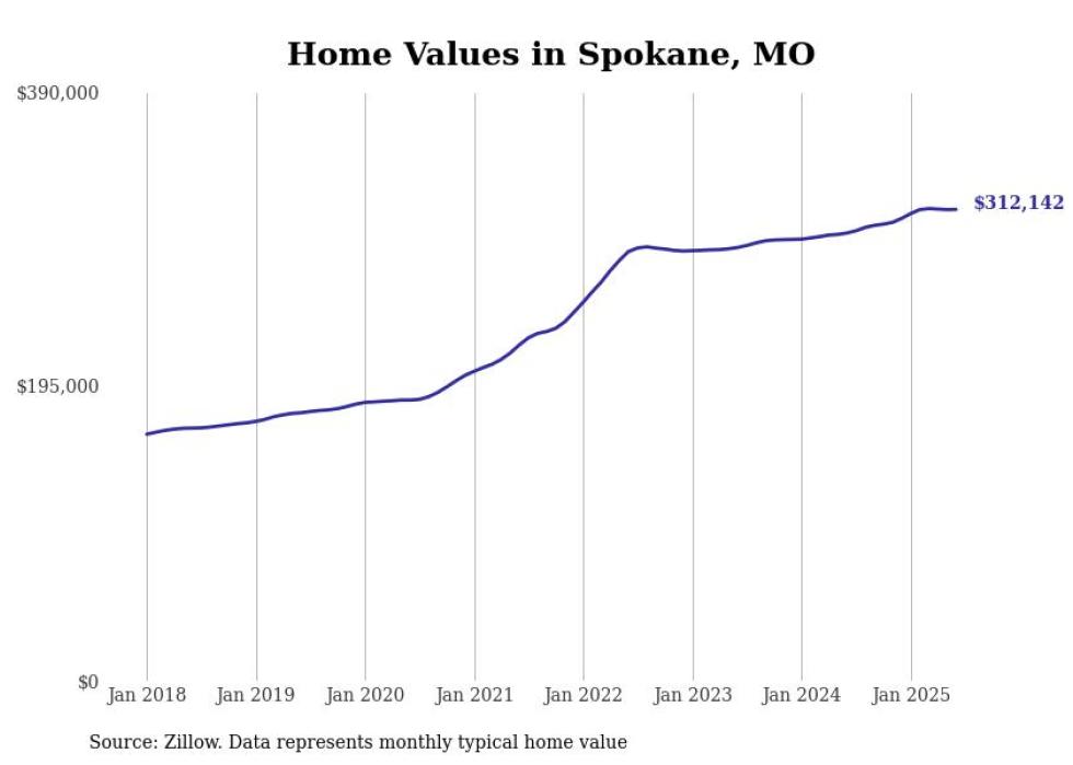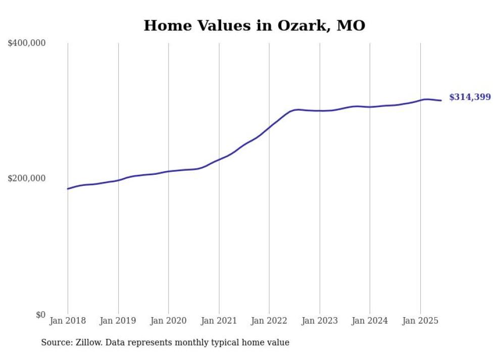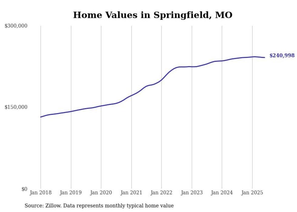 Stacker compiled a list of cities with the most expensive homes in the Springfield, MO metro area using data from Zillow. Charts show the monthly typical home value since January 2018.