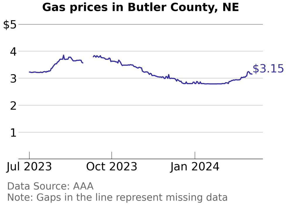 Stacker compiled statistics on gas prices in Butler County using data from AAA. Gas prices are current as of March 11.