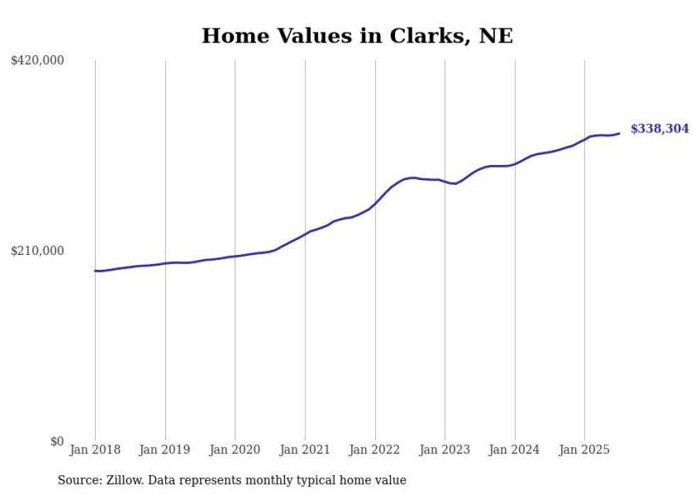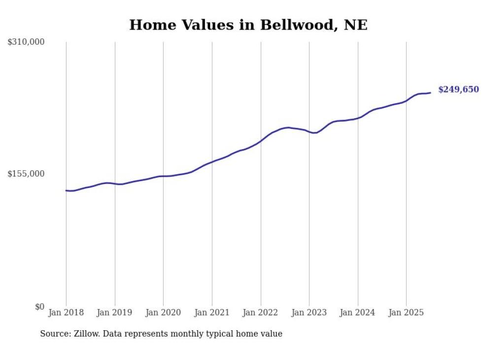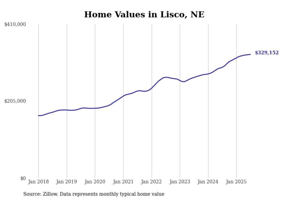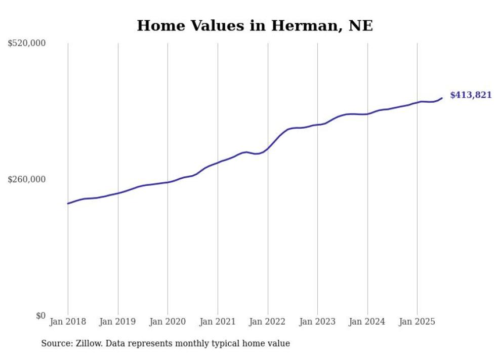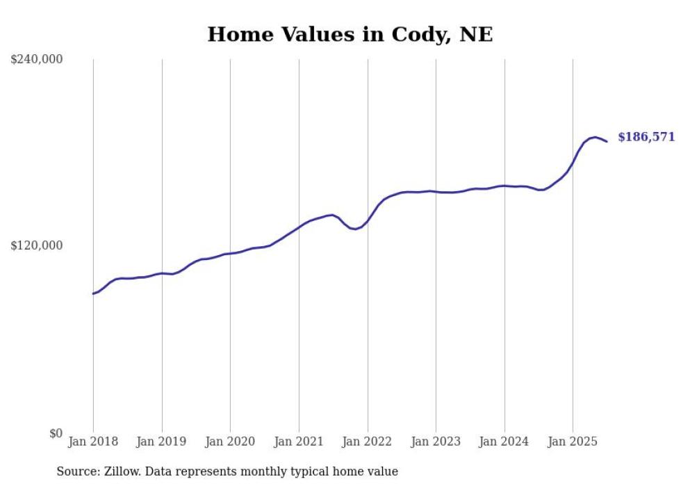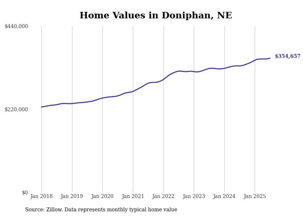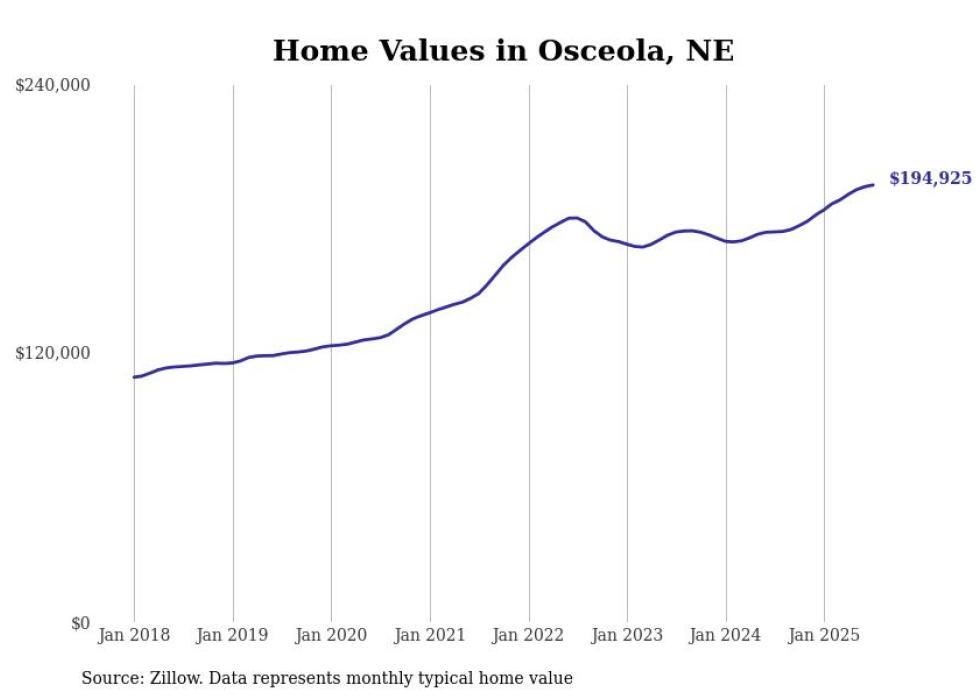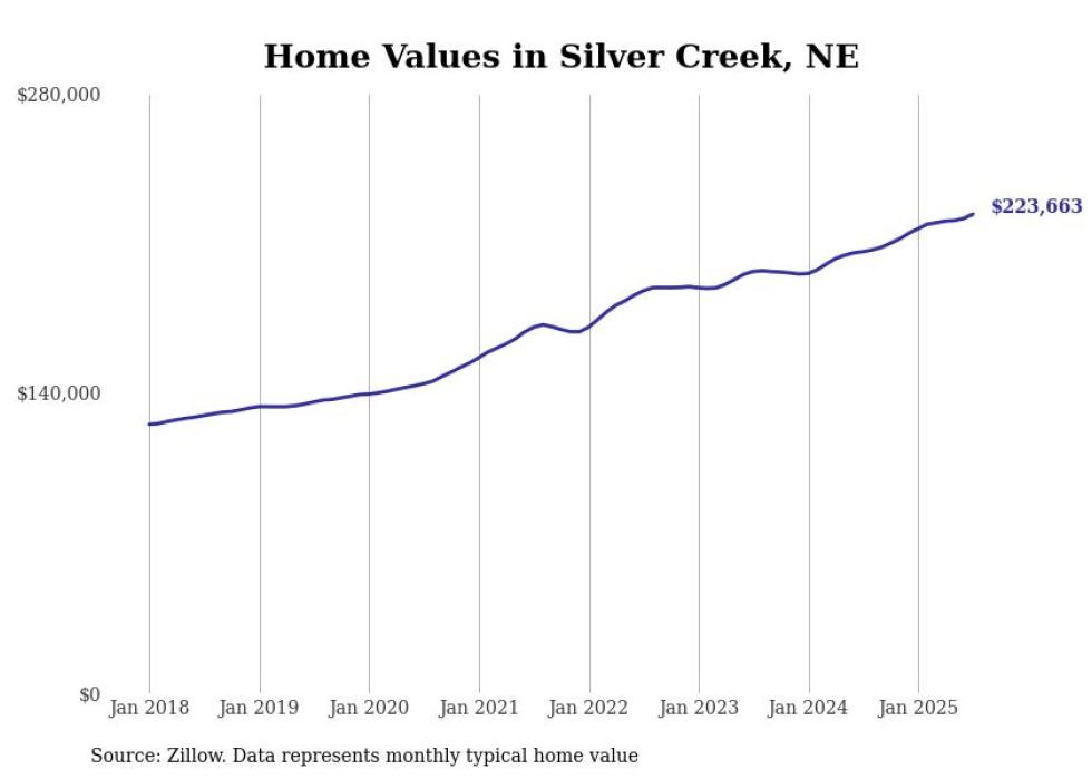 Stacker compiled a list of cities with the fastest-growing home prices in Nebraska using data from Zillow. Cities are ranked by the dollar change in the Zillow Home Values Index for all homes from the 12 months ending July 2025. The charts in this story were created automatically using Matplotlib. Data was available for 50 cities and towns in Nebraska.