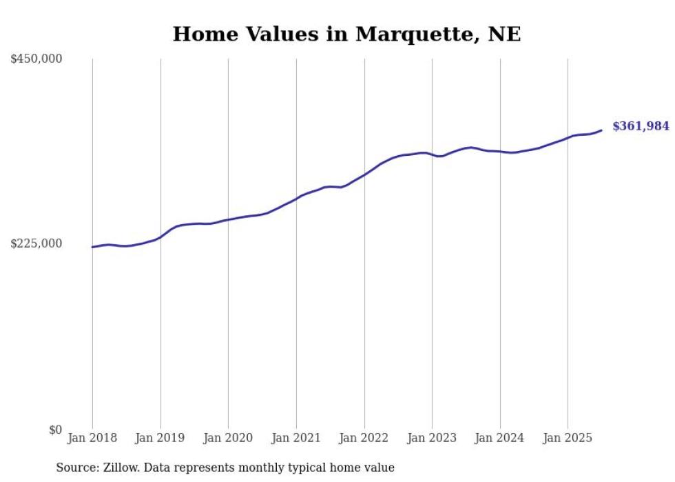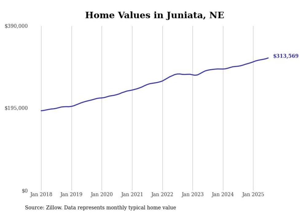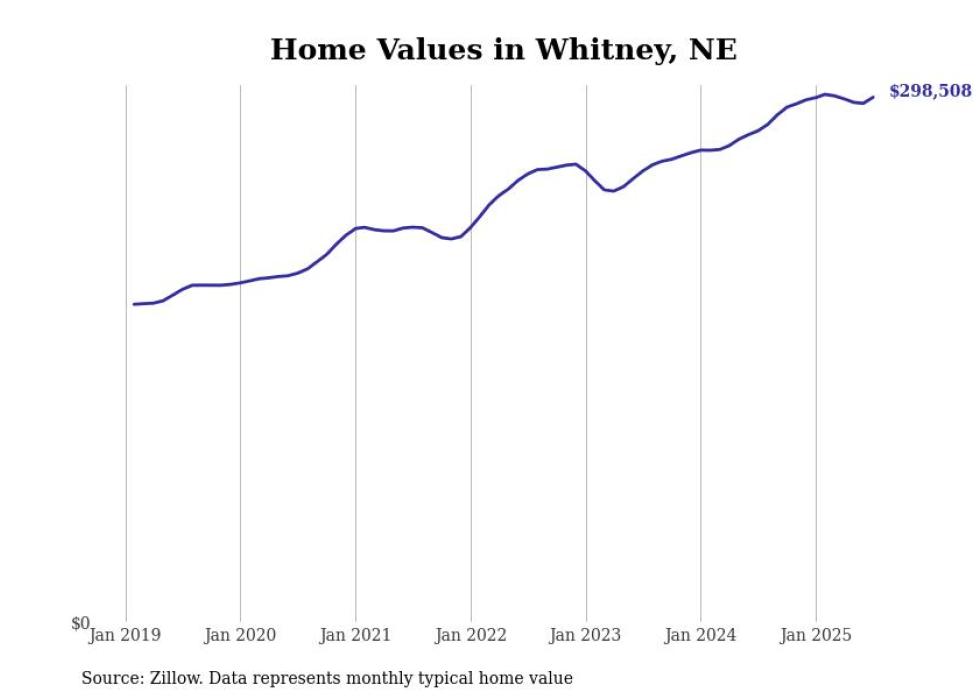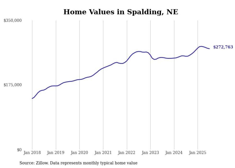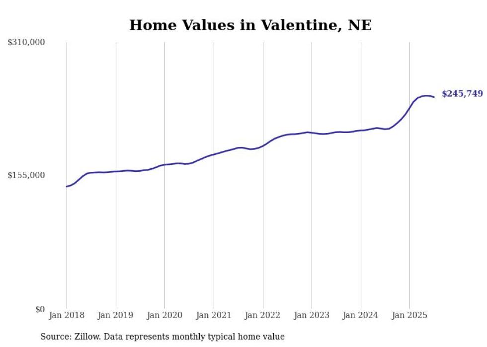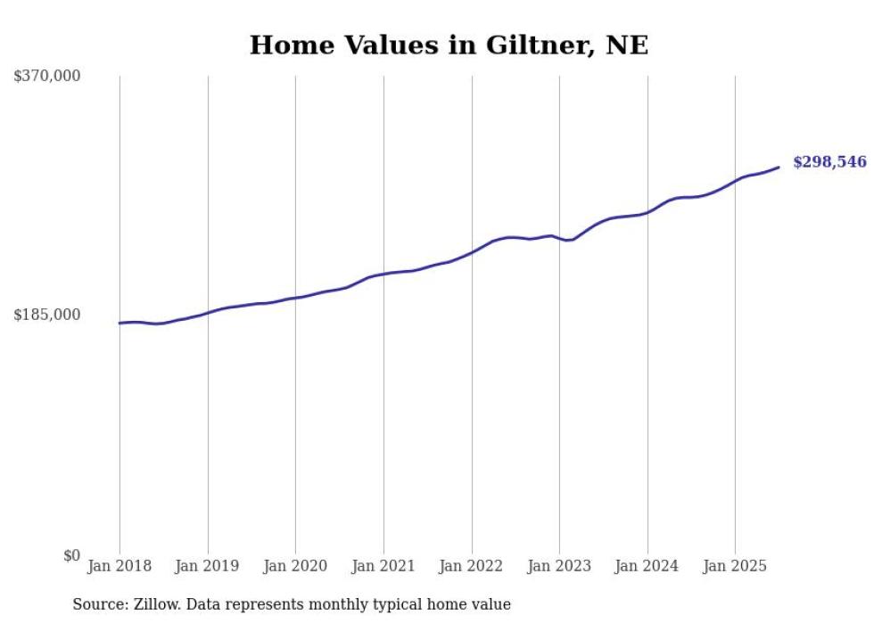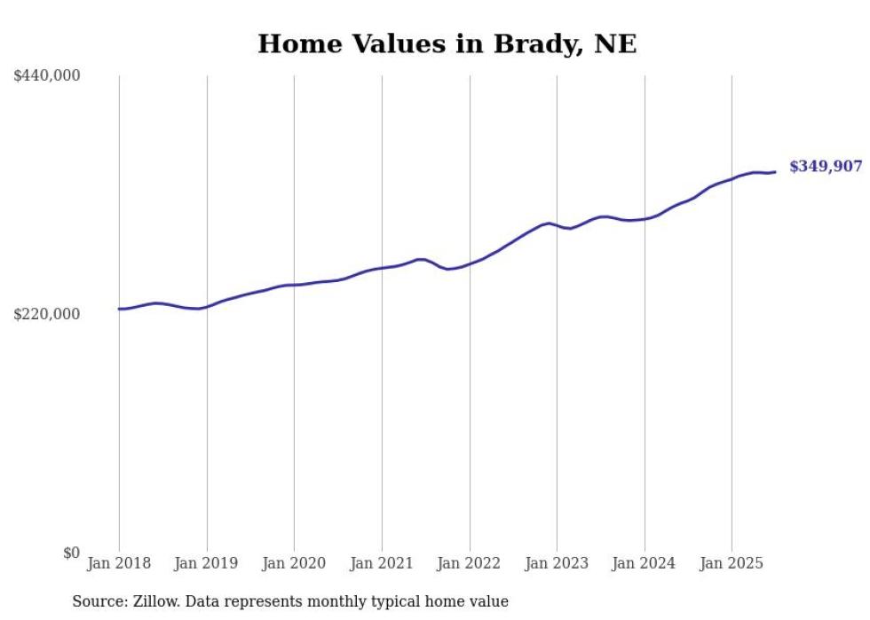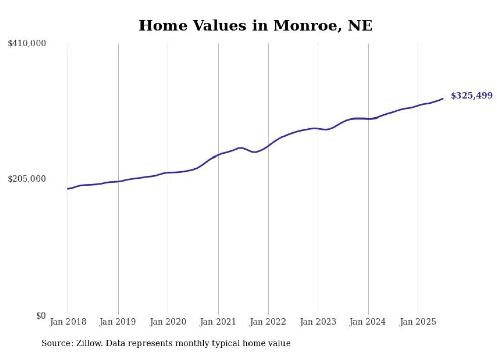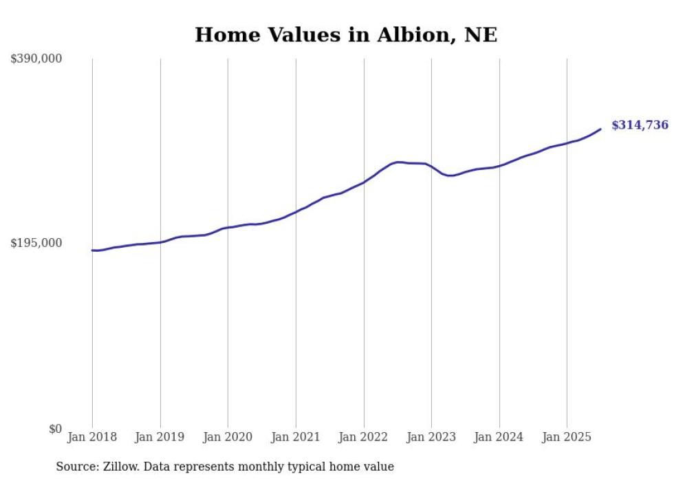 Stacker compiled a list of cities with the fastest-growing home prices in Nebraska using data from Zillow. Cities are ranked by the dollar change in the Zillow Home Values Index for all homes from the 12 months ending July 2025. The charts in this story were created automatically using Matplotlib. Data was available for 50 cities and towns in Nebraska.