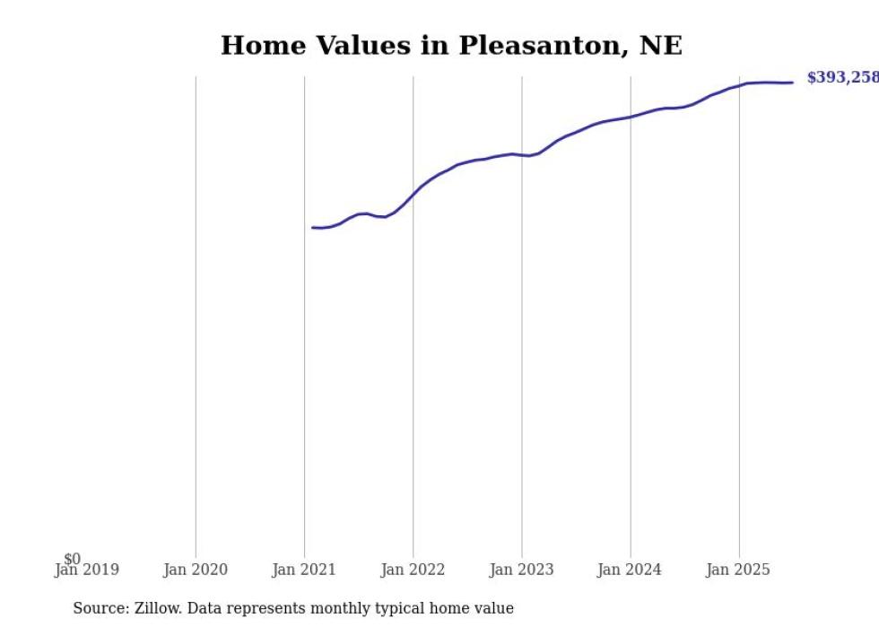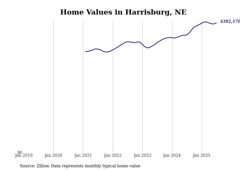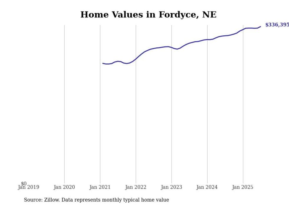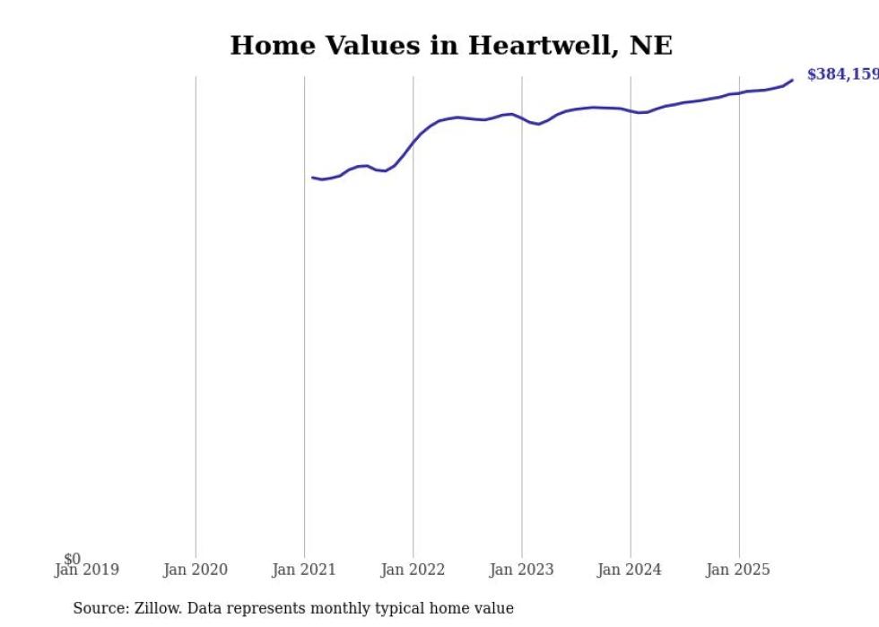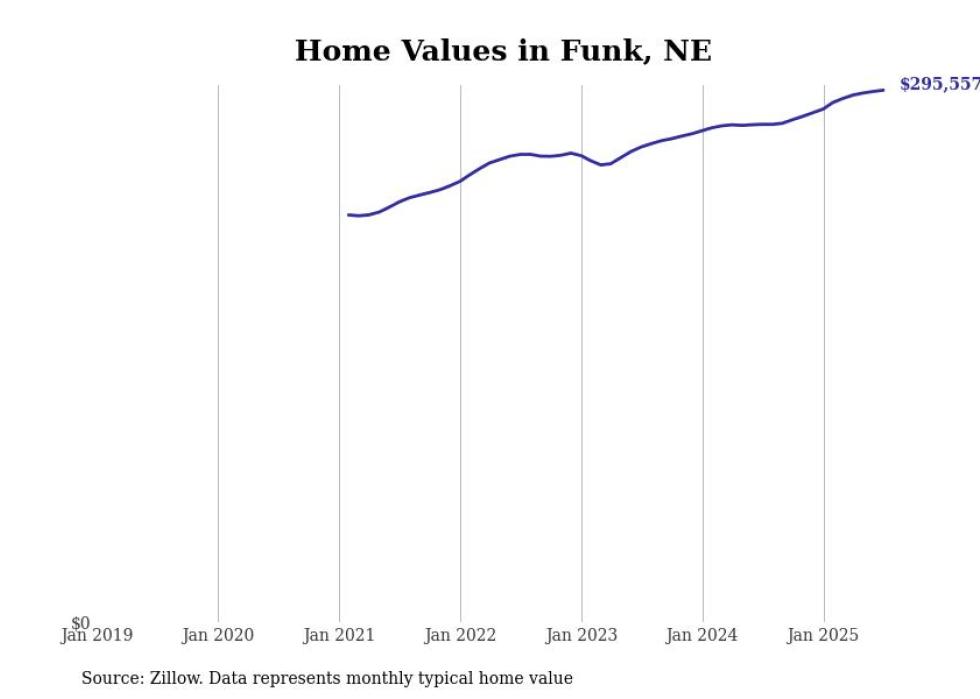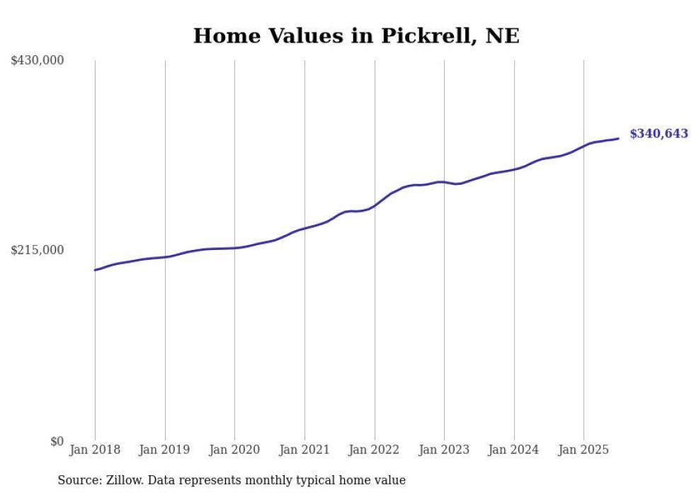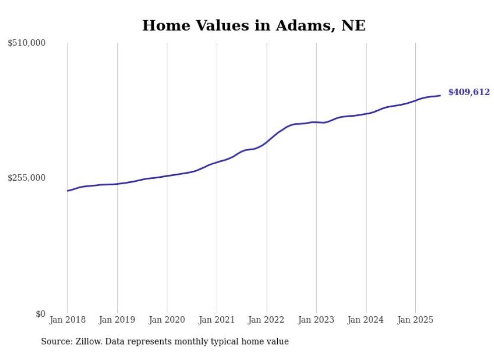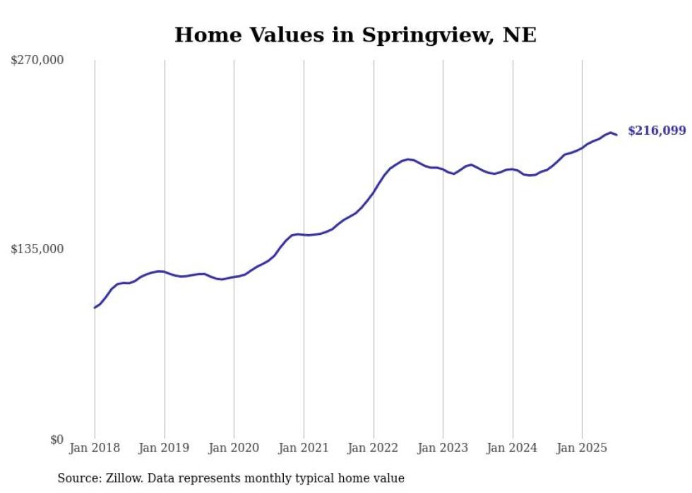 Stacker compiled a list of cities with the fastest-growing home prices in Nebraska using data from Zillow. Cities are ranked by the dollar change in the Zillow Home Values Index for all homes from the 12 months ending July 2025. The charts in this story were created automatically using Matplotlib. Data was available for 50 cities and towns in Nebraska.